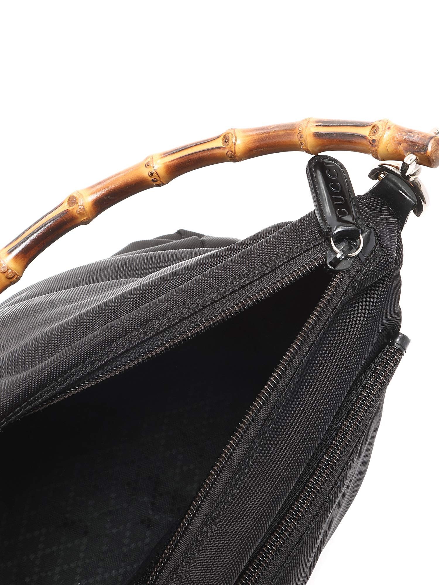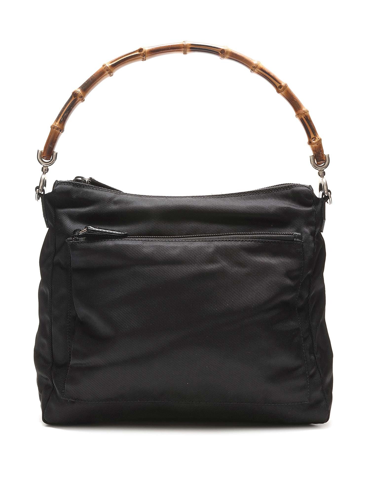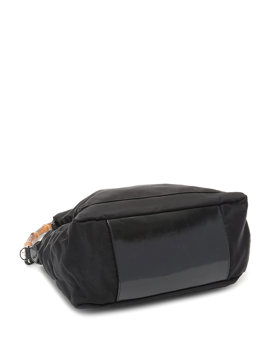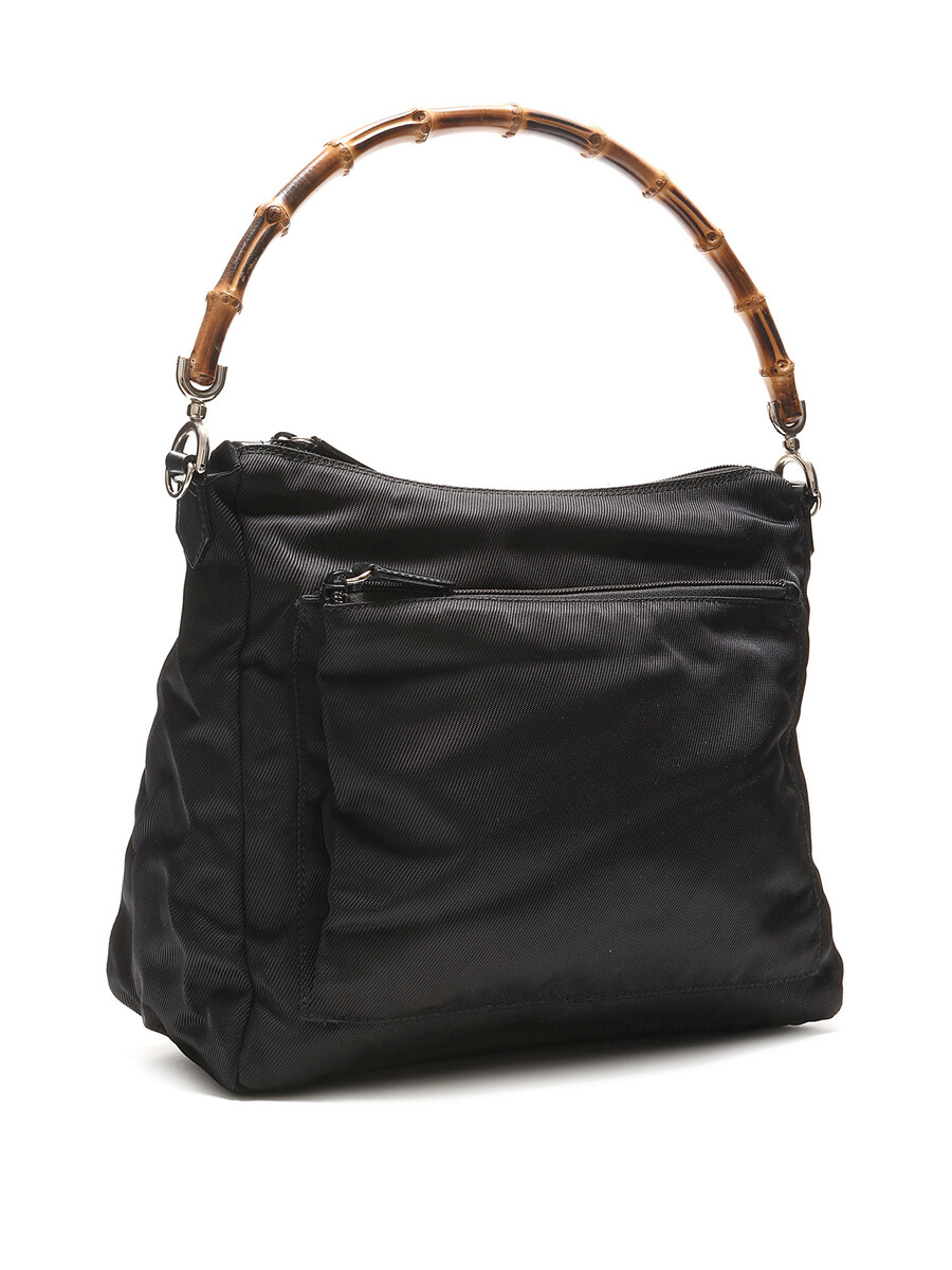 Canvas shoulder bag in black with bamboo handle and silver-tone hardware. Zipper closure. Detachable leather shoulder strap. Leather trims.