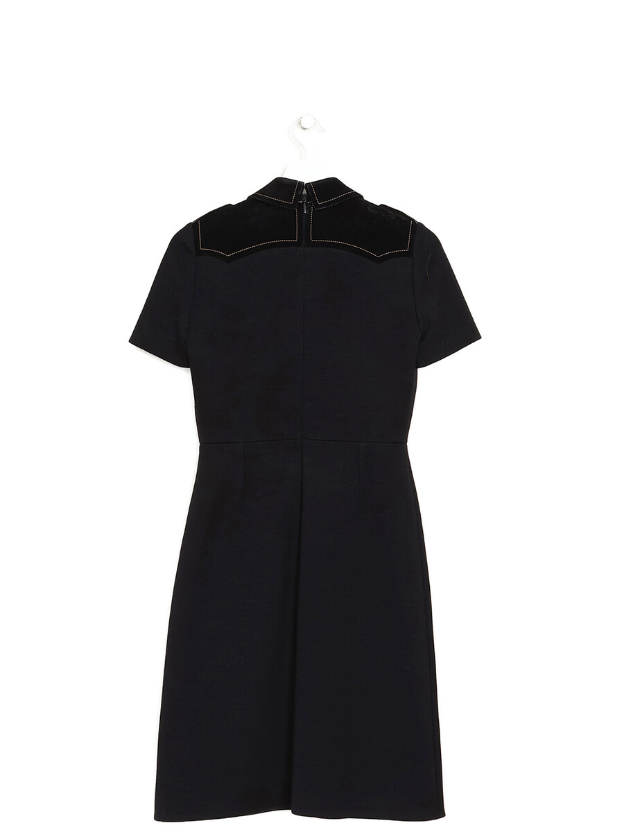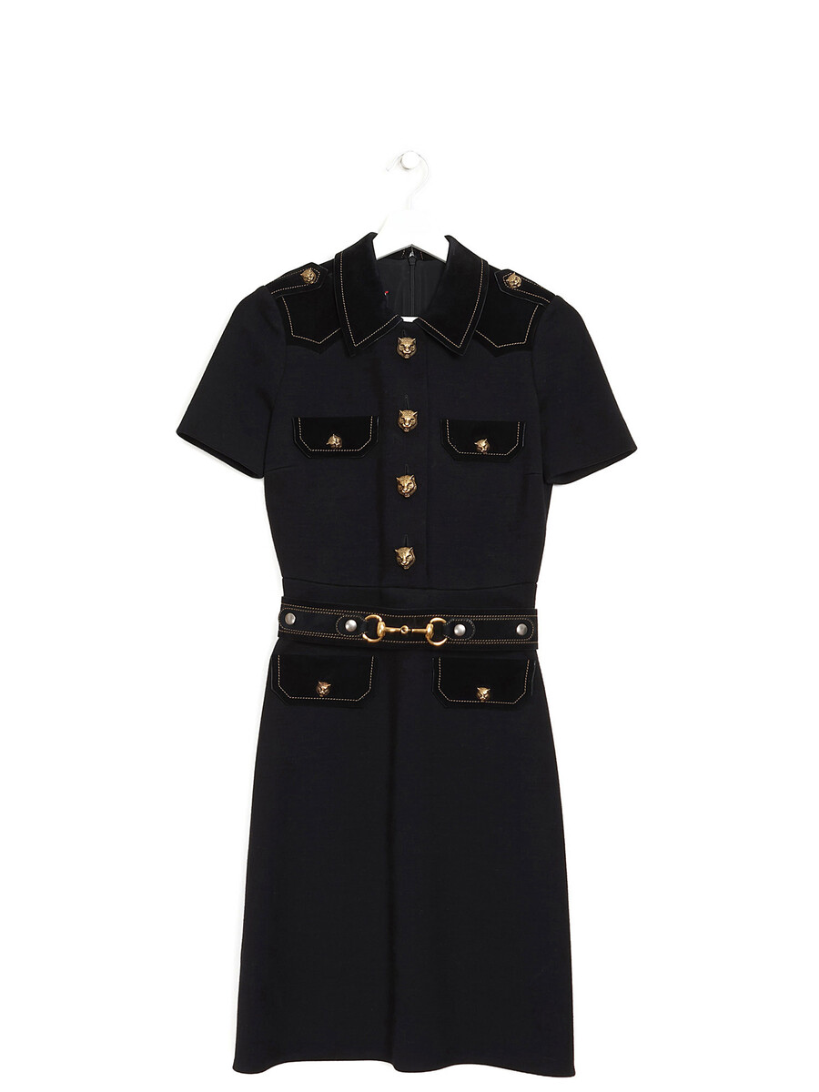 Short sleeve wool dress in black featuring decorative animal motif buttons. Patch pockets with flaps and decorative front buttons.