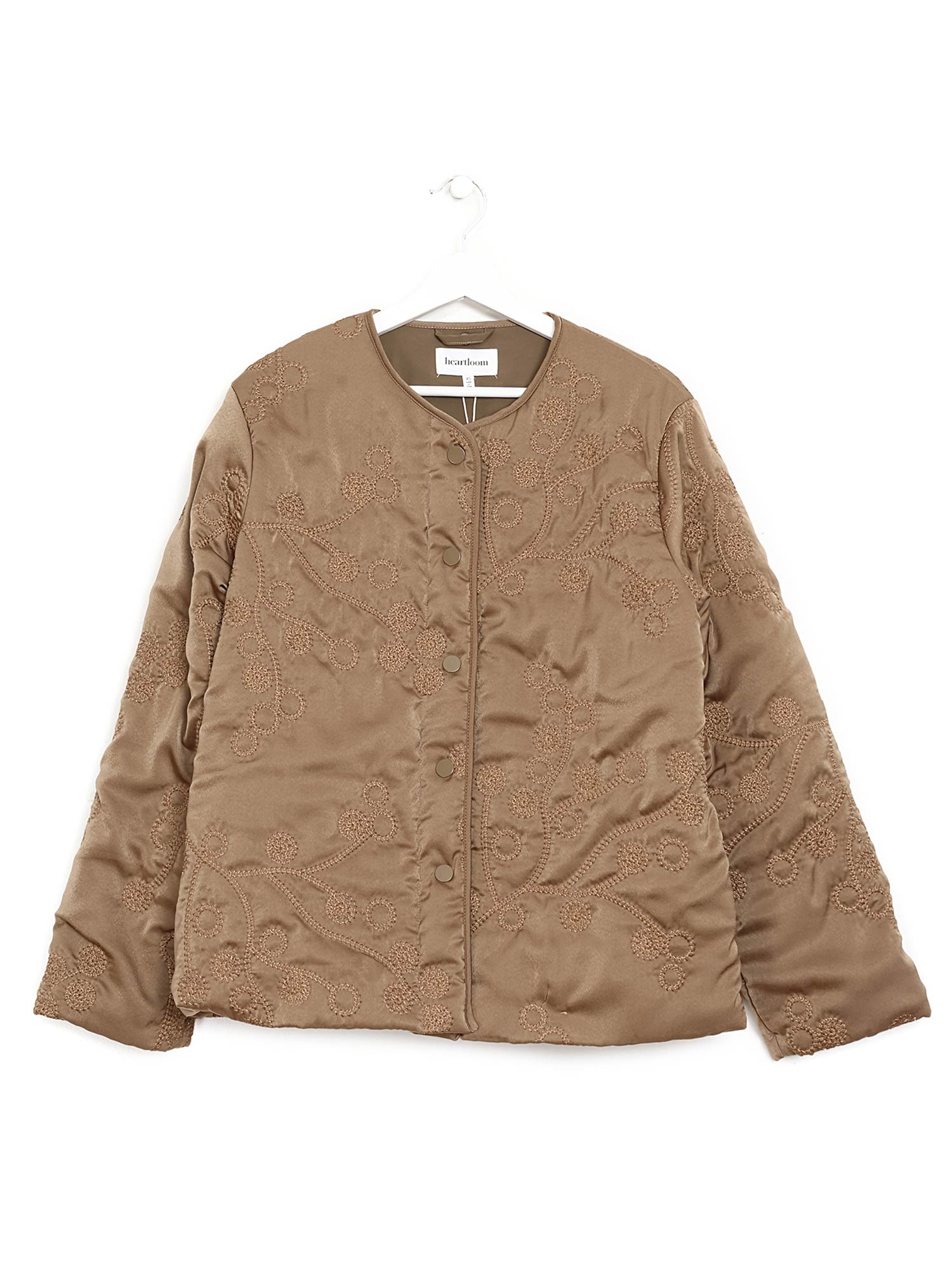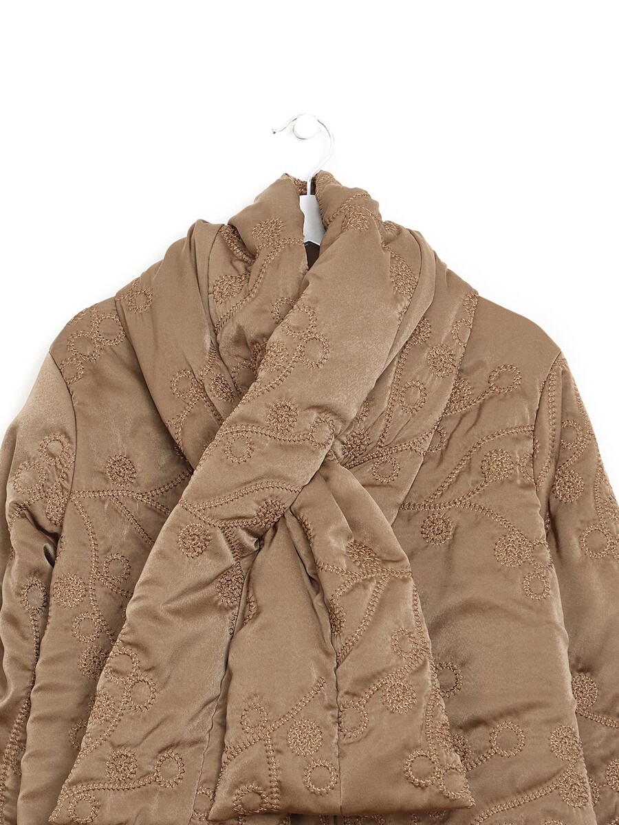 Scarf integrated jacket in green. Featuring an innovative design with an attached scarf for added versatility and style.