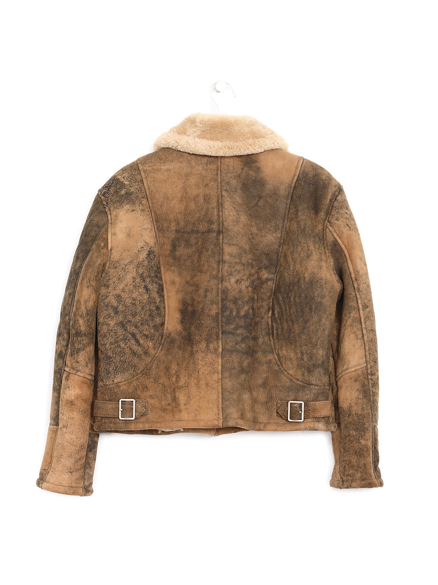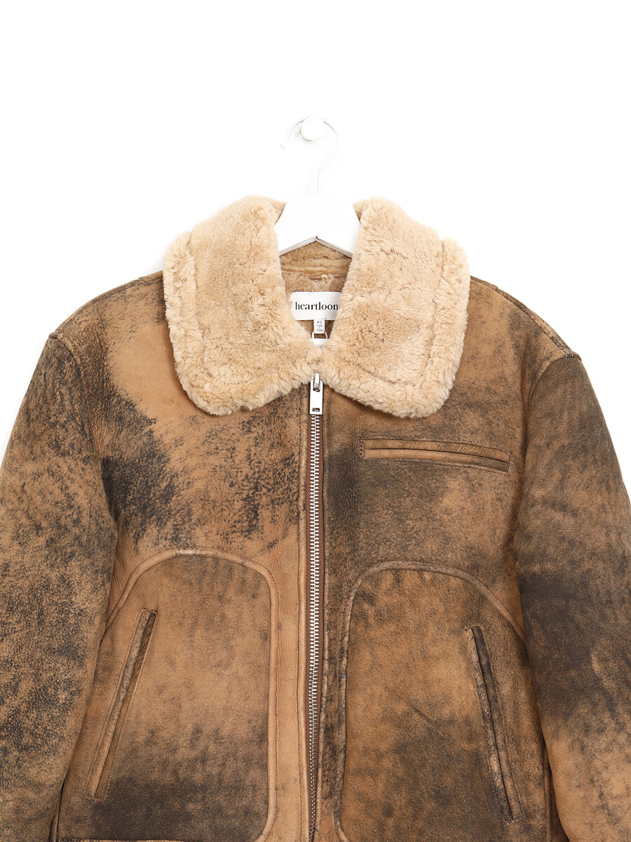 Brown shearling jacket featuring a cozy texture. The design sports a wide lapel collar.