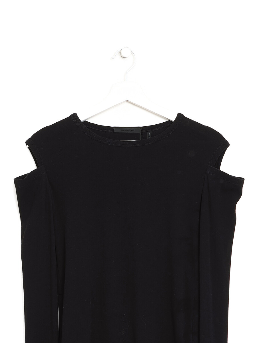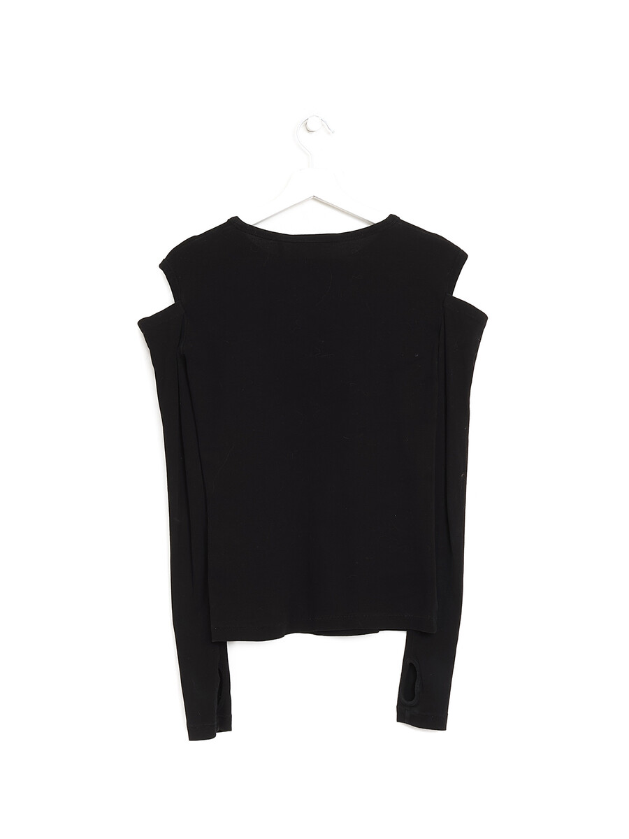 Long sleeve black t-shirt featuring shoulder cutouts. Round collar.