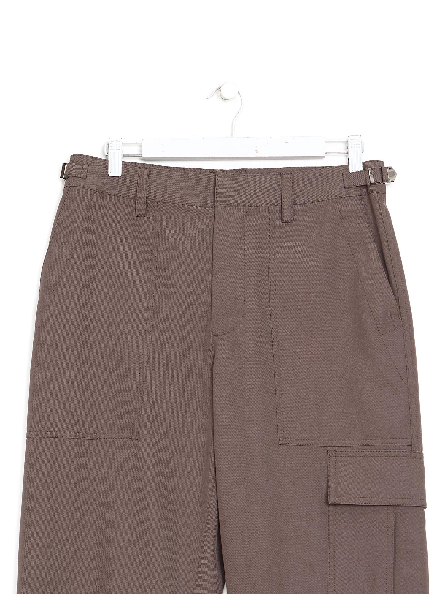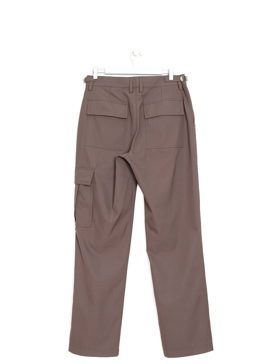 Cargo-style straight leg pants in brown. Concealed closure. Features multiple pockets.