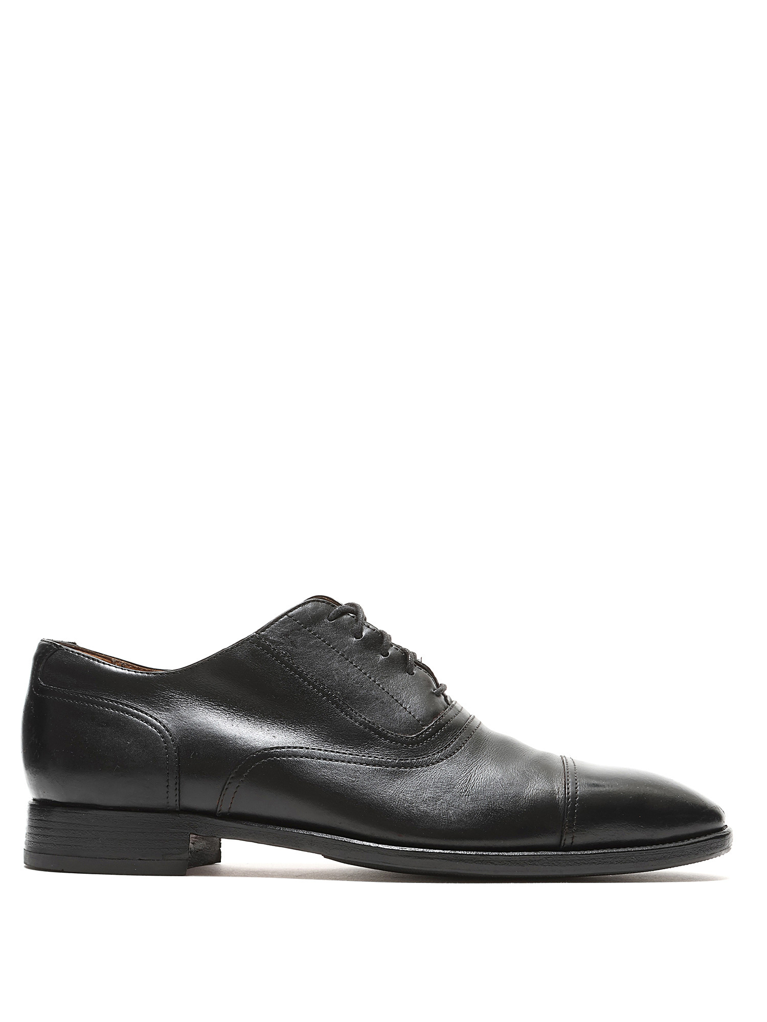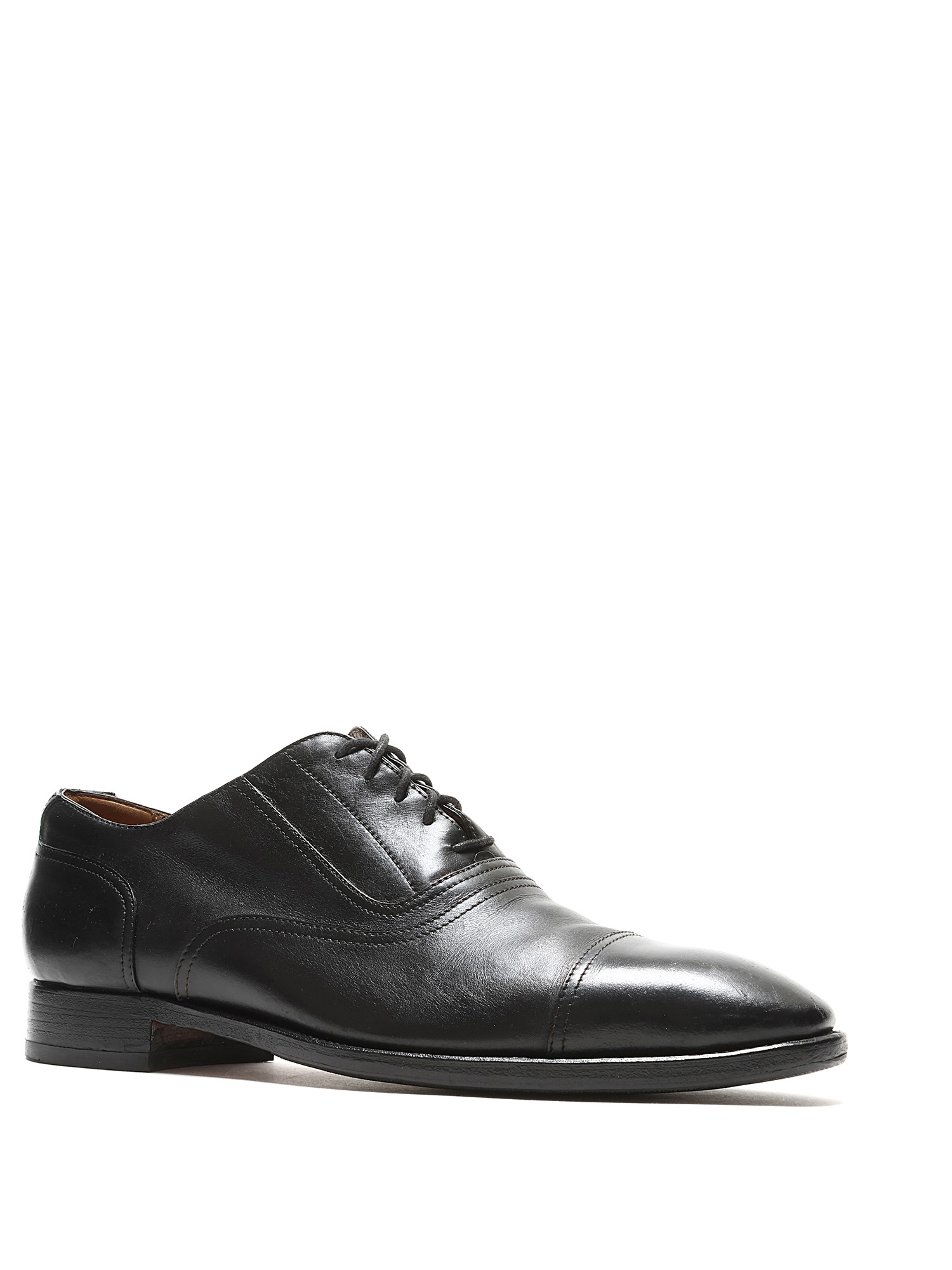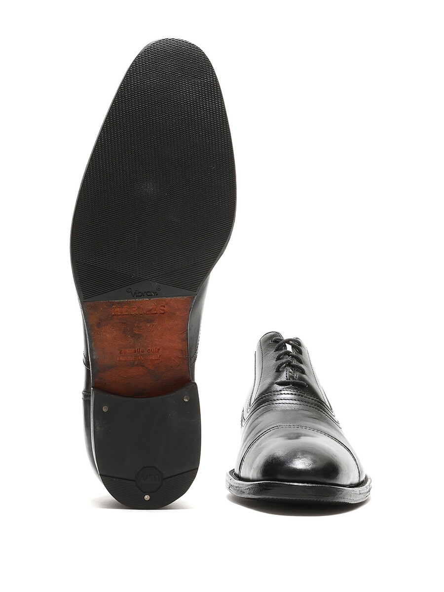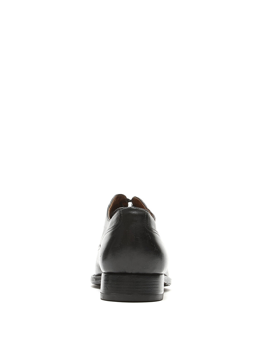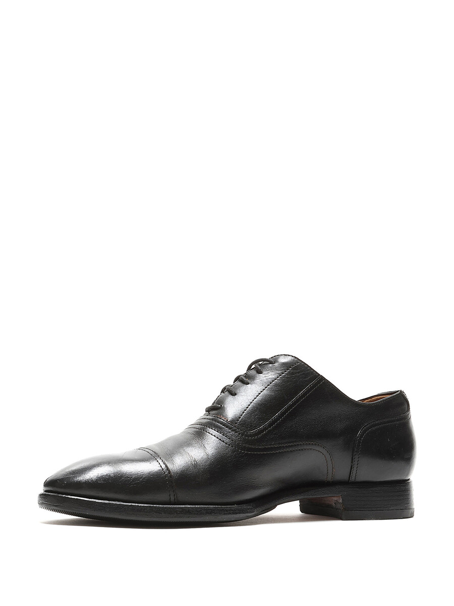 Grained leather oxford shoes in black. Lace-up closure with closed pointed toe. Leather sole.