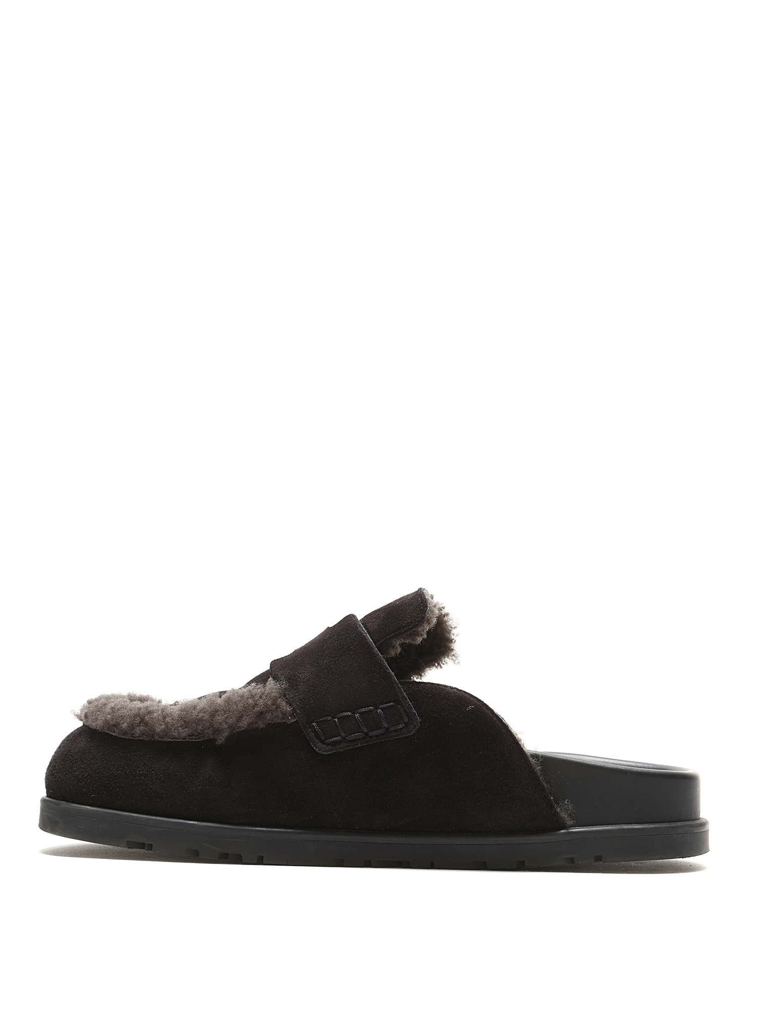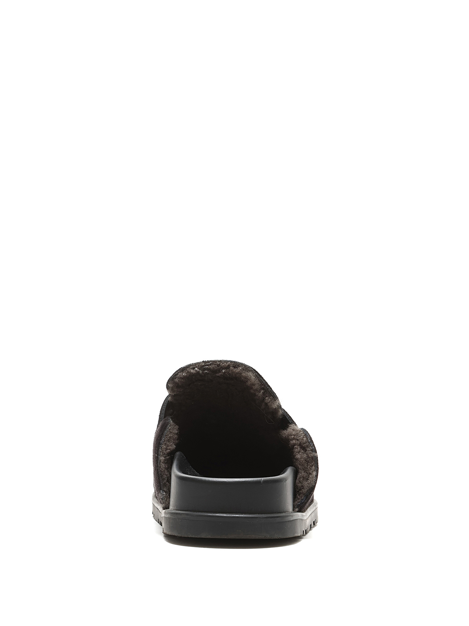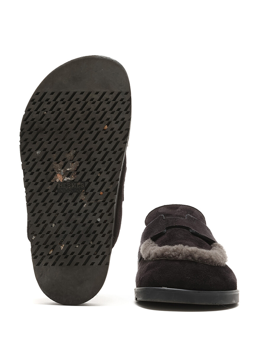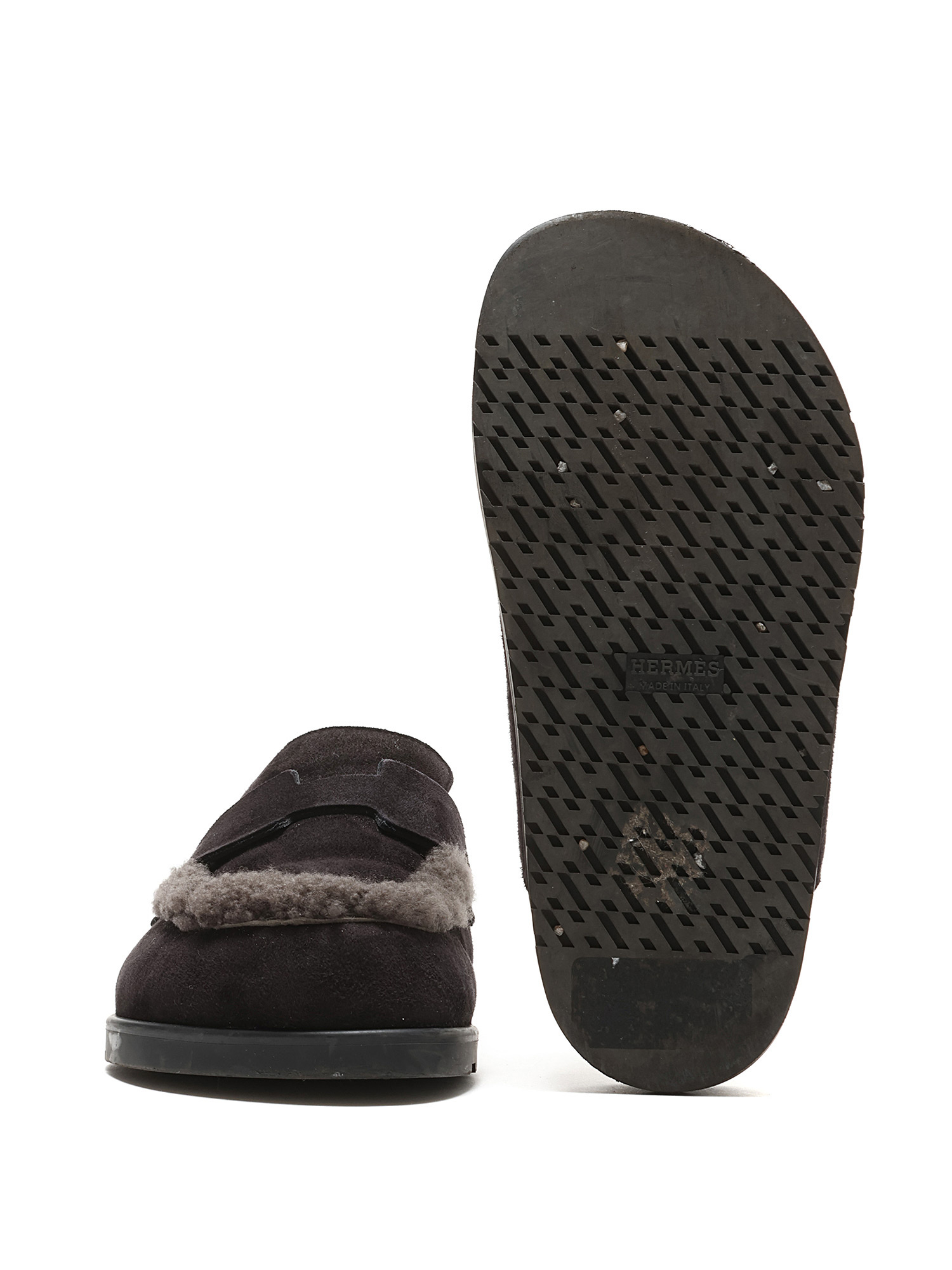 Suede mule slippers with black shearling trim. Closed round toe. Signature 'H' embellishment at vamp. Flat rubber sole. Comes with box.