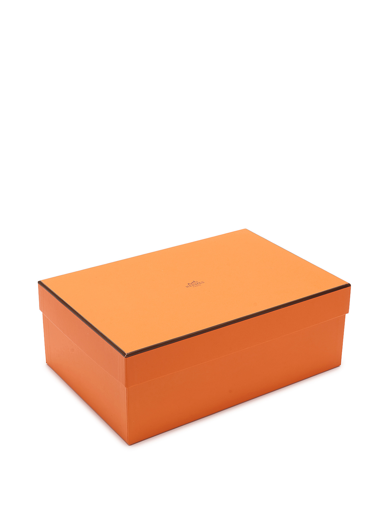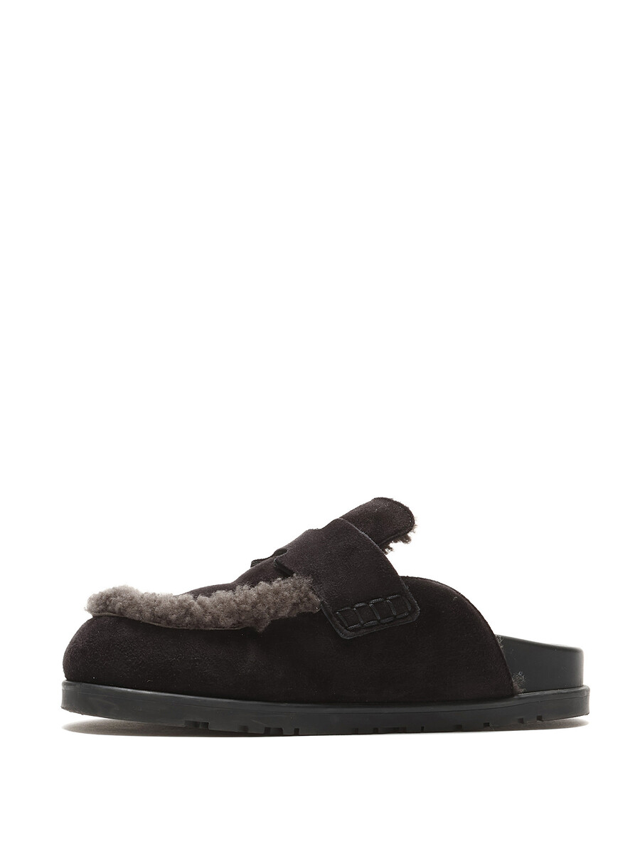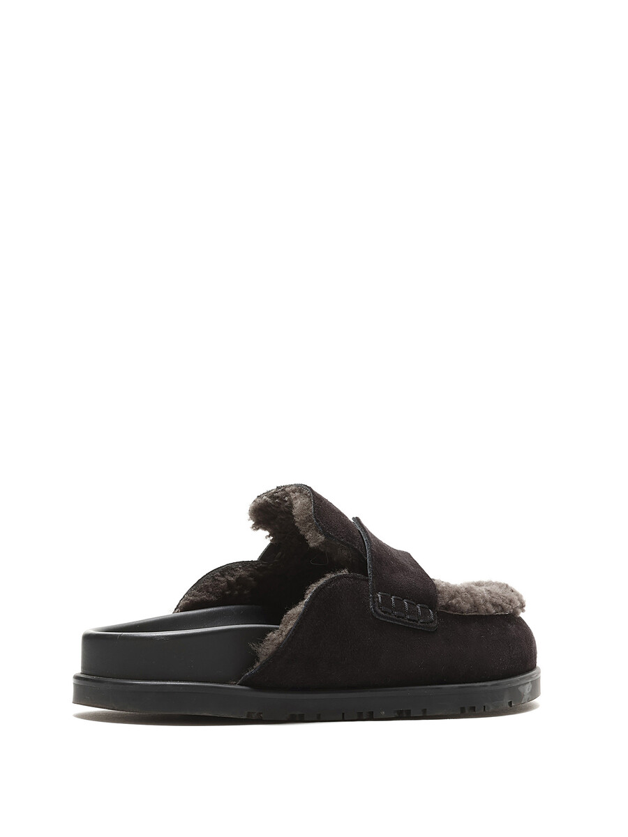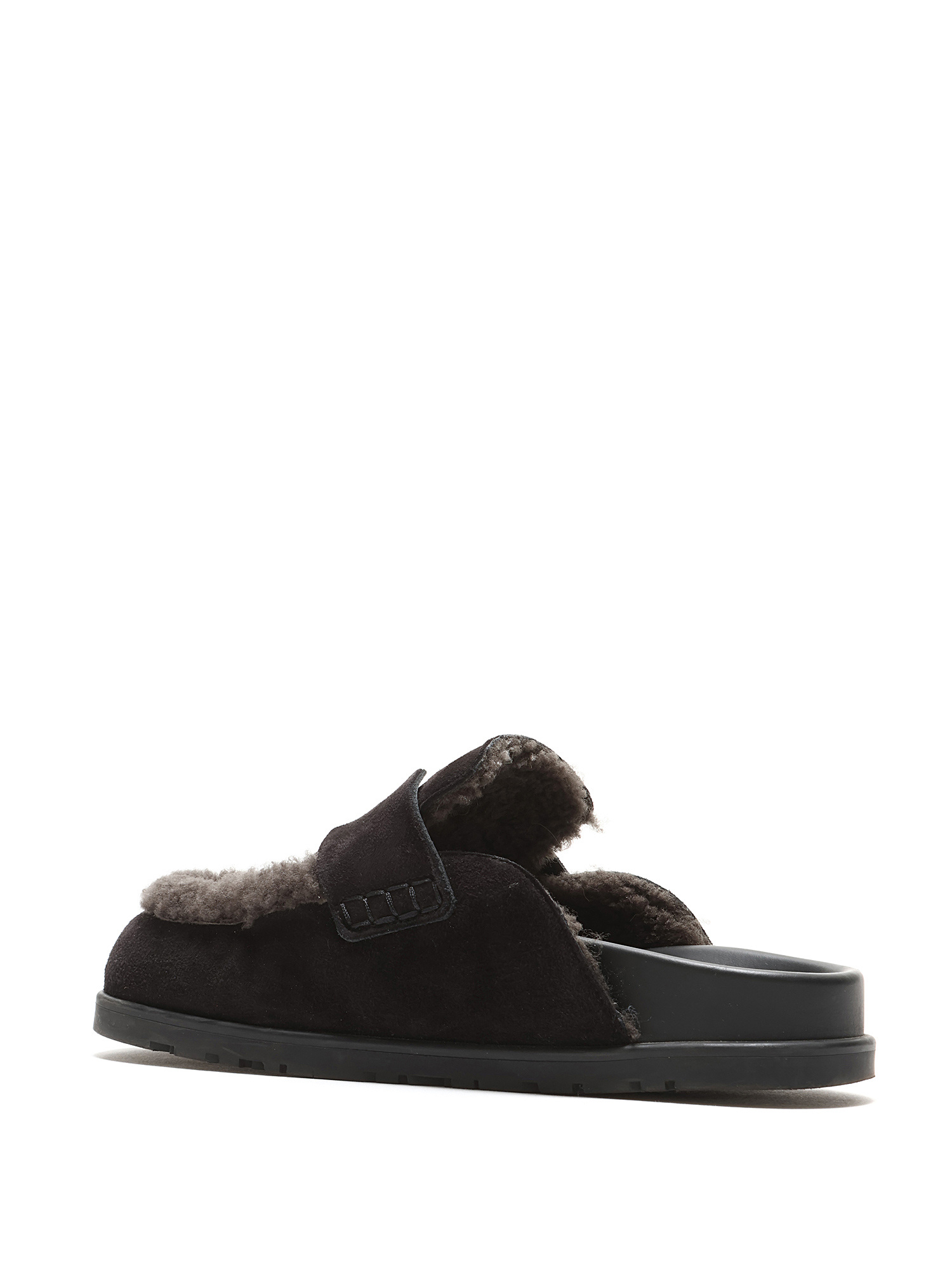Suede mule slippers with black shearling trim. Closed round toe. Signature 'H' embellishment at vamp. Flat rubber sole. Comes with box.