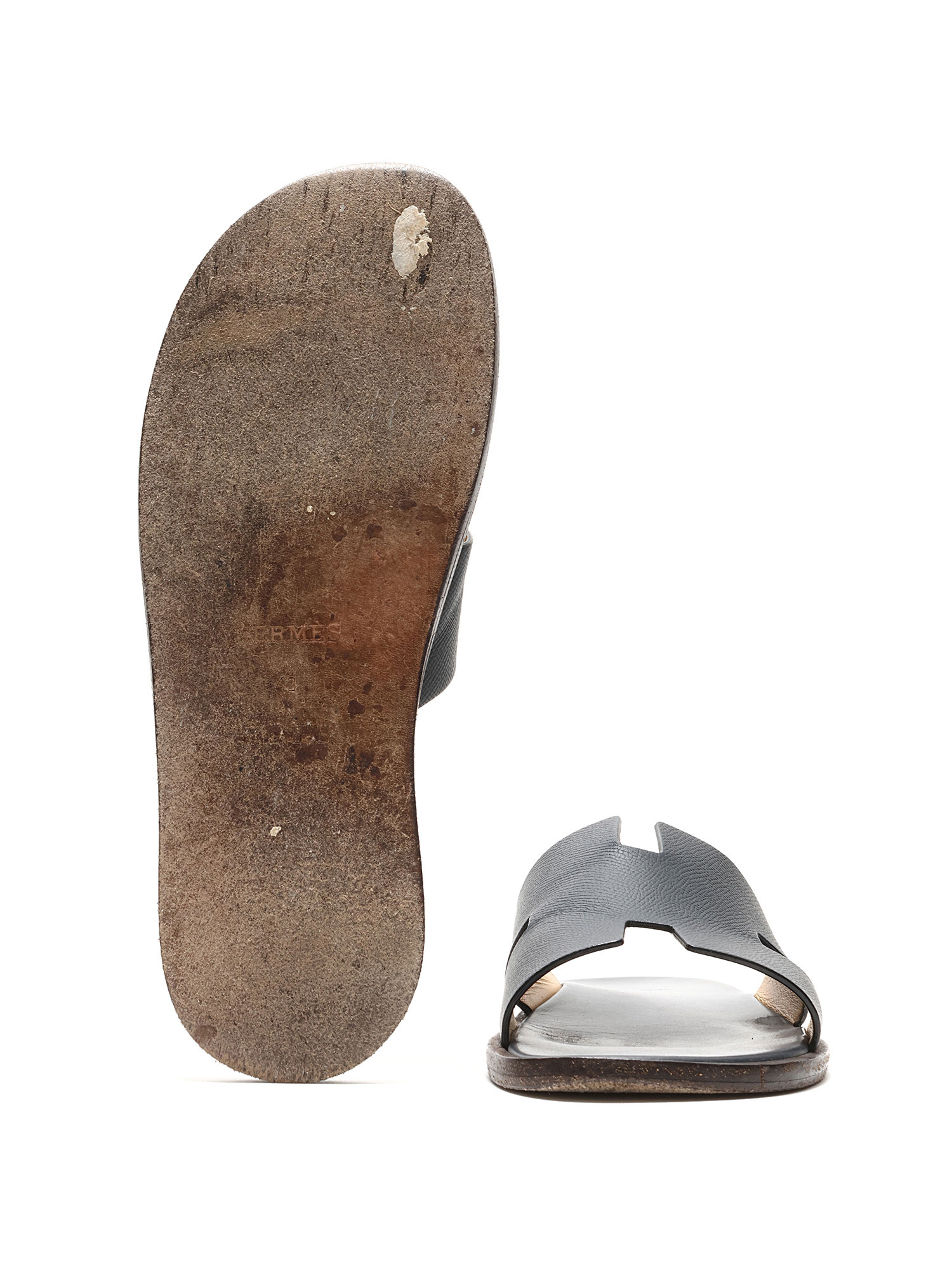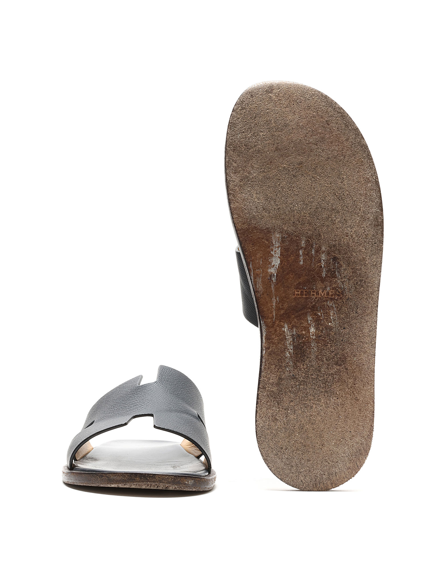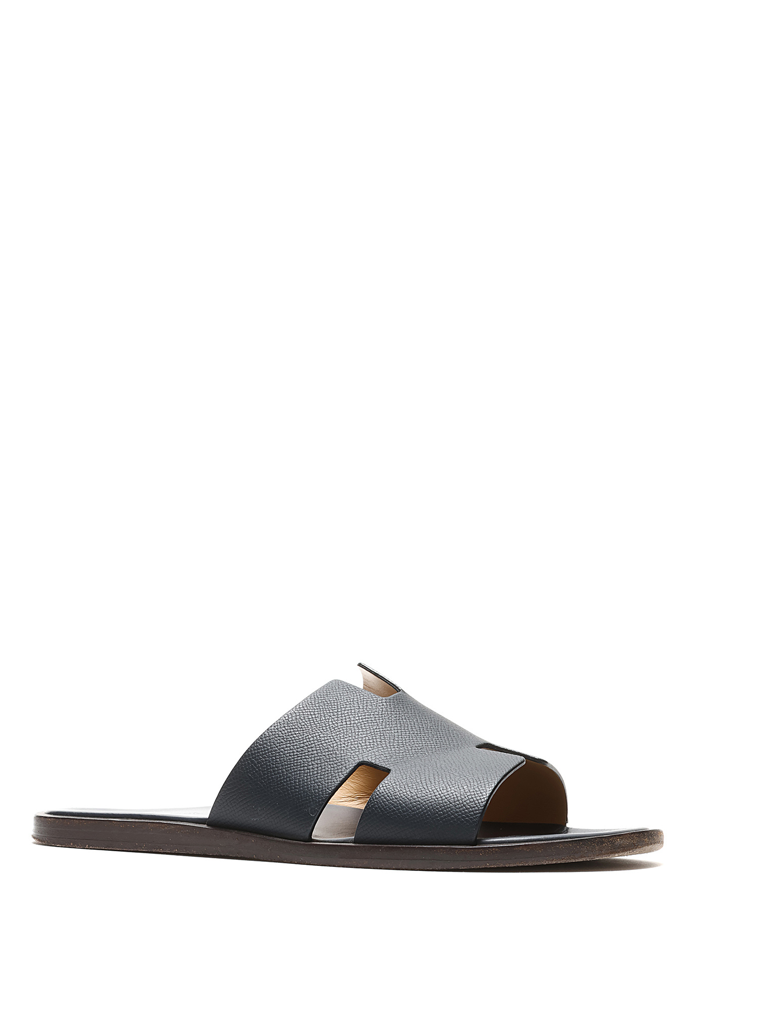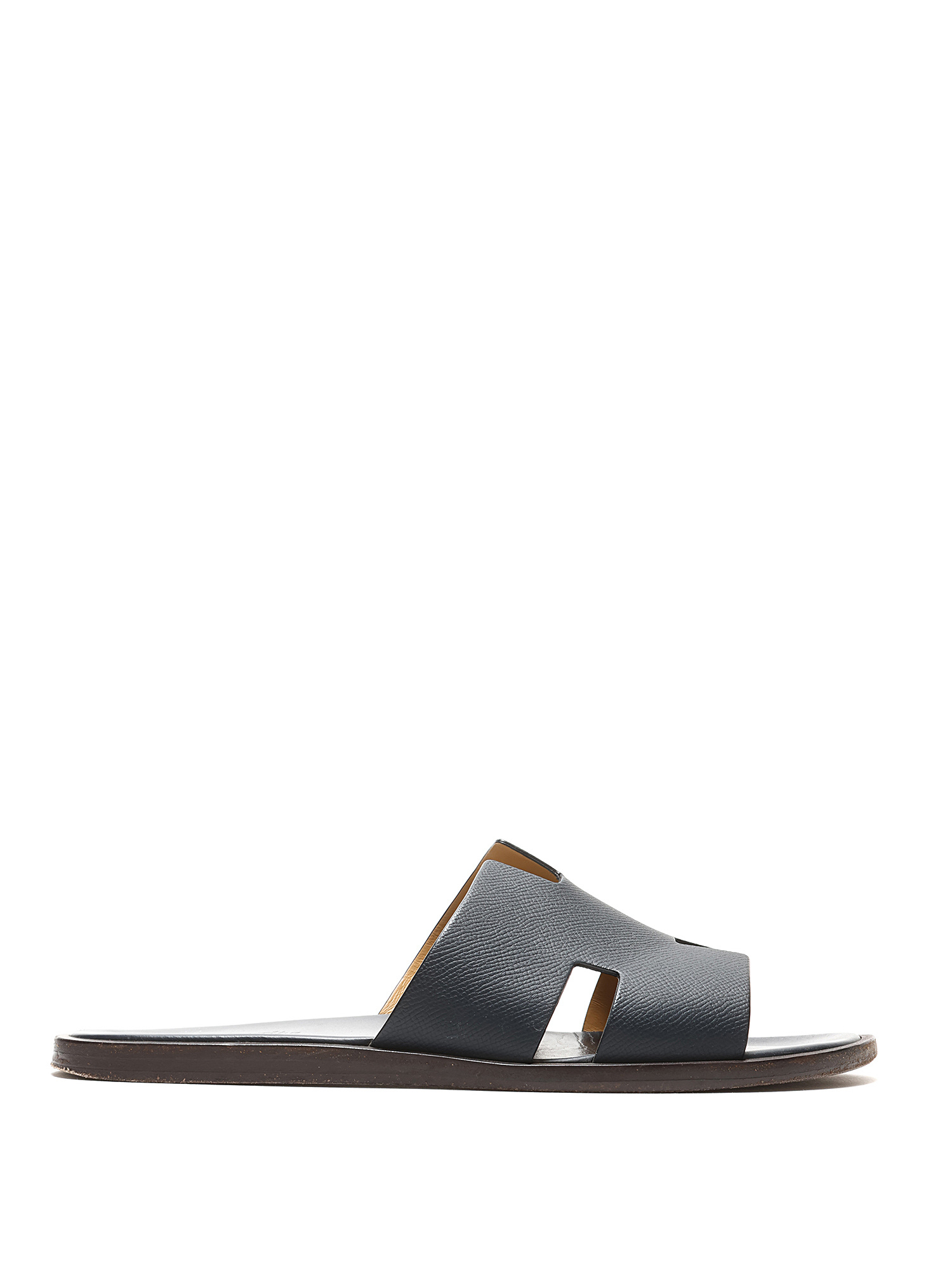 Leather slip-on sandals featuring logo motif. Leather sole.