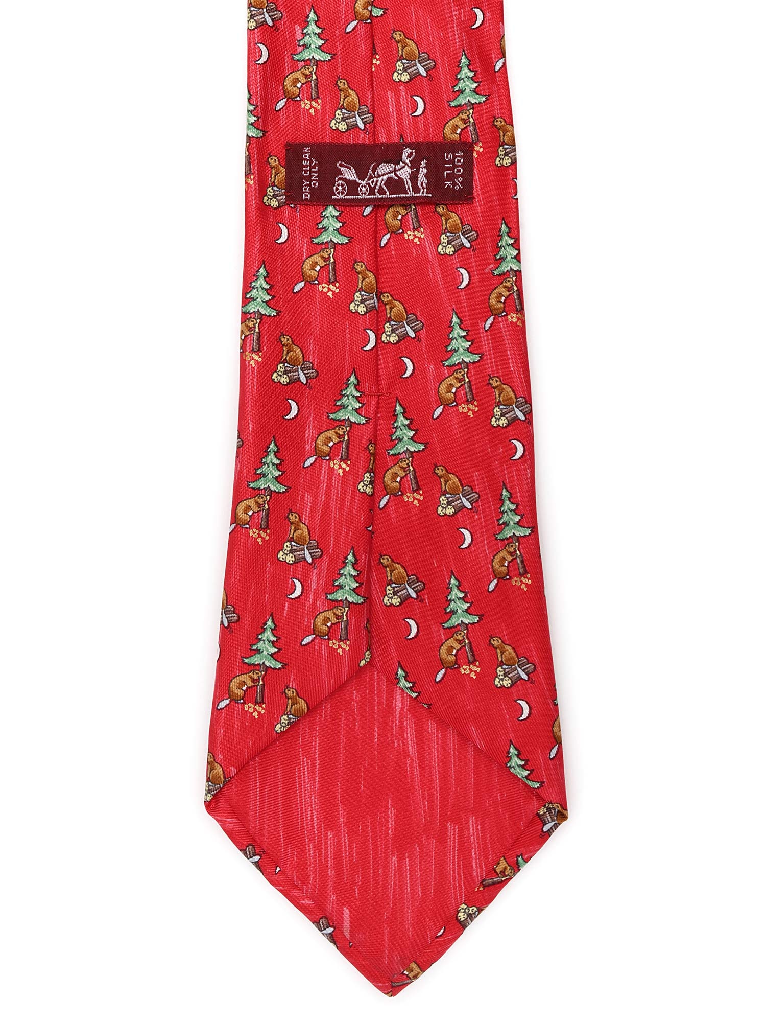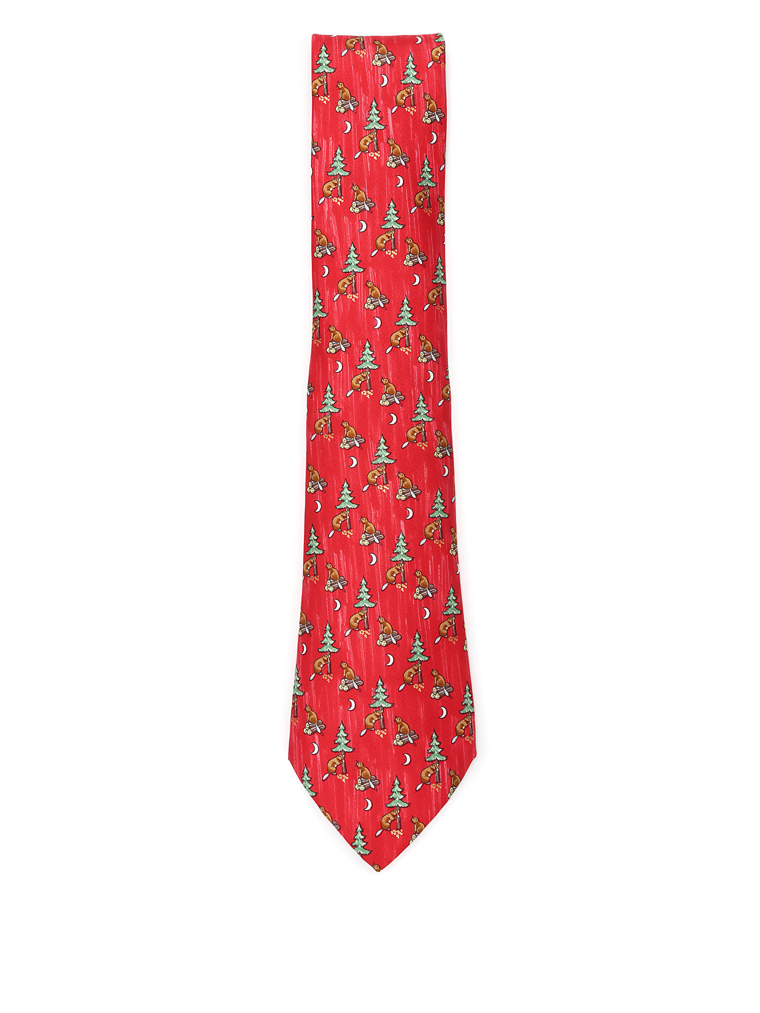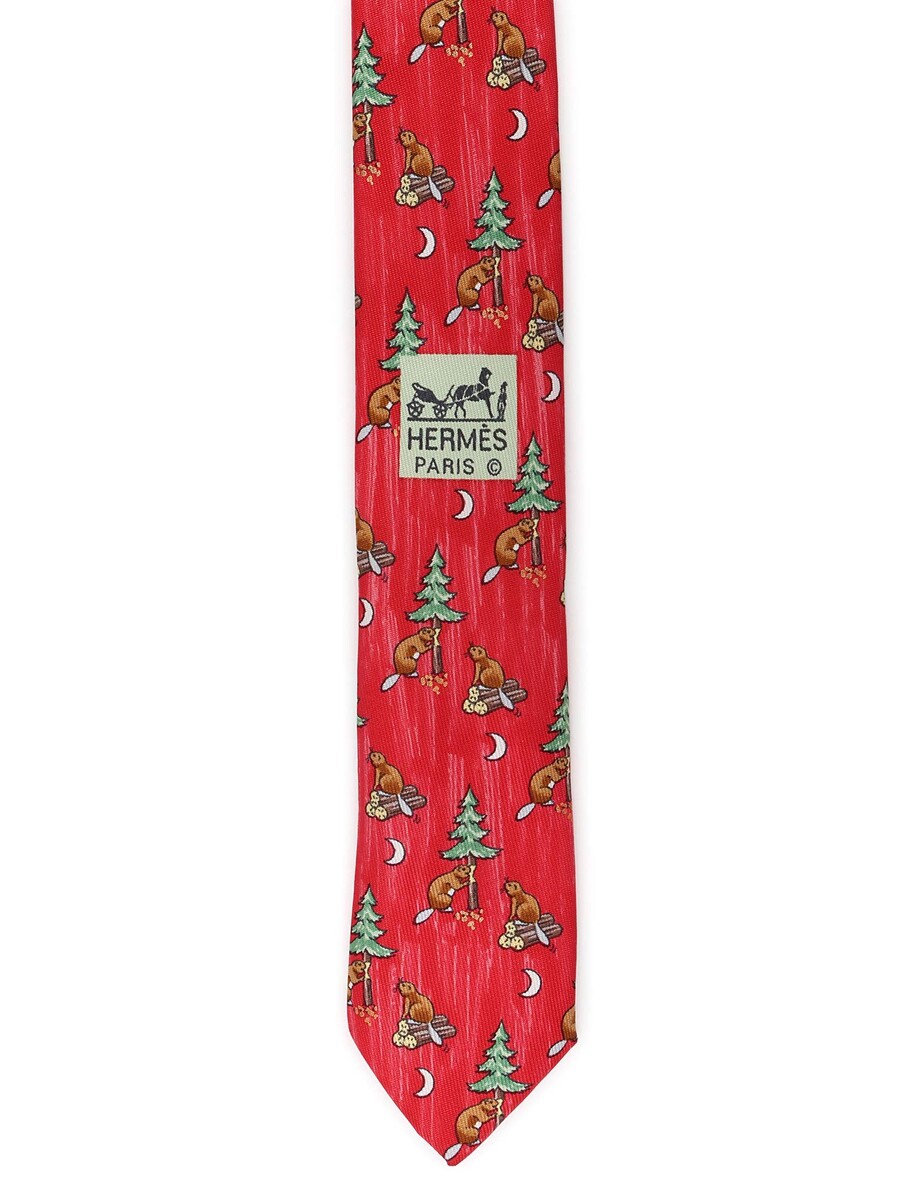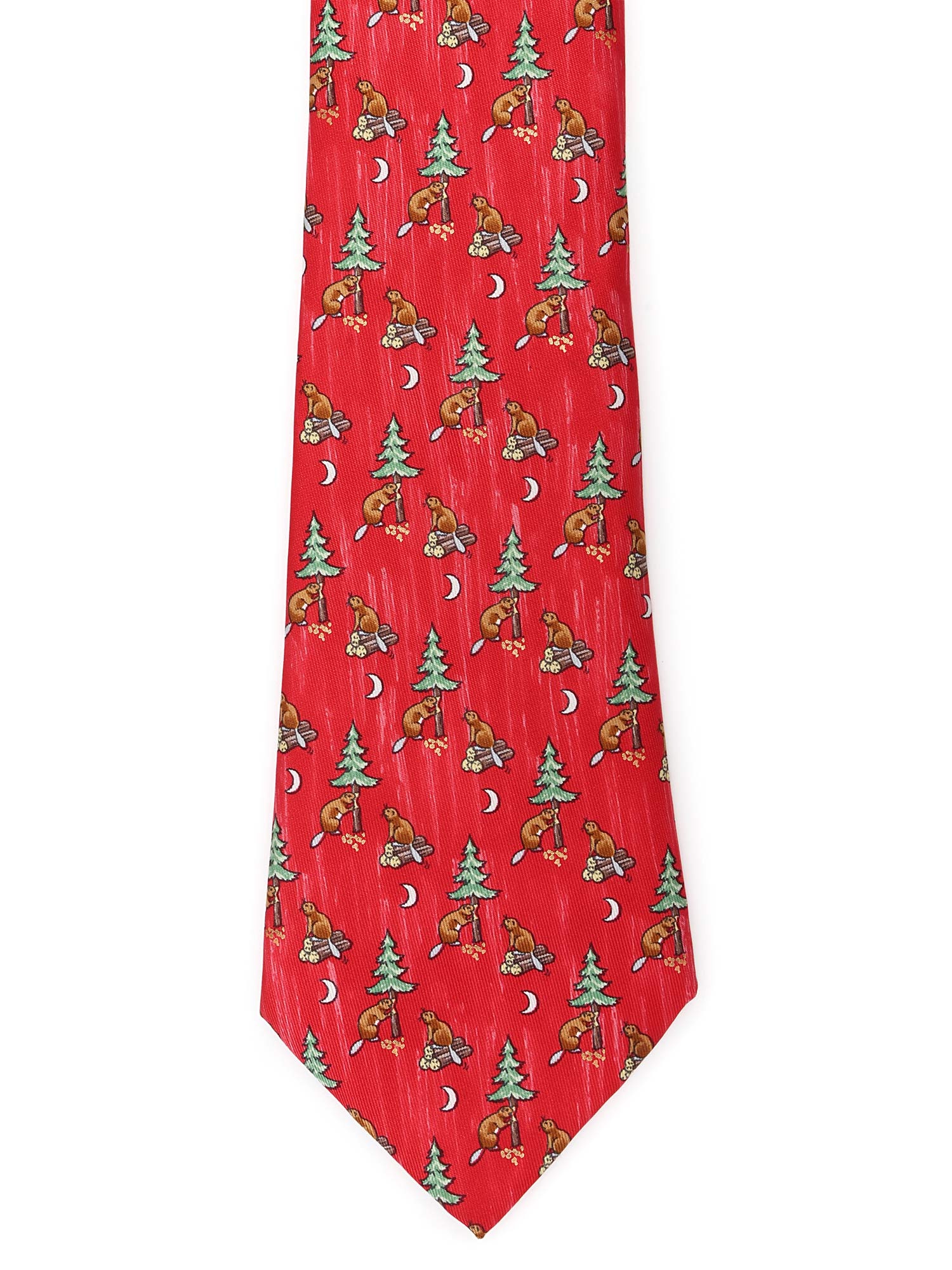 Silk tie in red featuring a beaver and tree motif.
