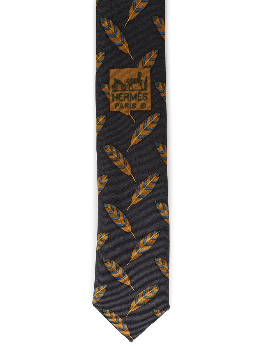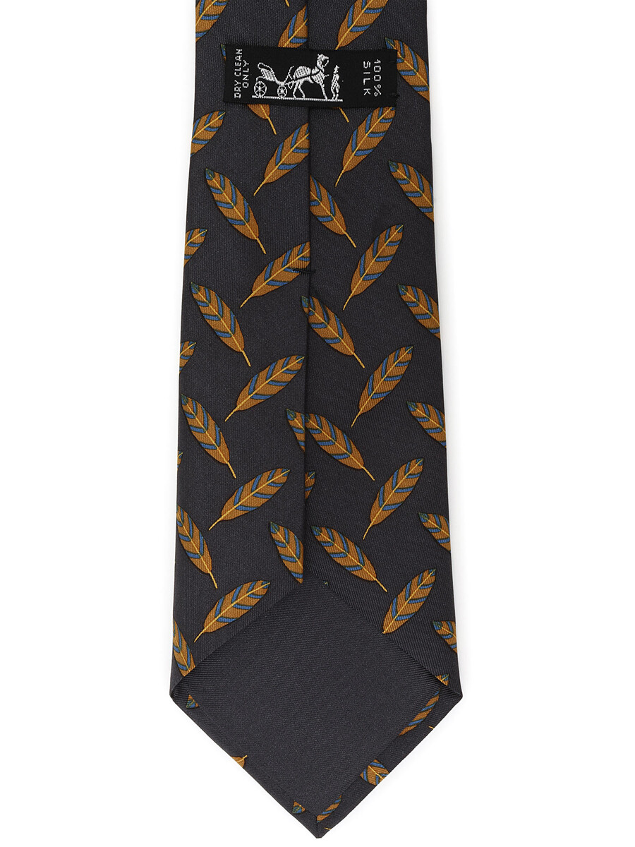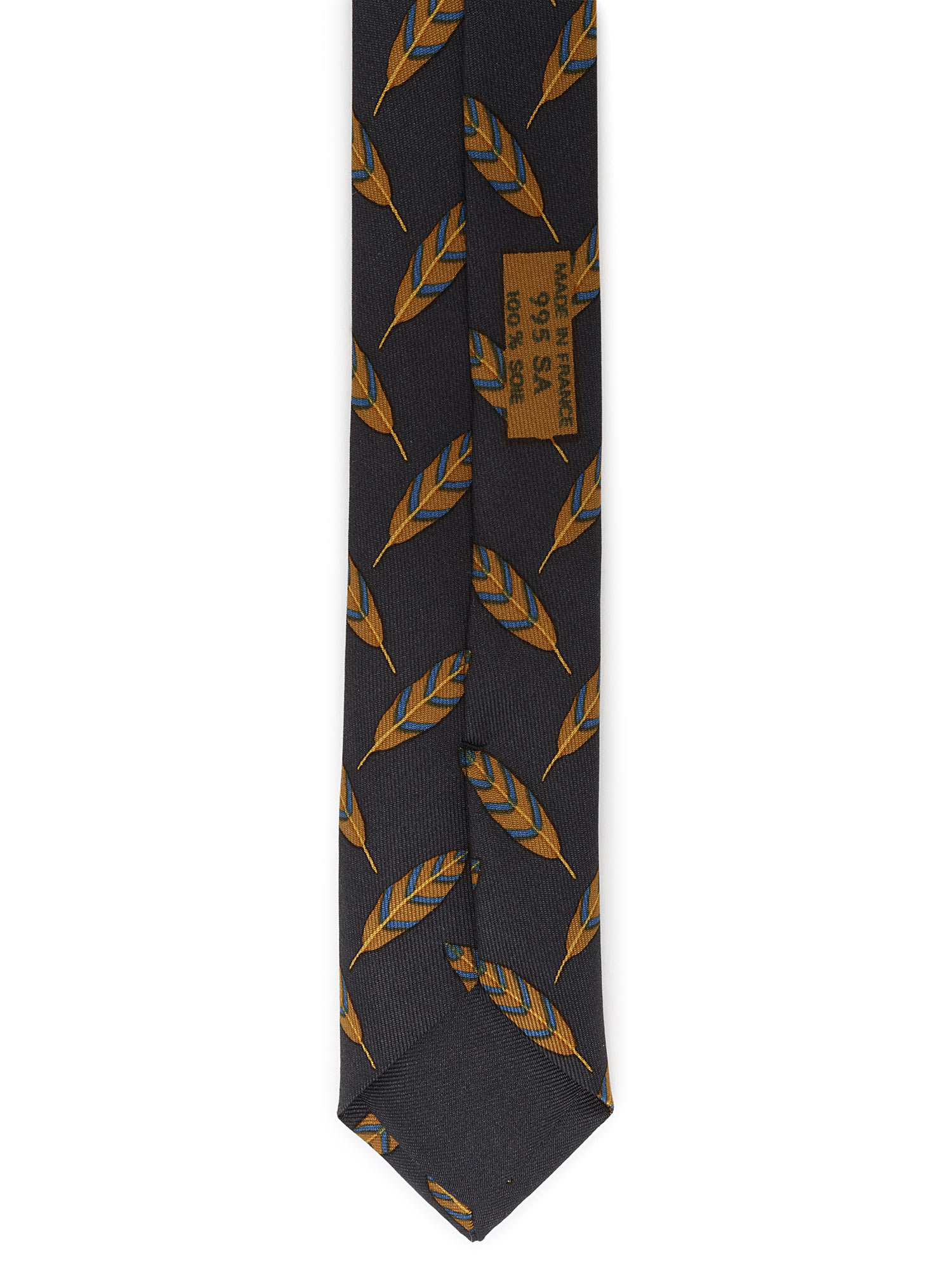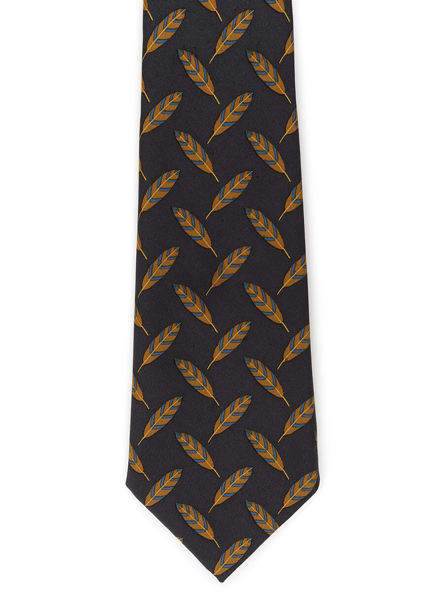 Luxurious silk tie featuring an elegant feather motif in blue and yellow tones.
