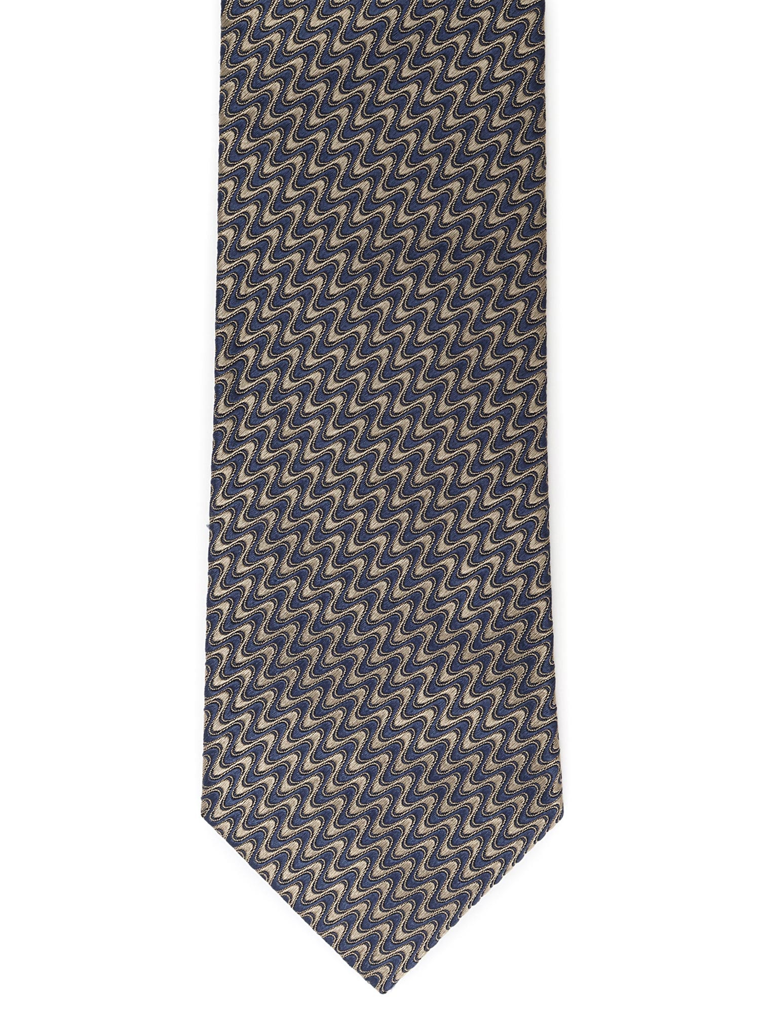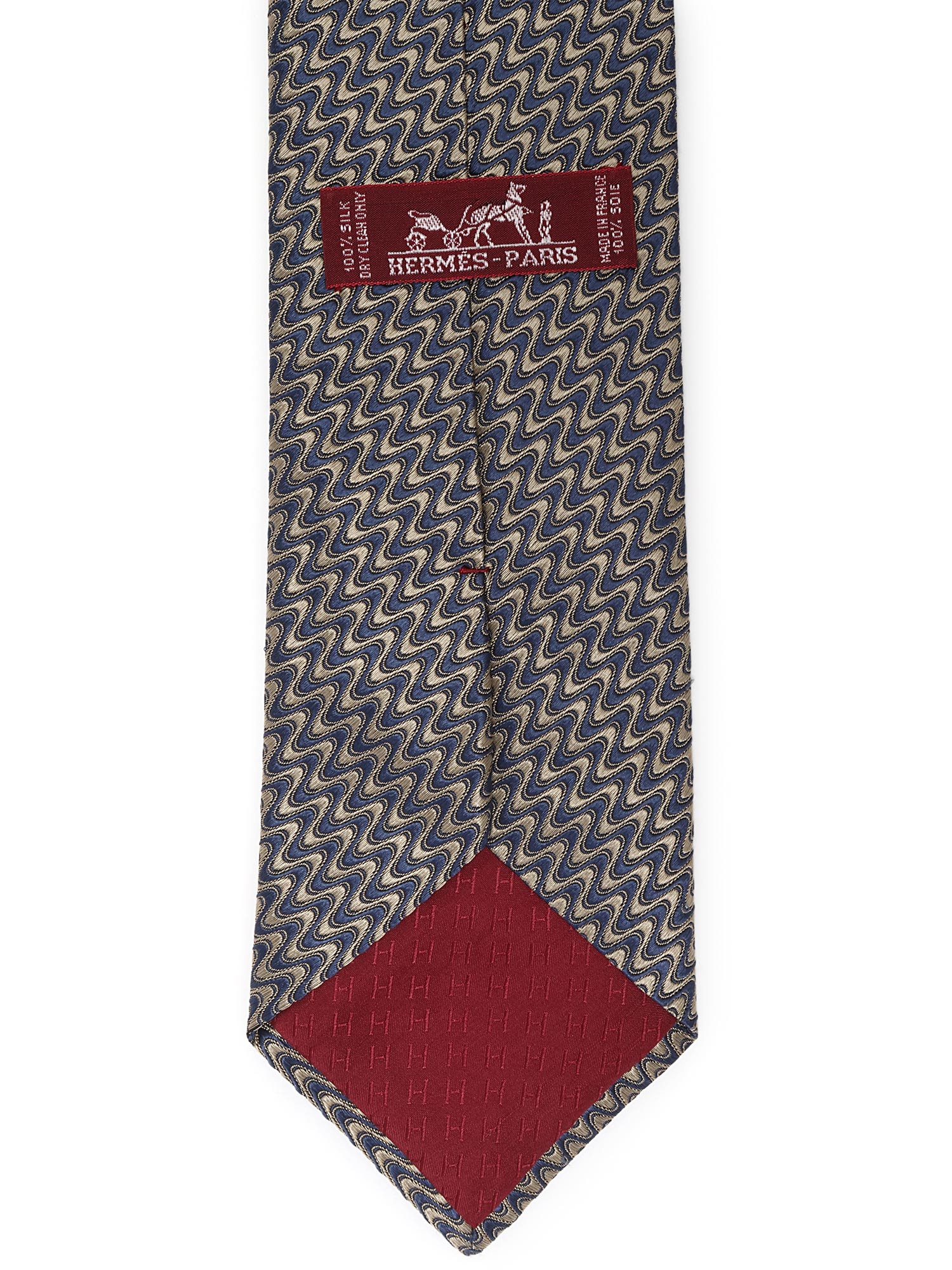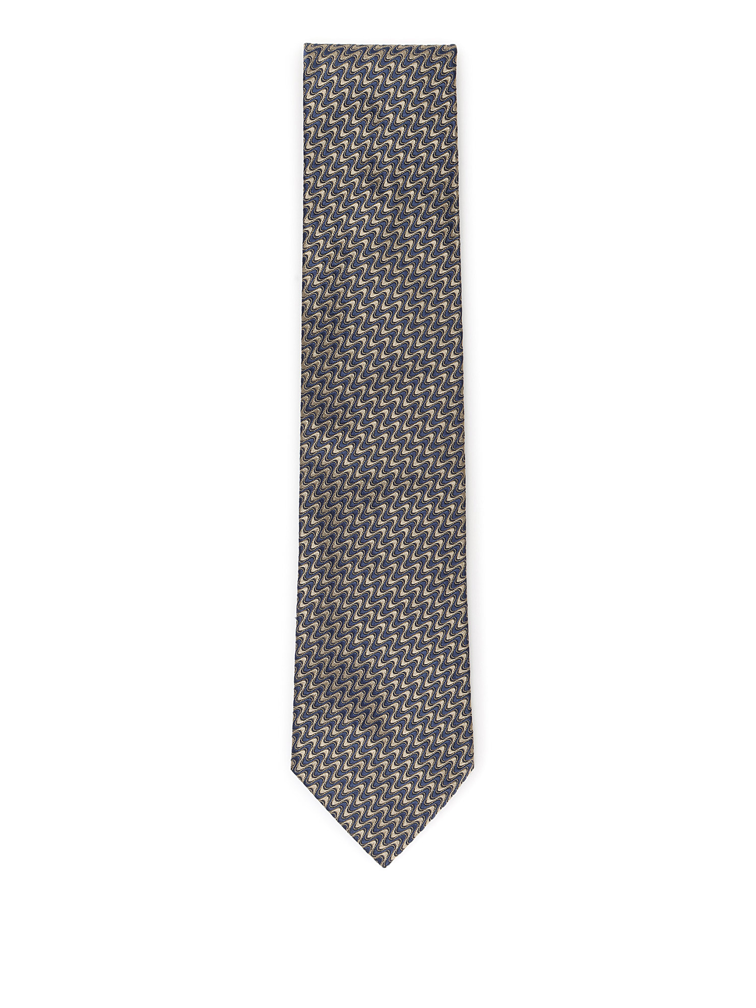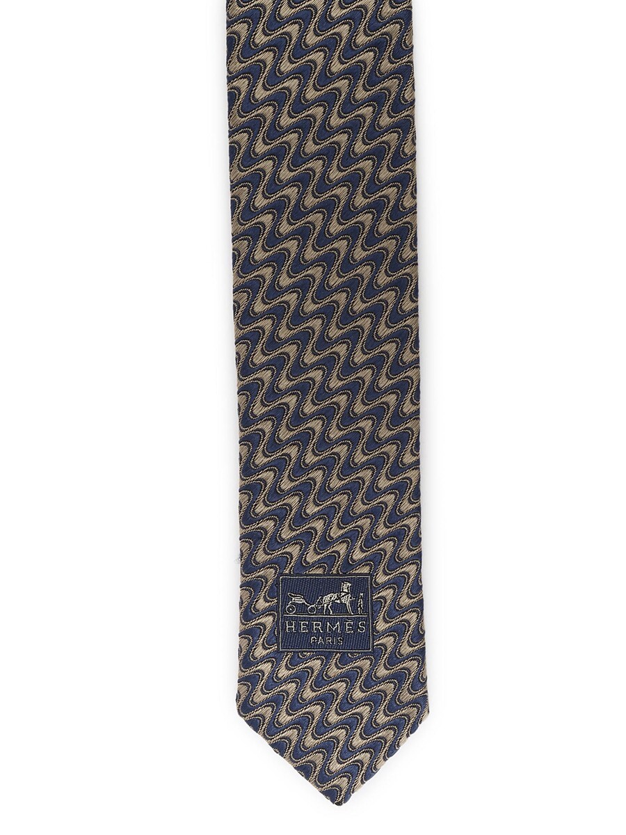 Silk tie with abstract motif in blue and white.