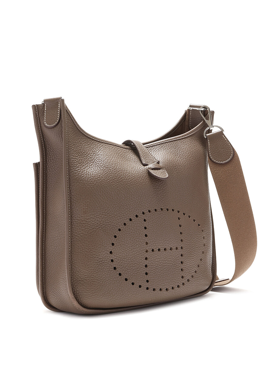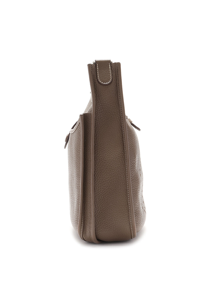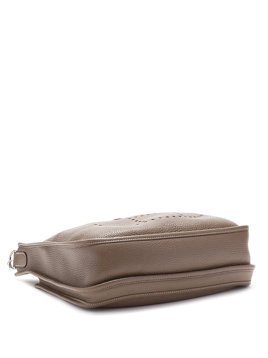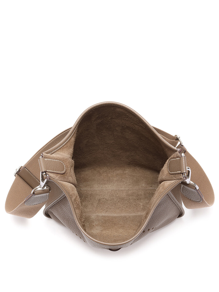 Grained leather crossbody bag in taupe with perforated detail. Open top with leather tab closure. Adjustable canvas strap. Silver-tone hardware.