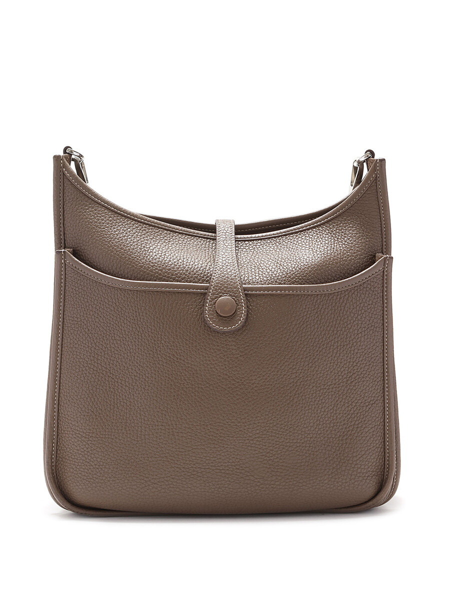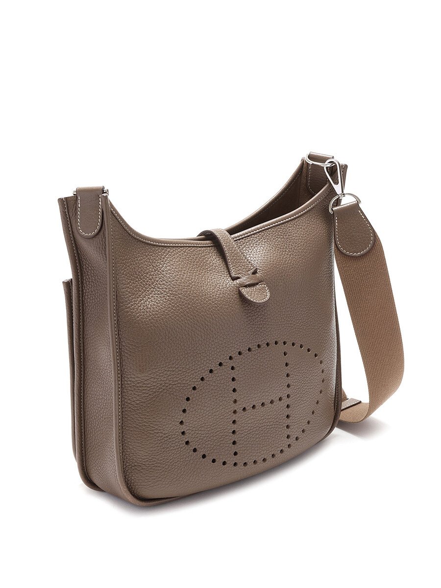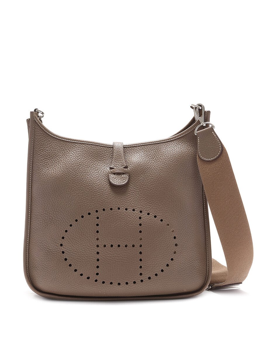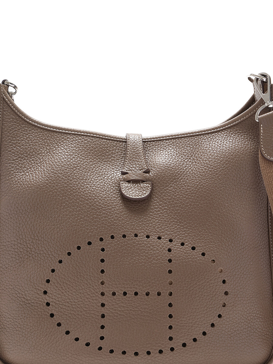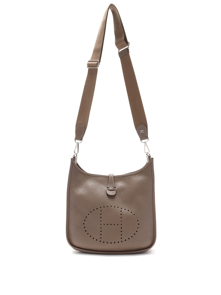Grained leather crossbody bag in taupe with perforated detail. Open top with leather tab closure. Adjustable canvas strap. Silver-tone hardware.