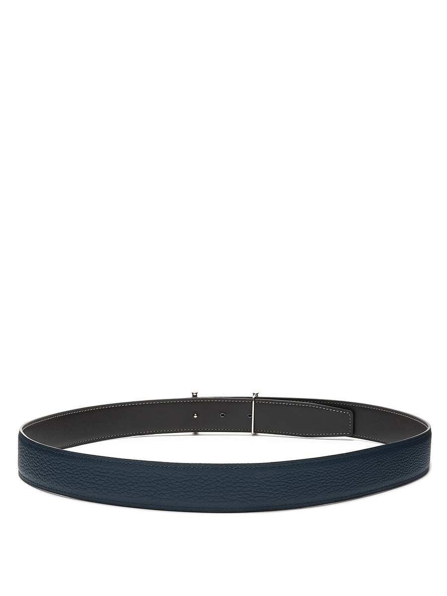 Reversible leather belt with a textured design in Noir and Bleu Nuit. Features a silver-tone buckle and palladium-plated hardware. Comes with a dust bag and box.