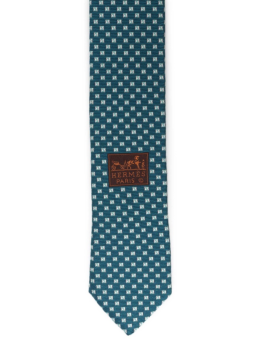Silk tie featuring a teal blue 'H' pattern with white accents.