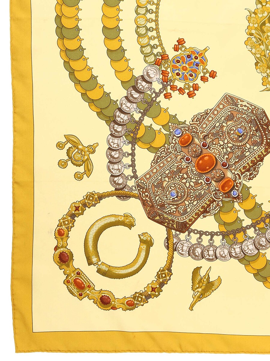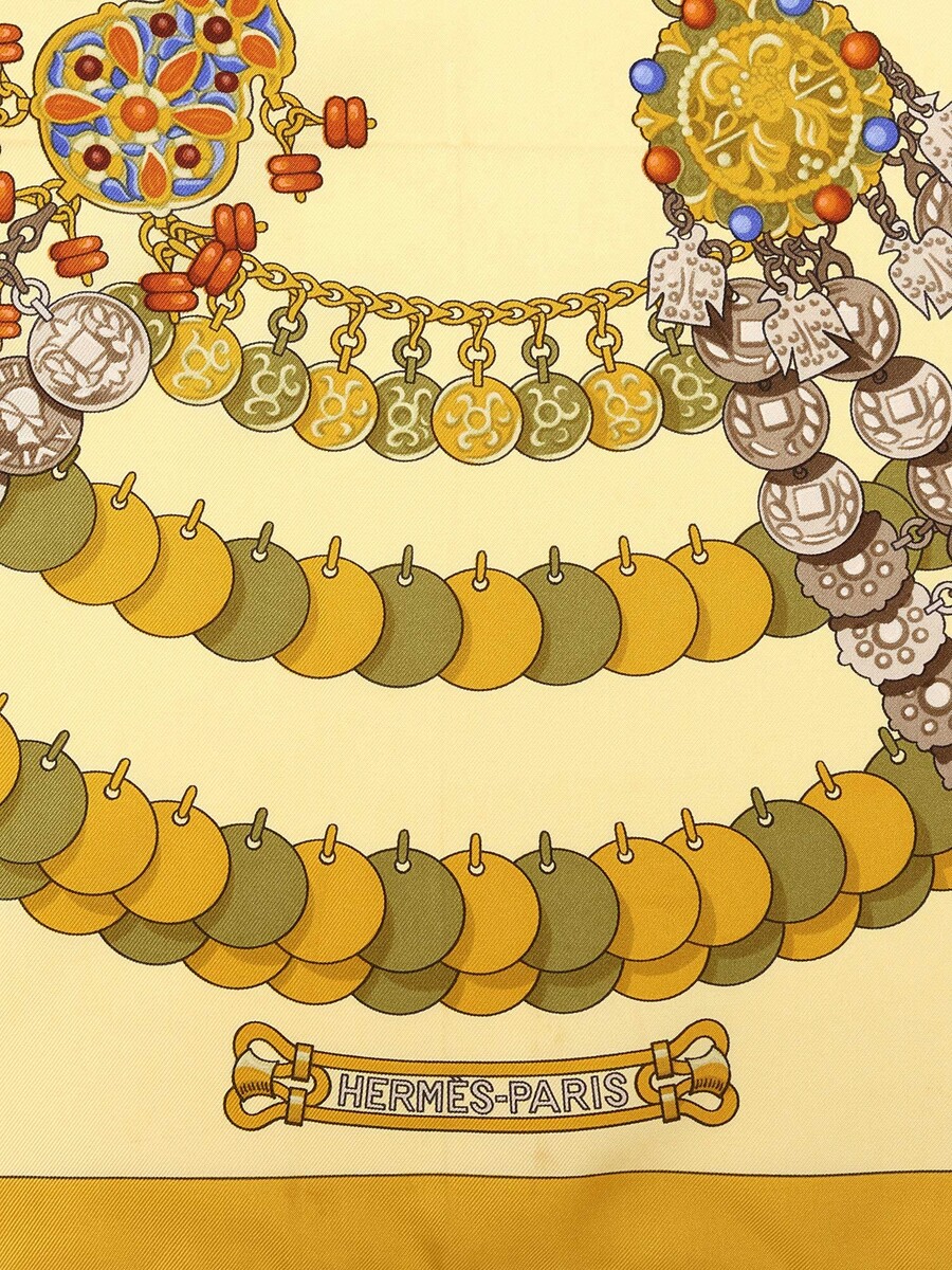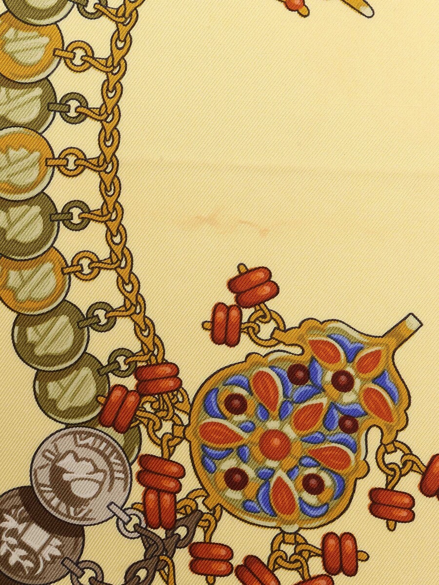 Silk scarf featuring jewelry and face motif in yellow, grey, brown, blue, and red.