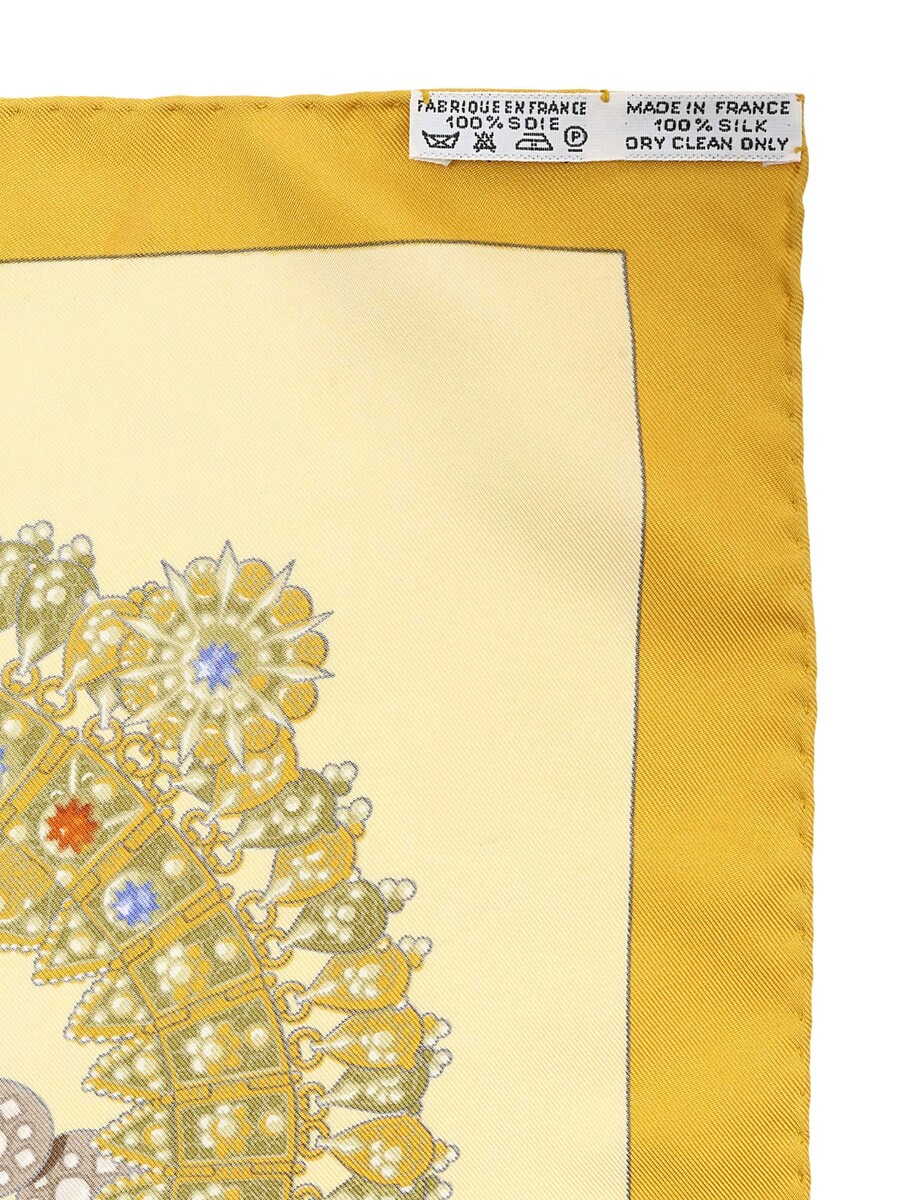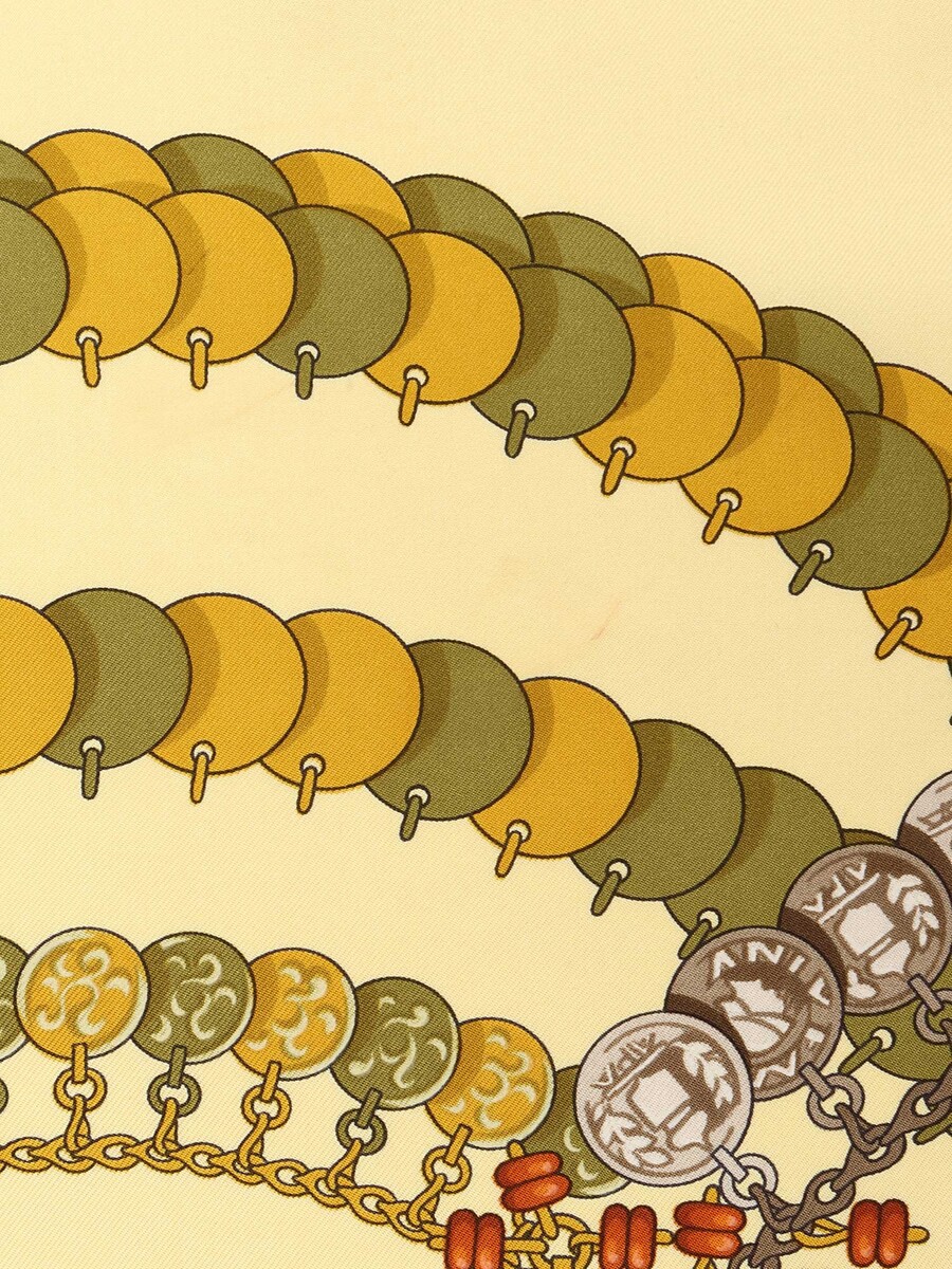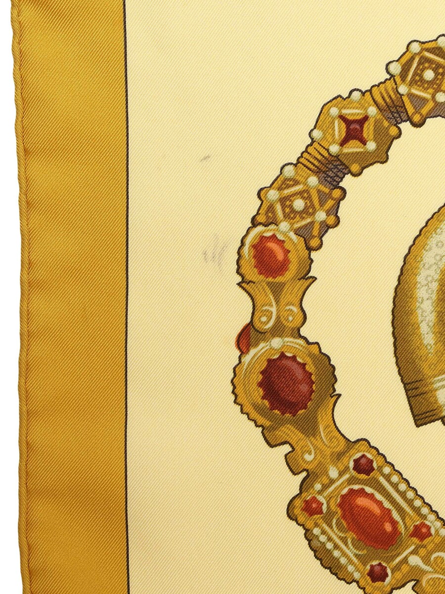 Silk scarf featuring jewelry and face motif in yellow, grey, brown, blue, and red.
