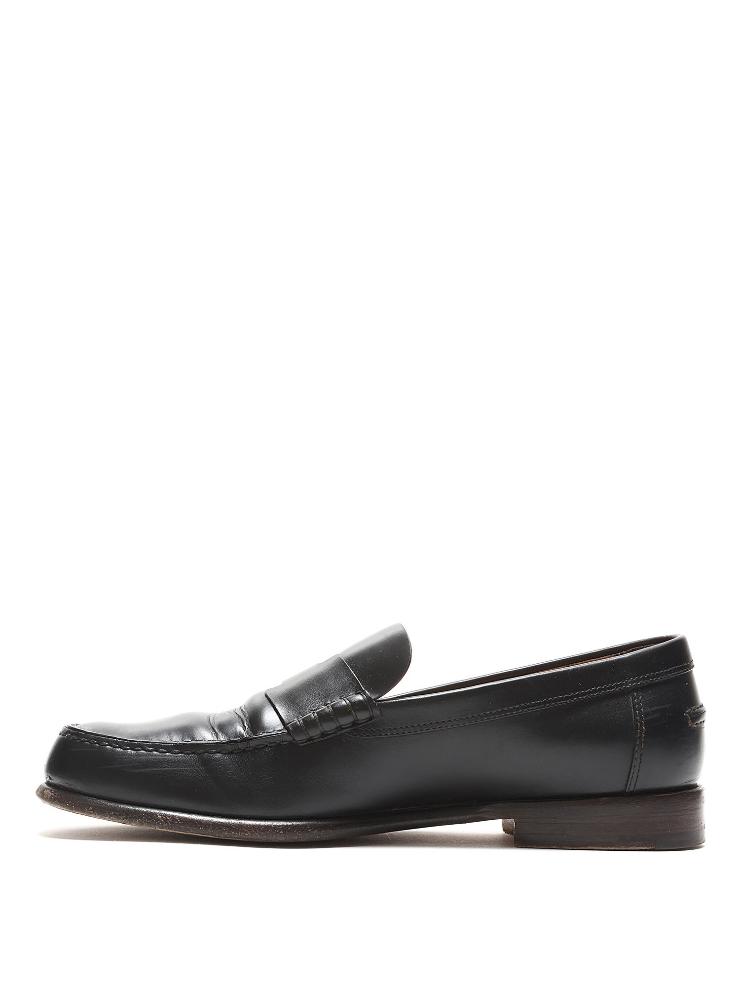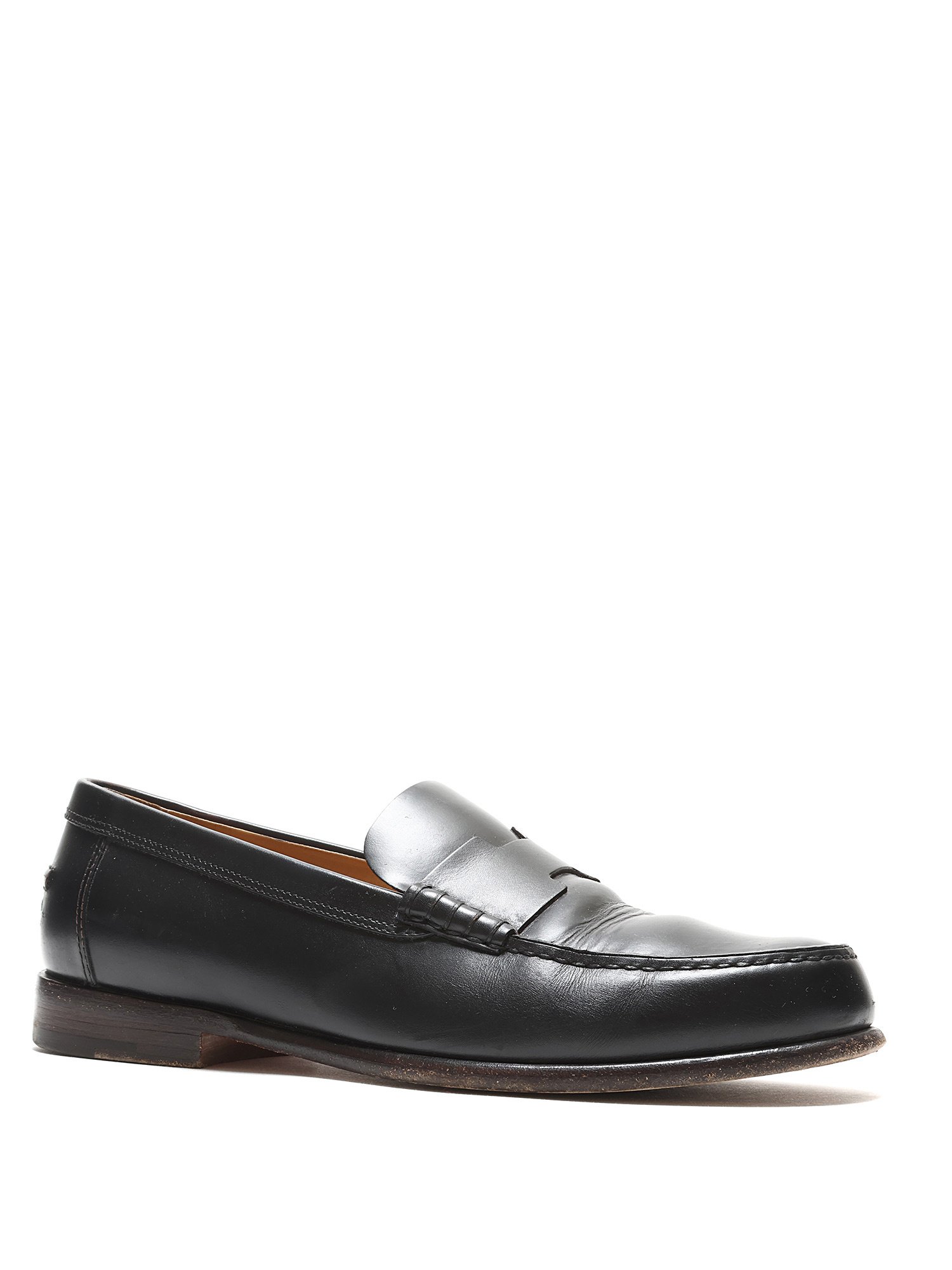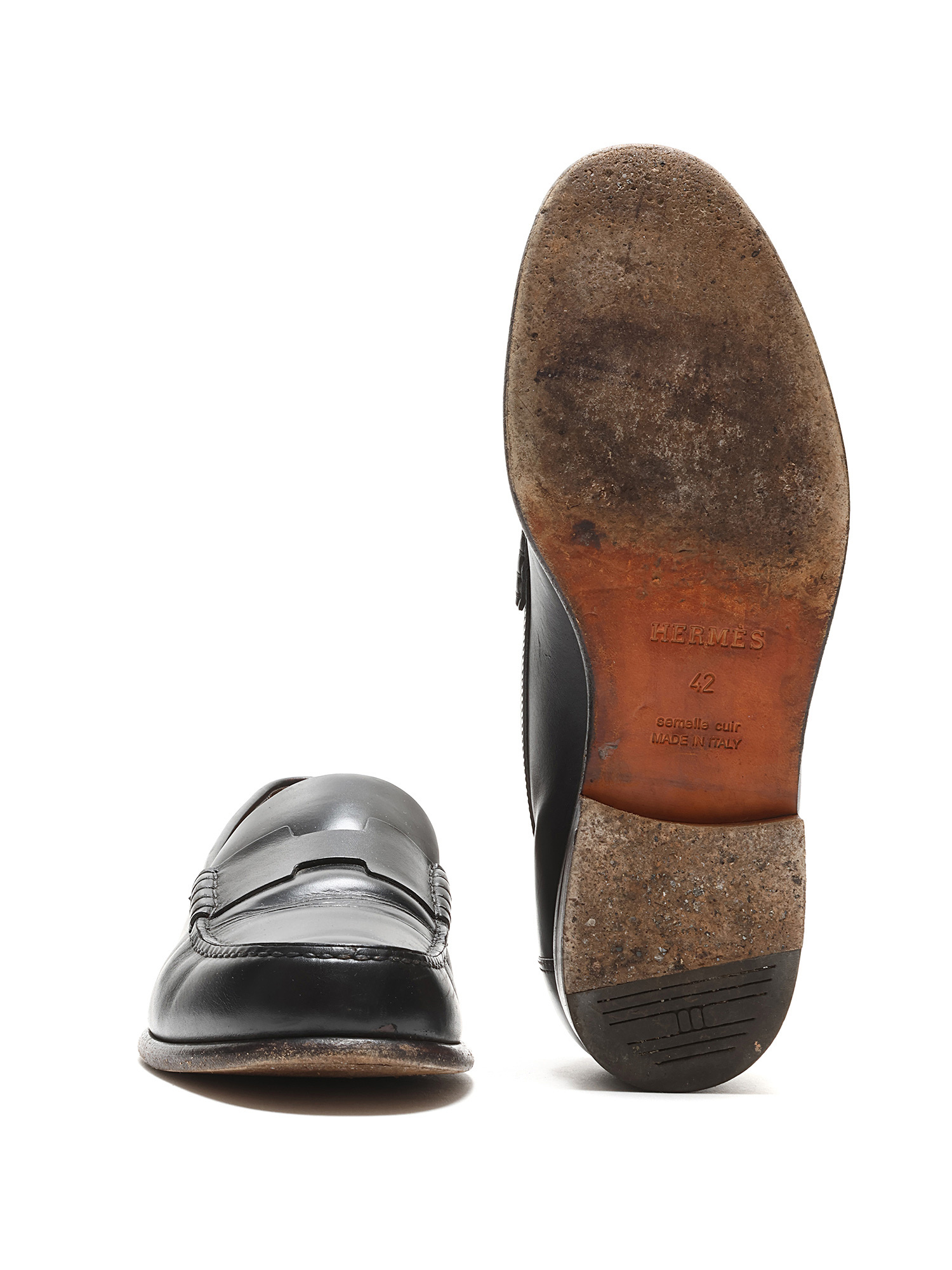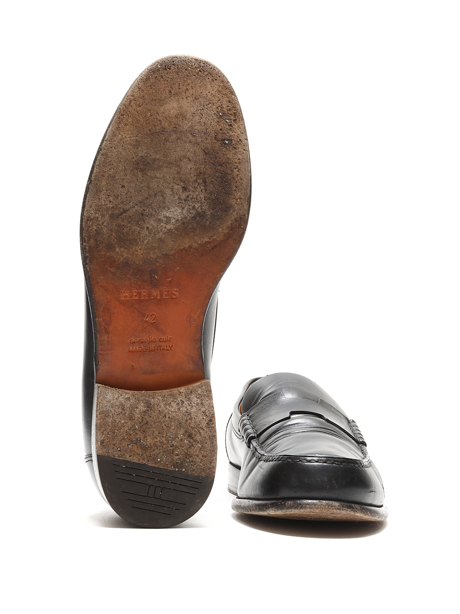 Signs of wear at outsole. Creased leather.