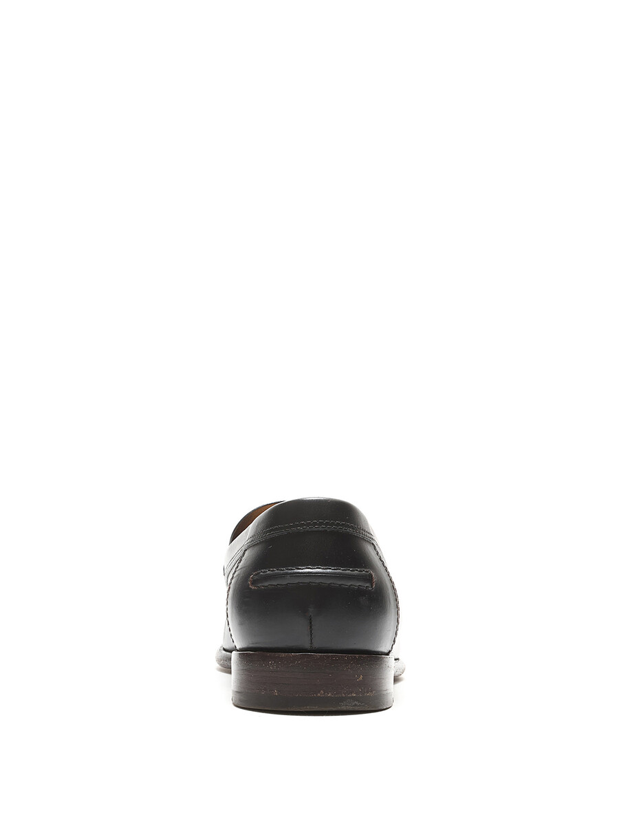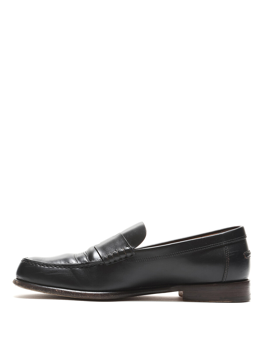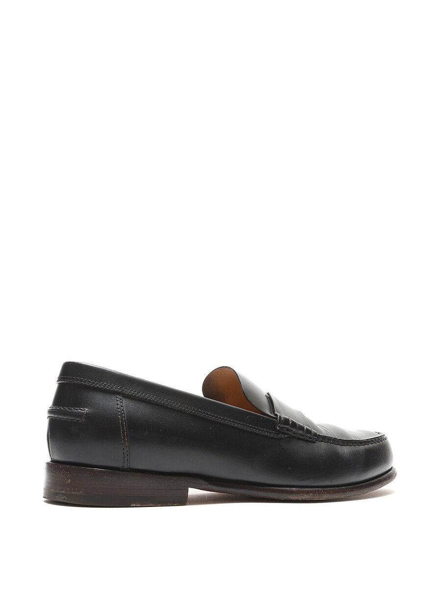 Black leather loafers with tonal stitching. Slip-on design with a round toe. Leather sole. Classic elegance with versatile styling.