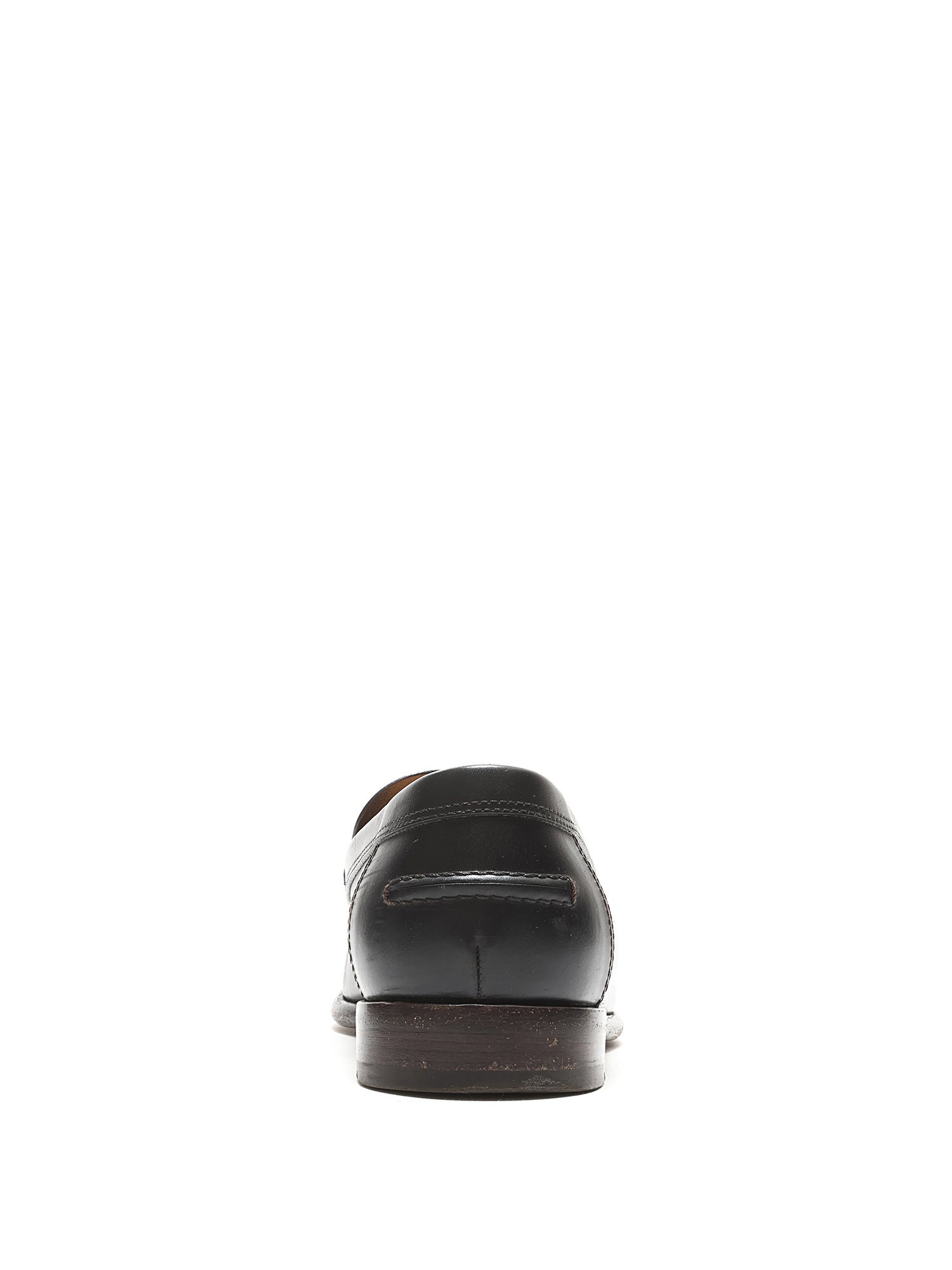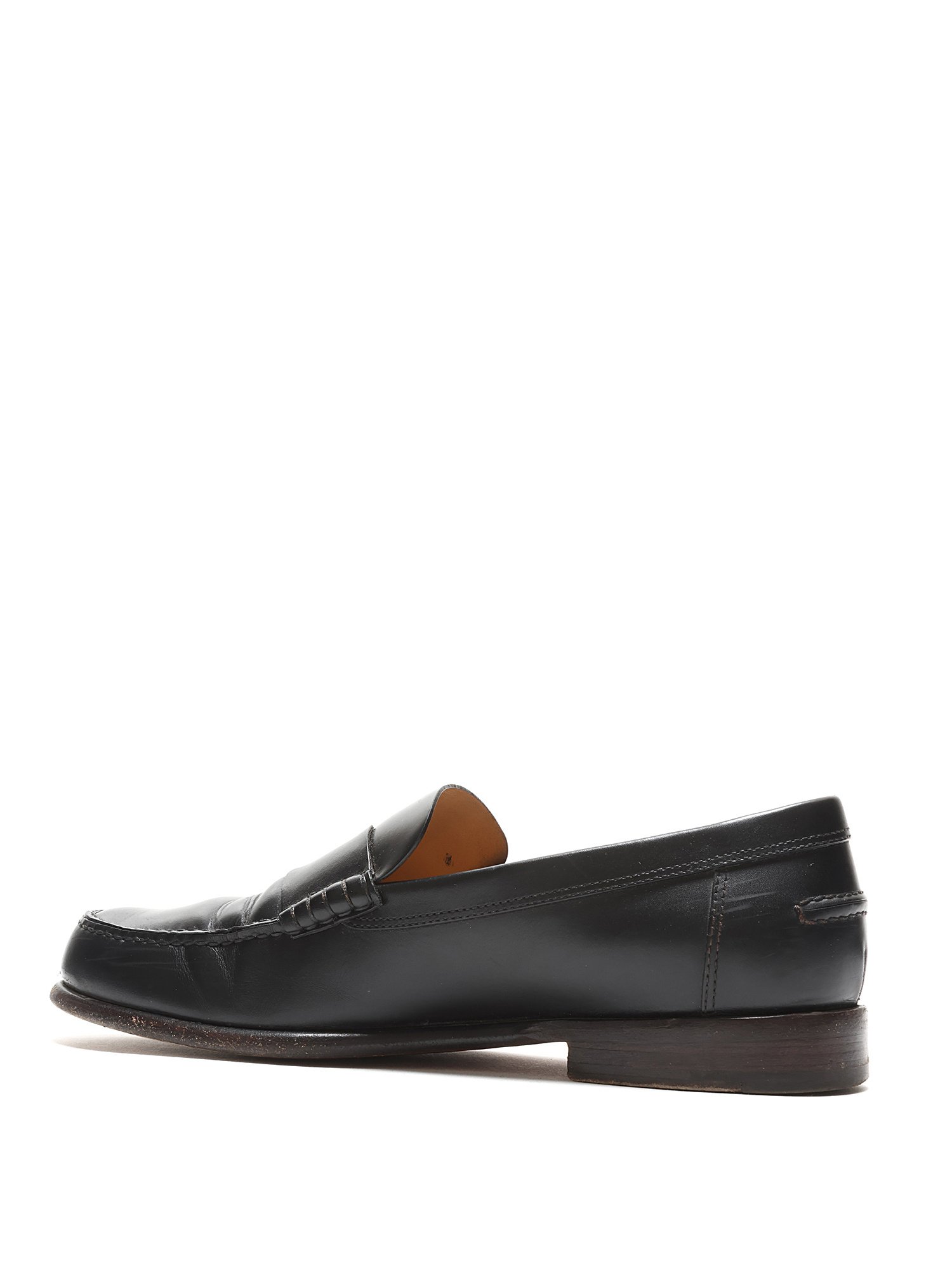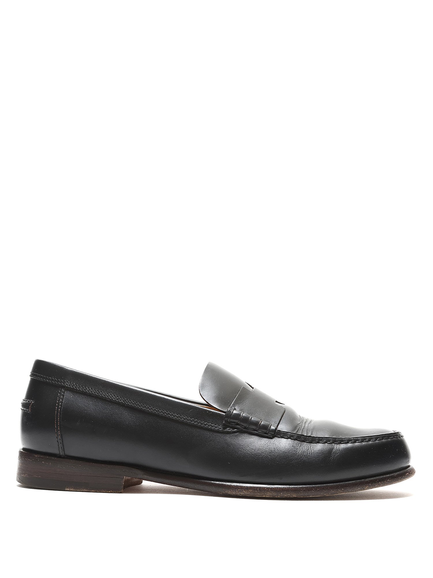 Black leather loafers with tonal stitching. Slip-on design with a round toe. Leather sole. Classic elegance with versatile styling.