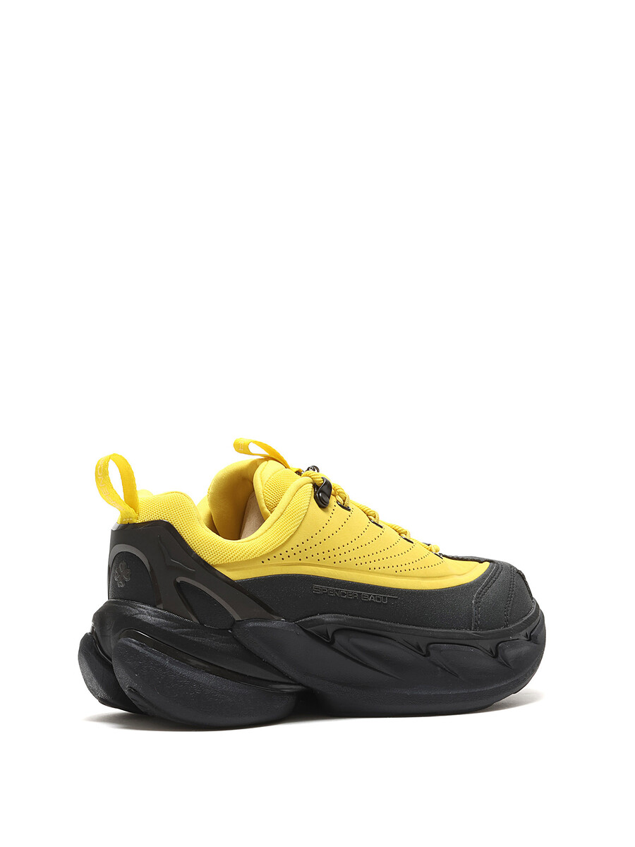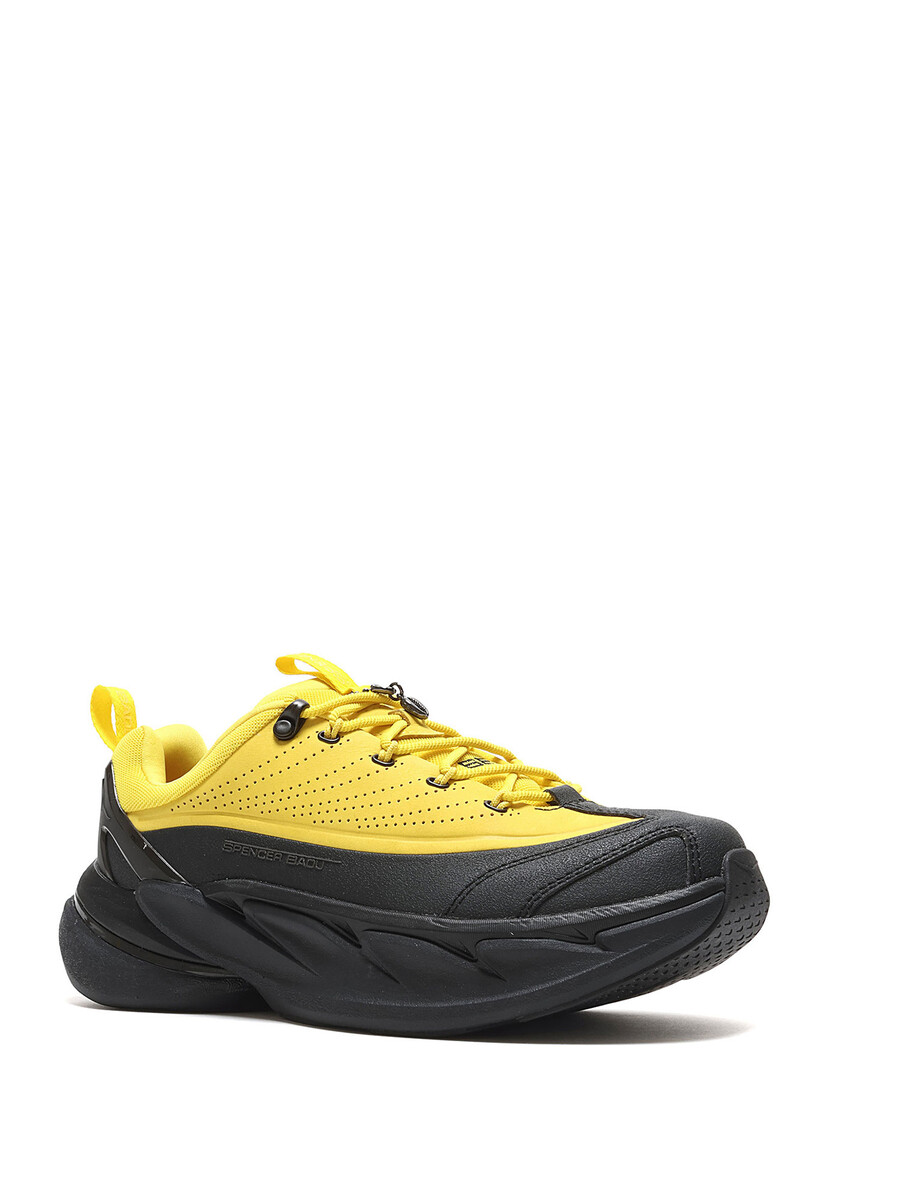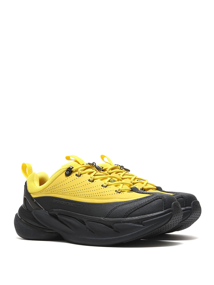 Low top sneakers with a synthetic upper in a bold yellow and black contrast design. Lace-up closure. Round toe style. Rubber sole.