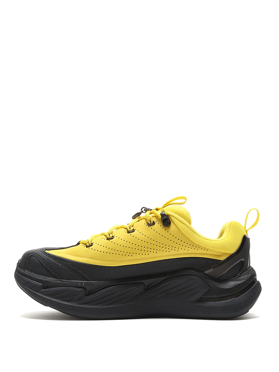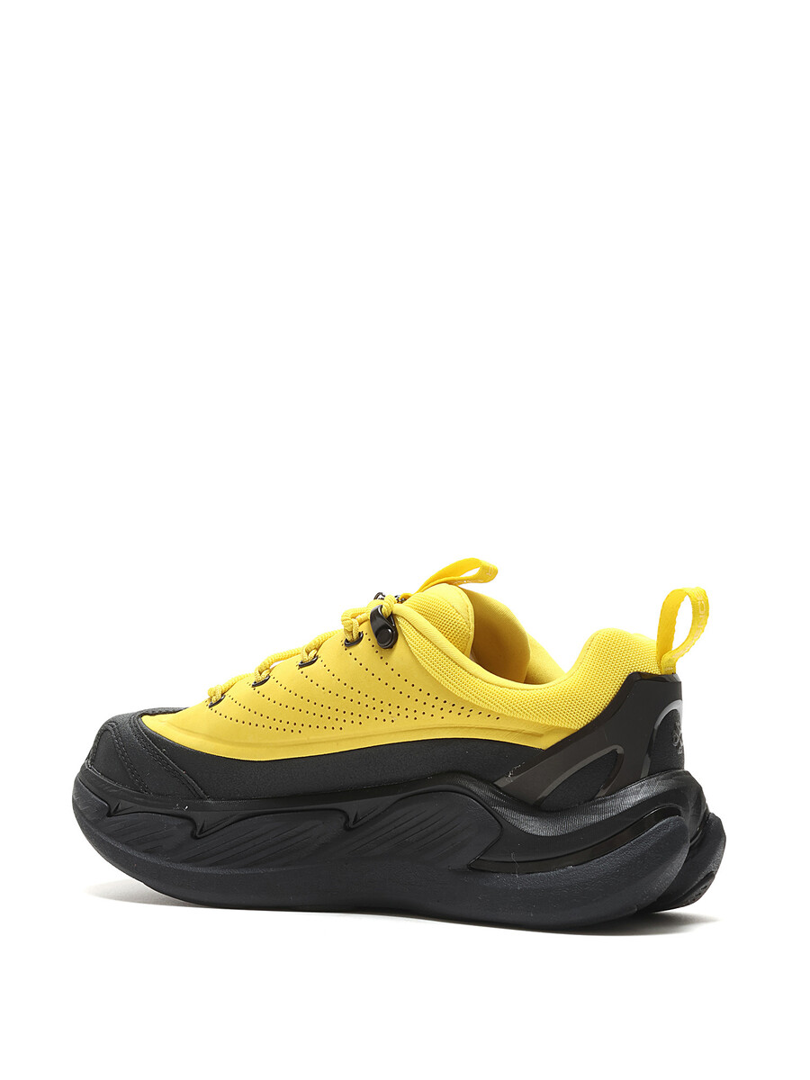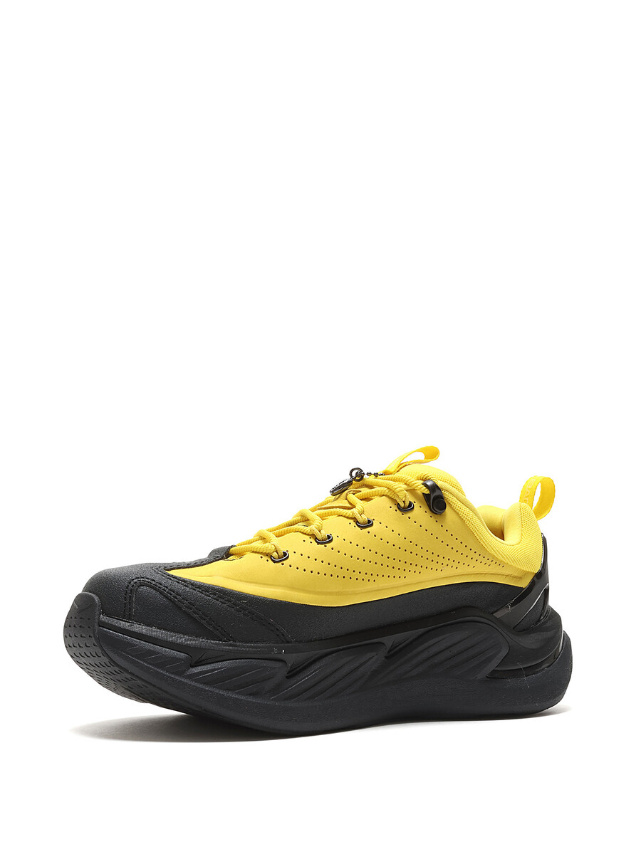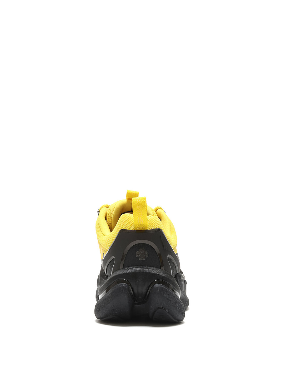 Low top sneakers with a synthetic upper in a bold yellow and black contrast design. Lace-up closure. Round toe style. Rubber sole.
