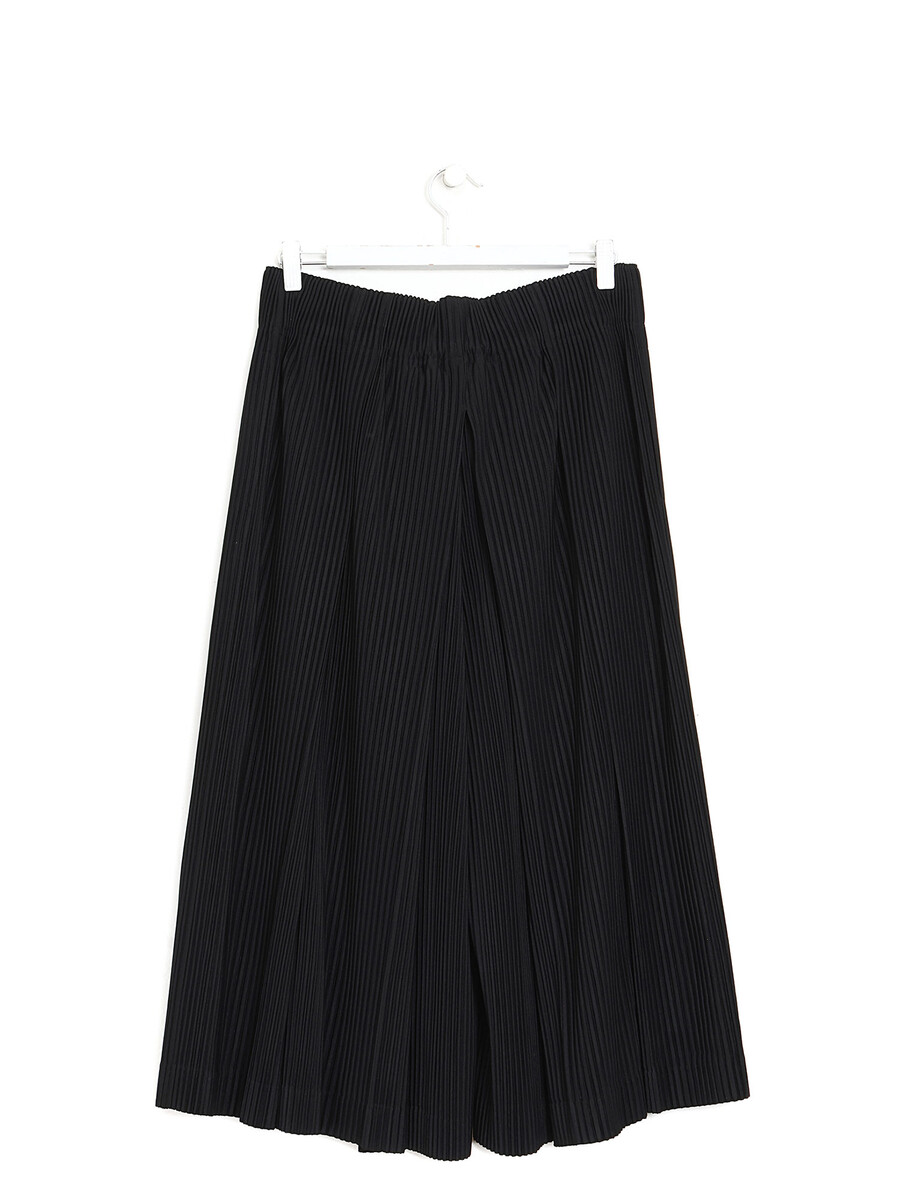 Pleated black cropped trousers with an elasticated drawstring waistband. Designed for ease and comfort with a unique pleated texture.