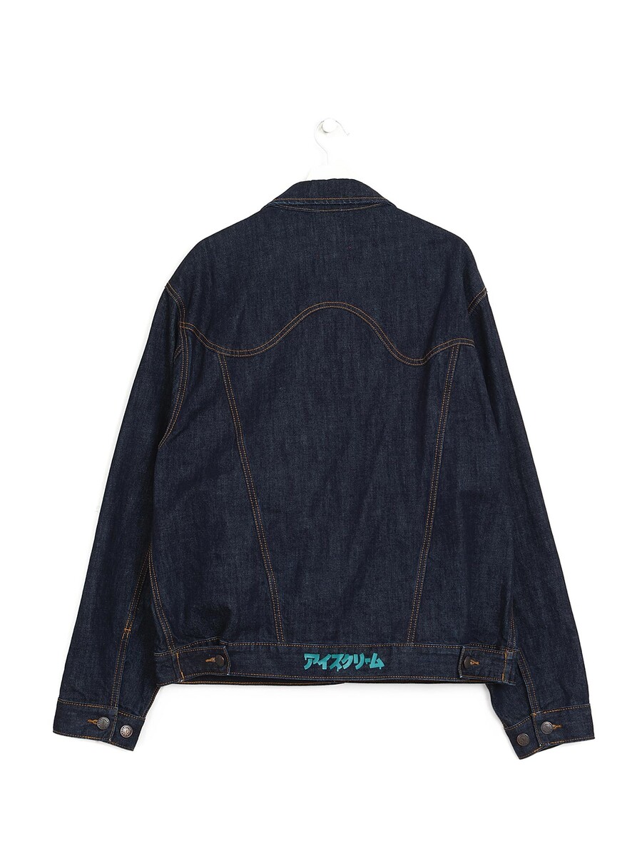 Denim jacket featuring long sleeves and graphic print in blue denim with turquoise accents. Button closure at front. Shirt collar. Flap chest pockets.