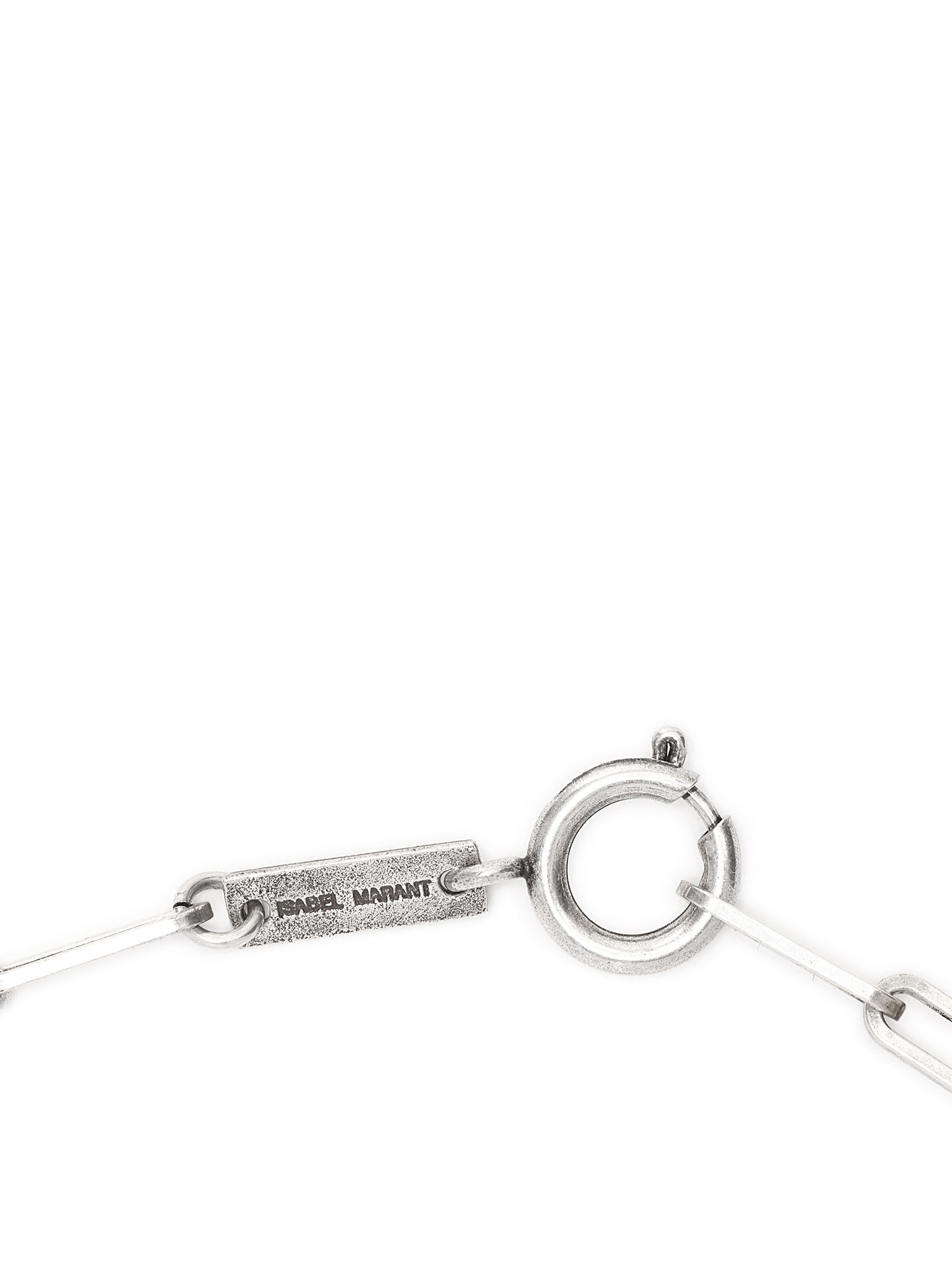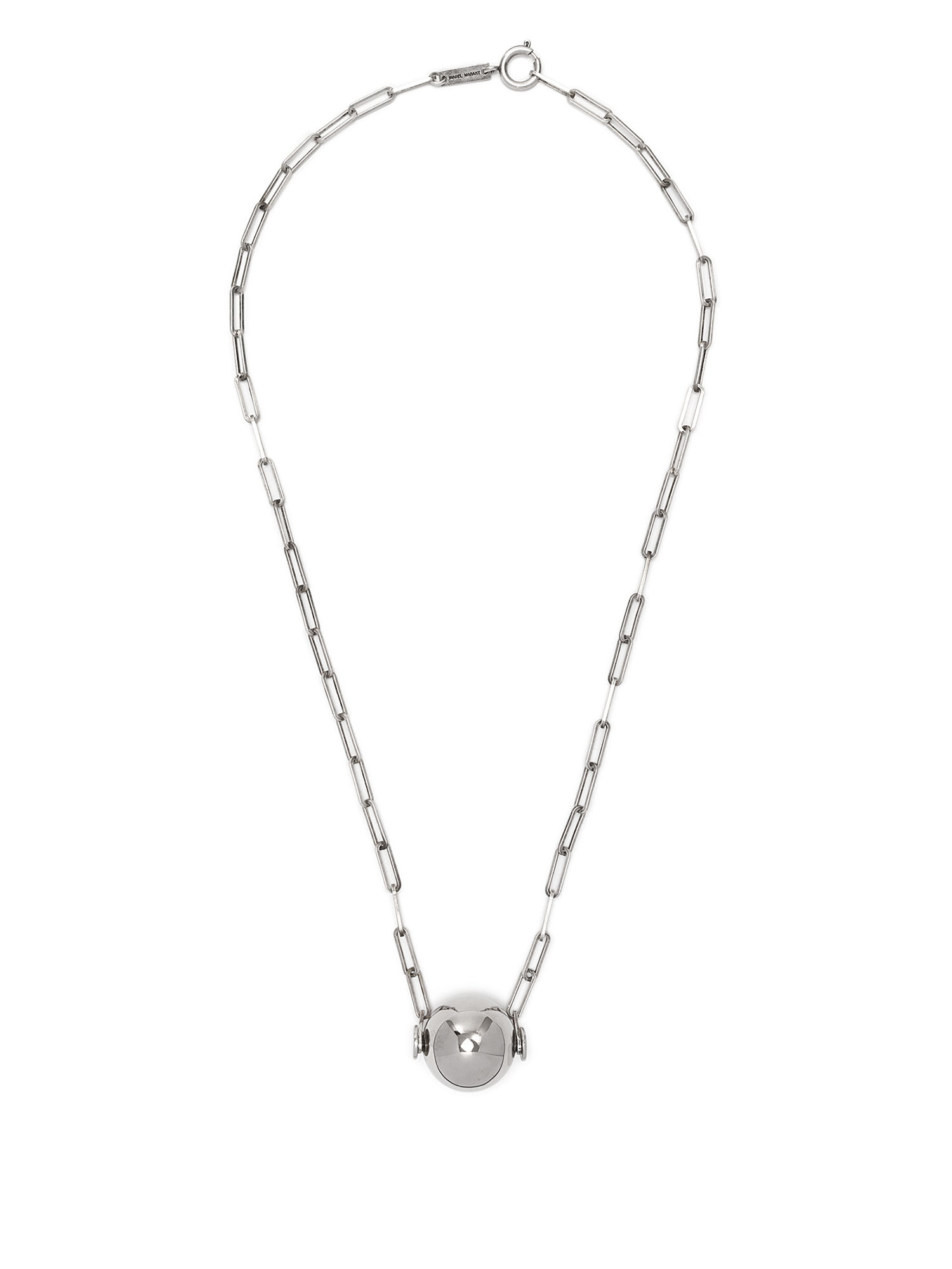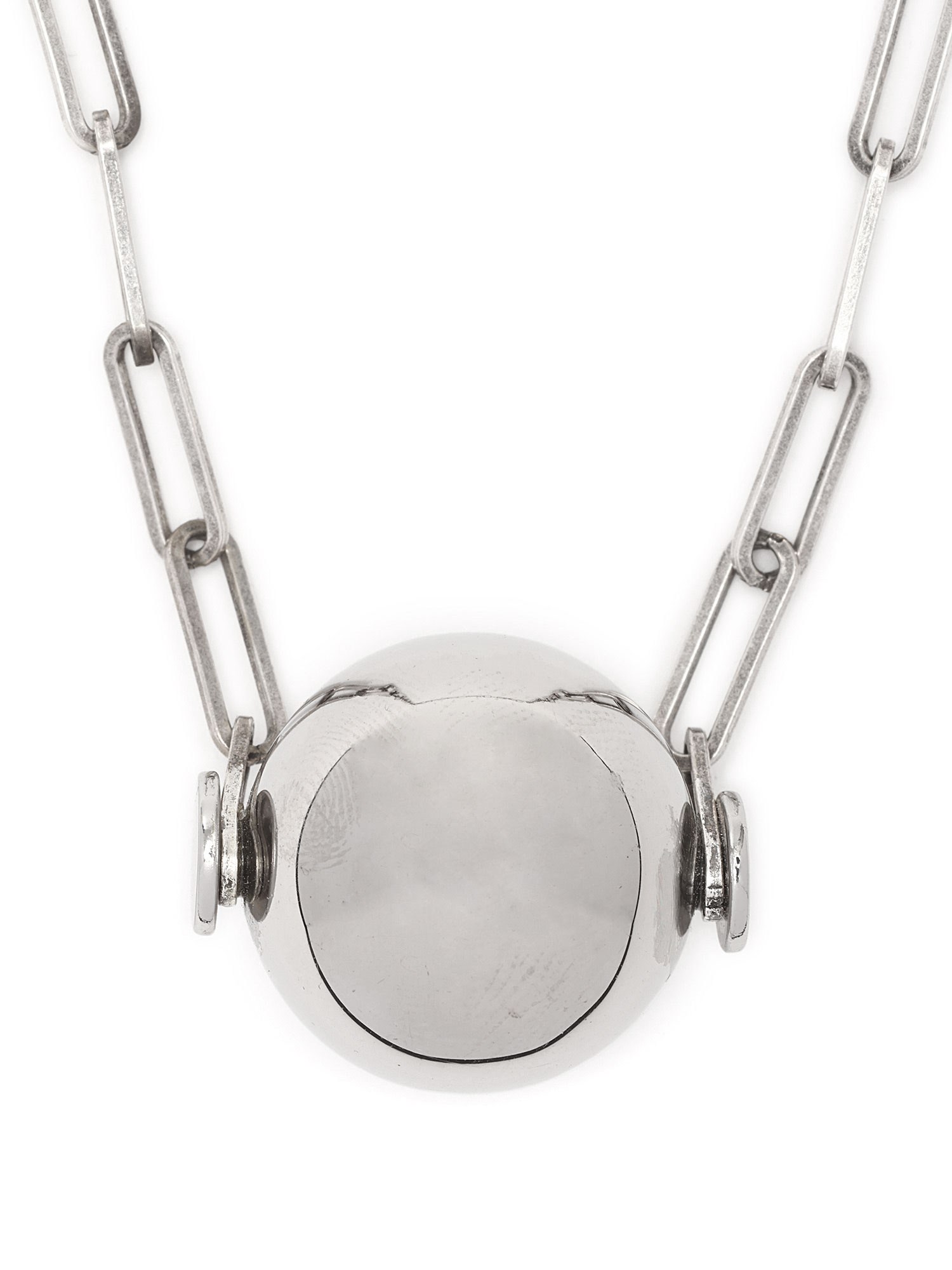 Metal necklace with a spherical silver pendant. Comes with a protective pouch.