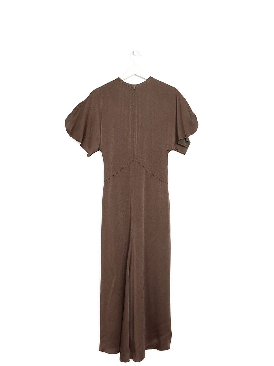 Short-sleeved dress in brown. Central back zip closure. Round neckline.