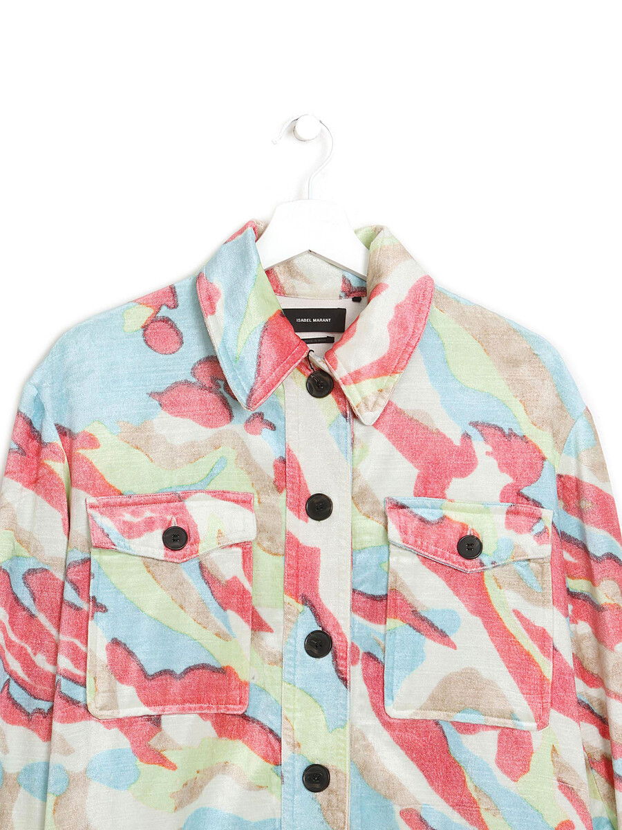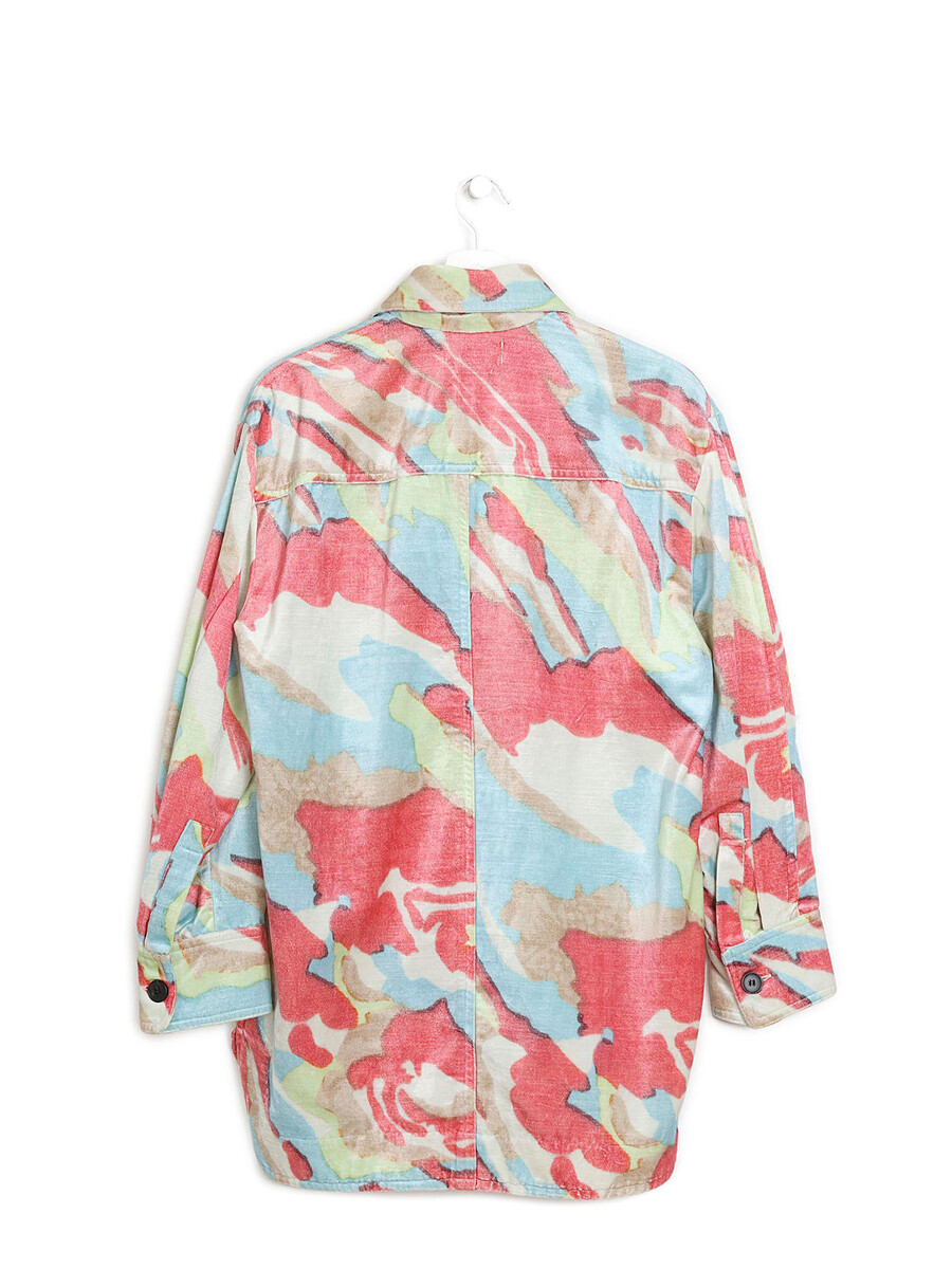 Multicolor camouflage patterned long sleeve jacket. Button closure with flap pockets on the front. Made of a cotton-viscose blend.