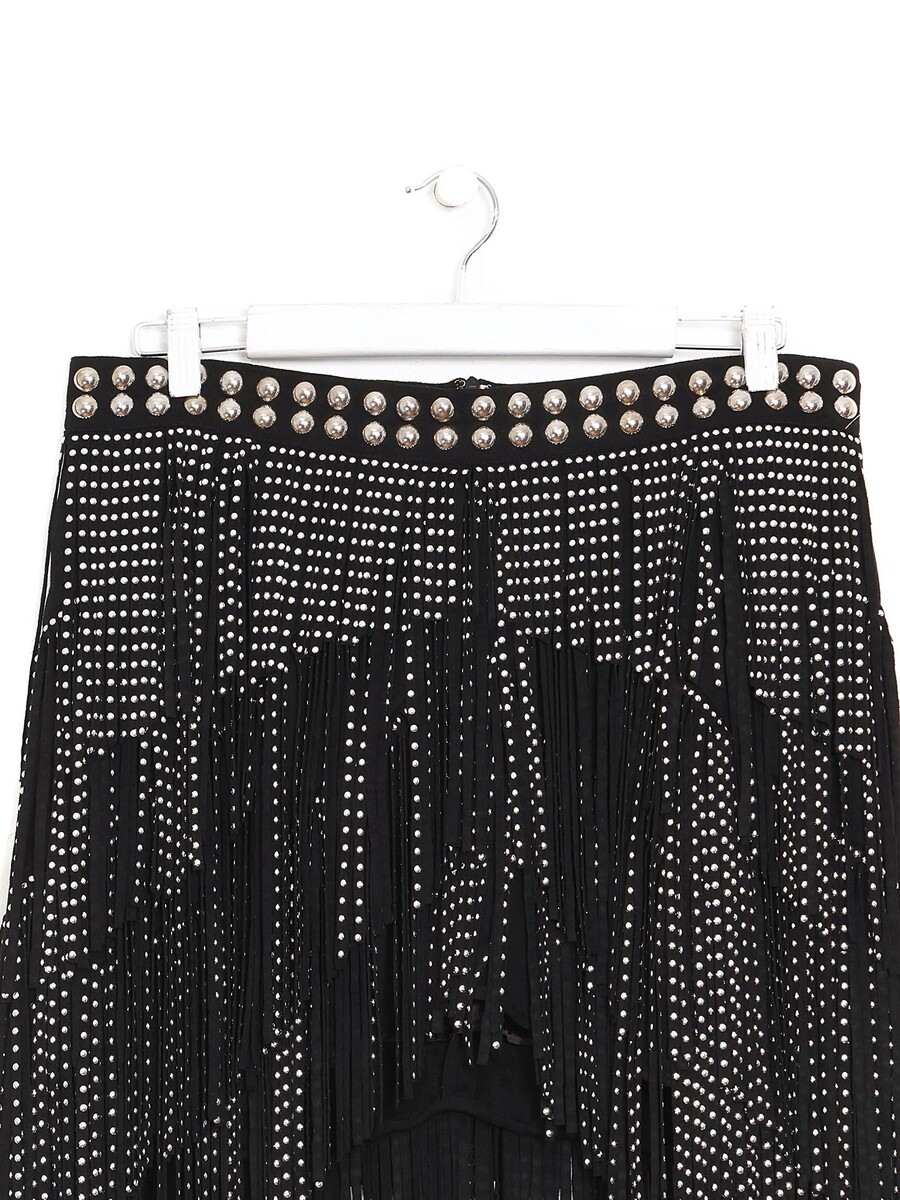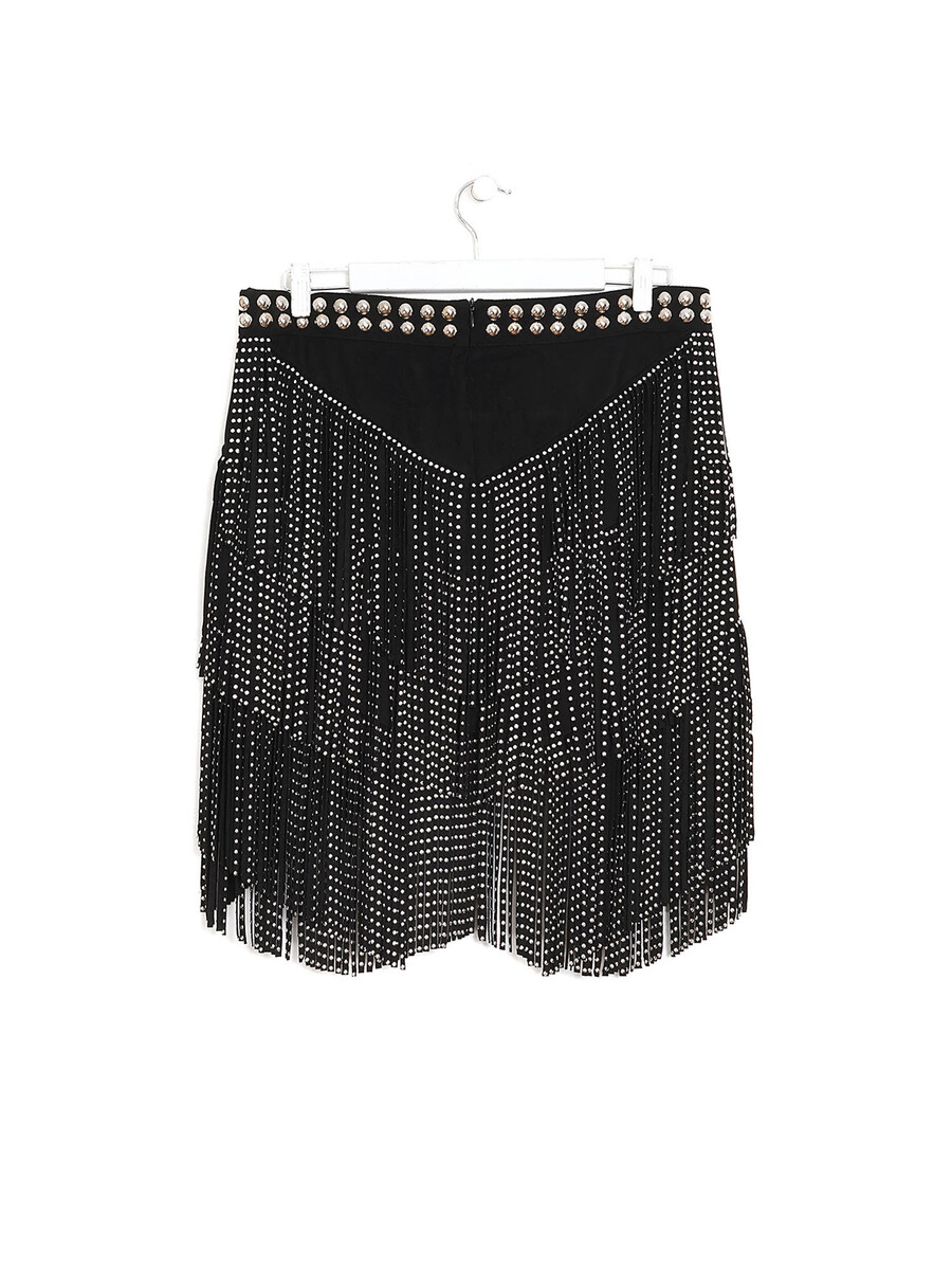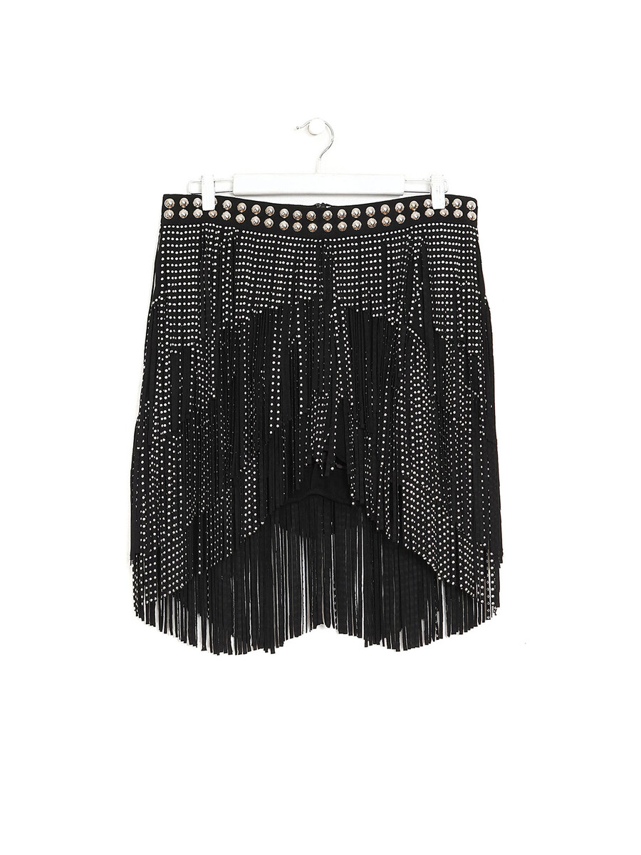 Mini skirt in black faux suede embellished with studs and fringe detailing throughout. High-waisted fit. Concealed zip closure at the side.