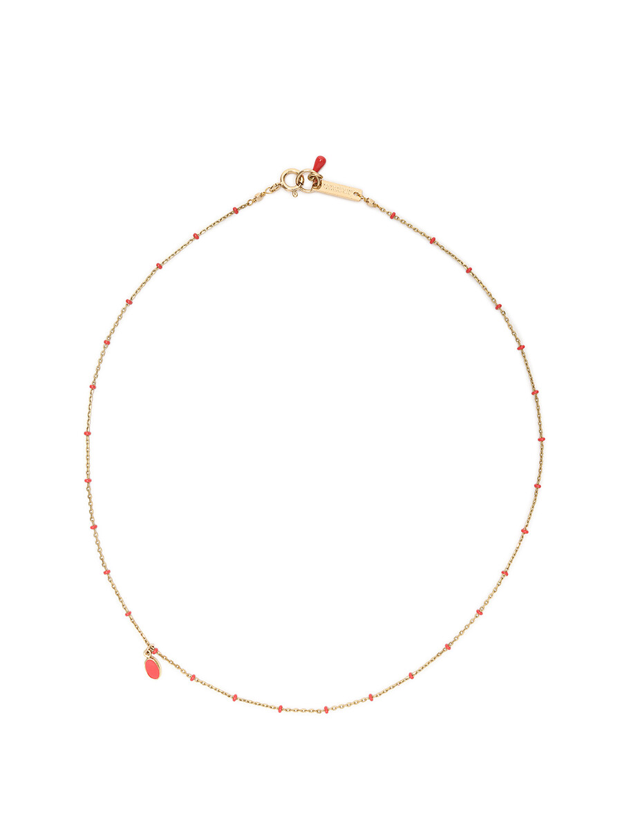 Gold-tone necklace featuring a delicate chain with a red teardrop charm and beads. Crafted from brass and resin. Includes a pouch.