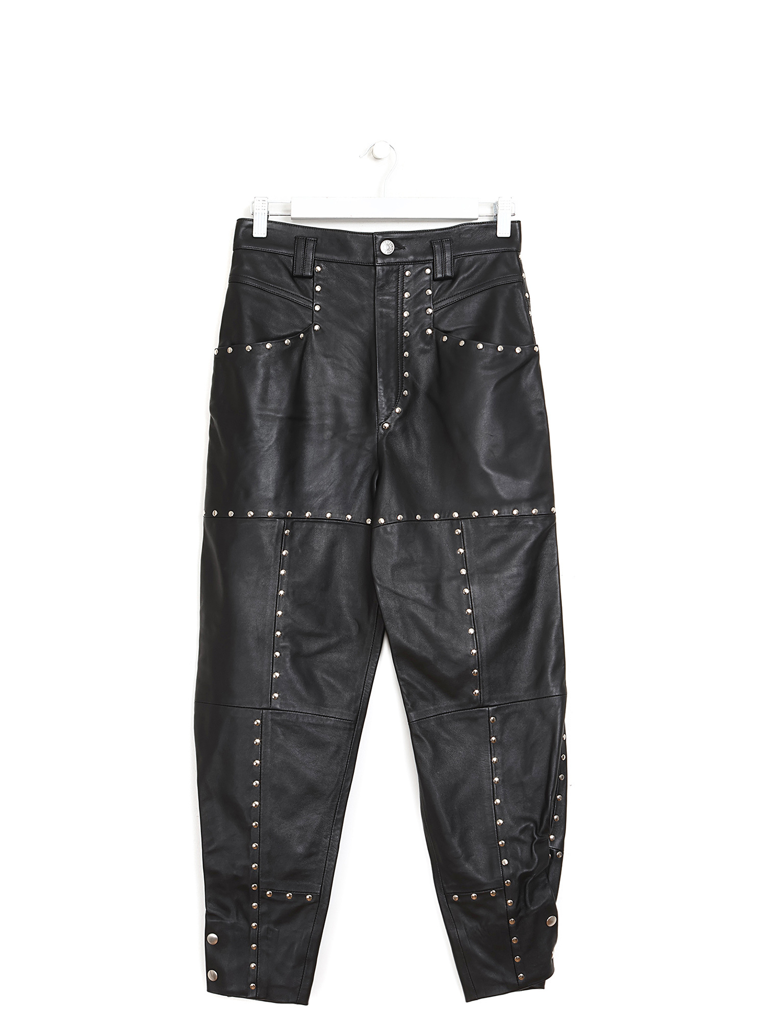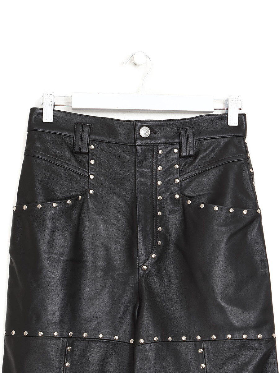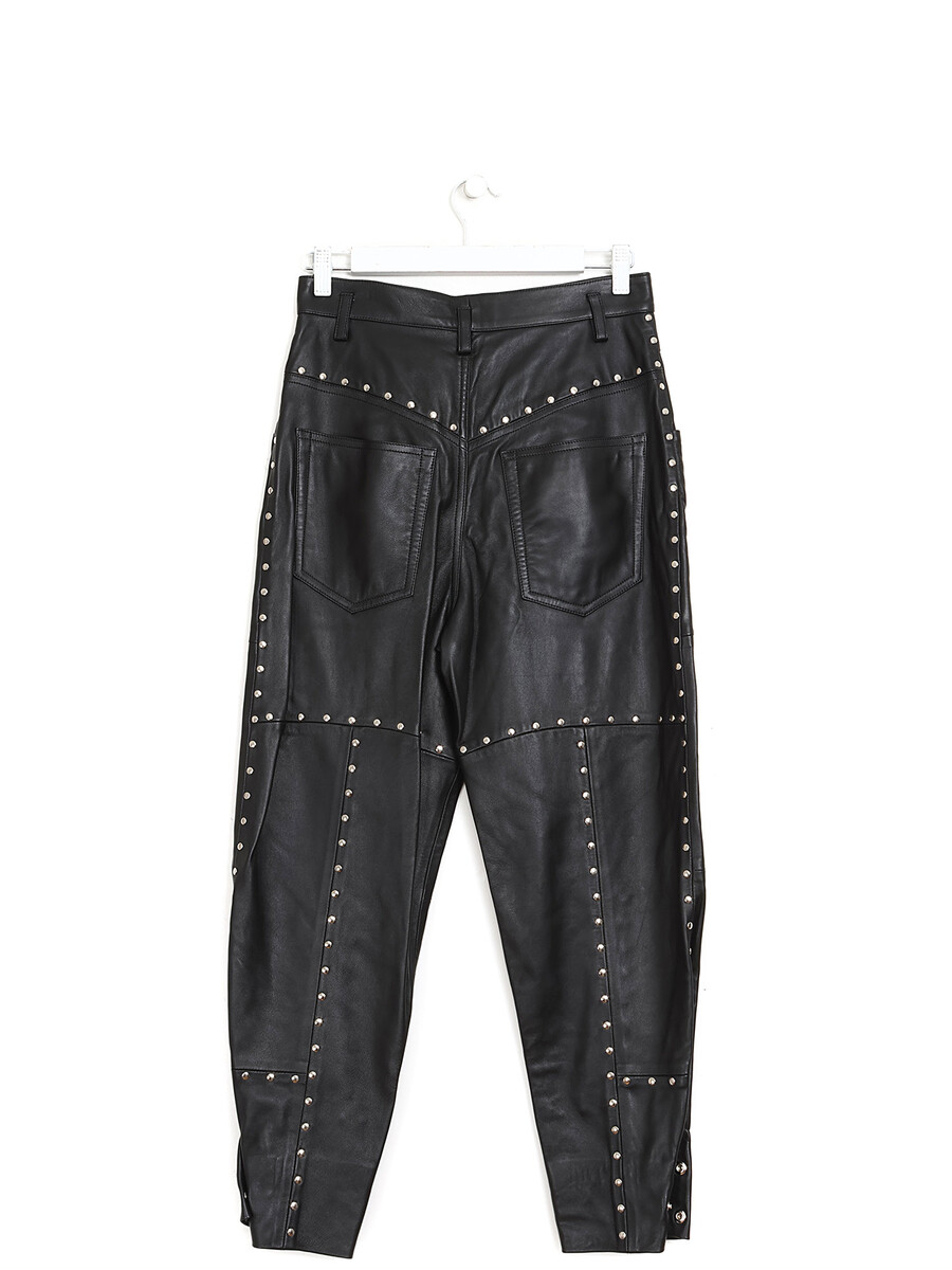 Studded leather pants in black. Button front closure. High rise waist. Front and back pockets.
