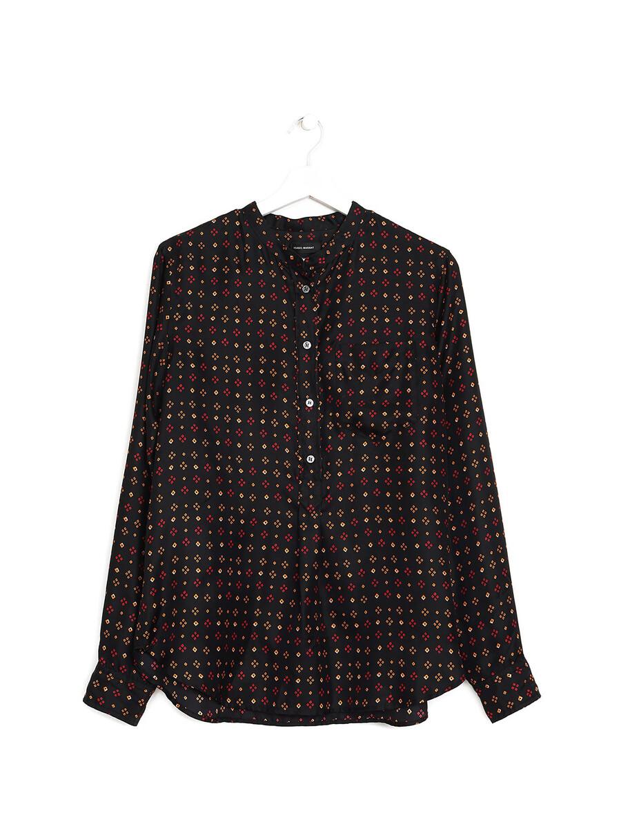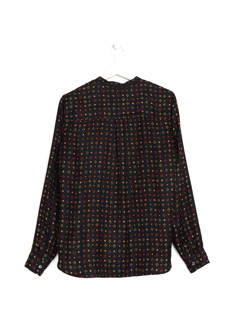 Long sleeve silk blouse featuring geometric pattern in black, red, and yellow. V-neckline. Lightweight and fluid design.