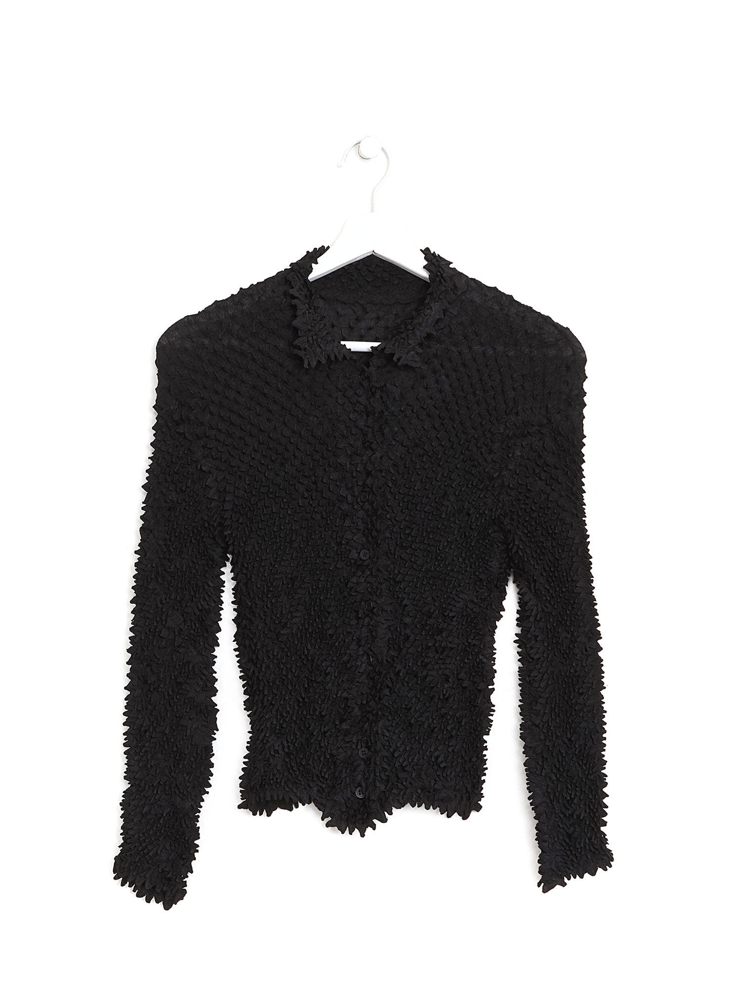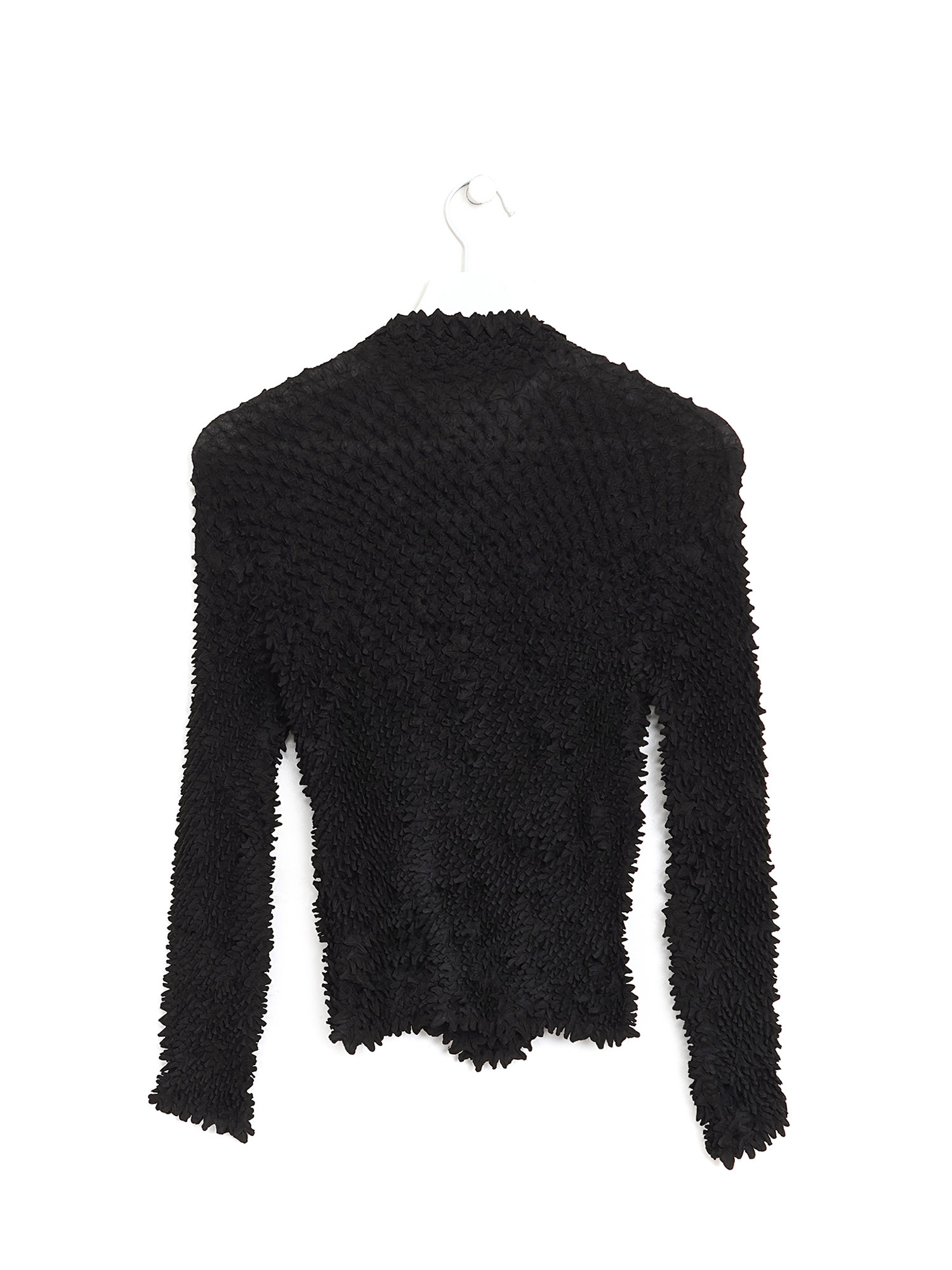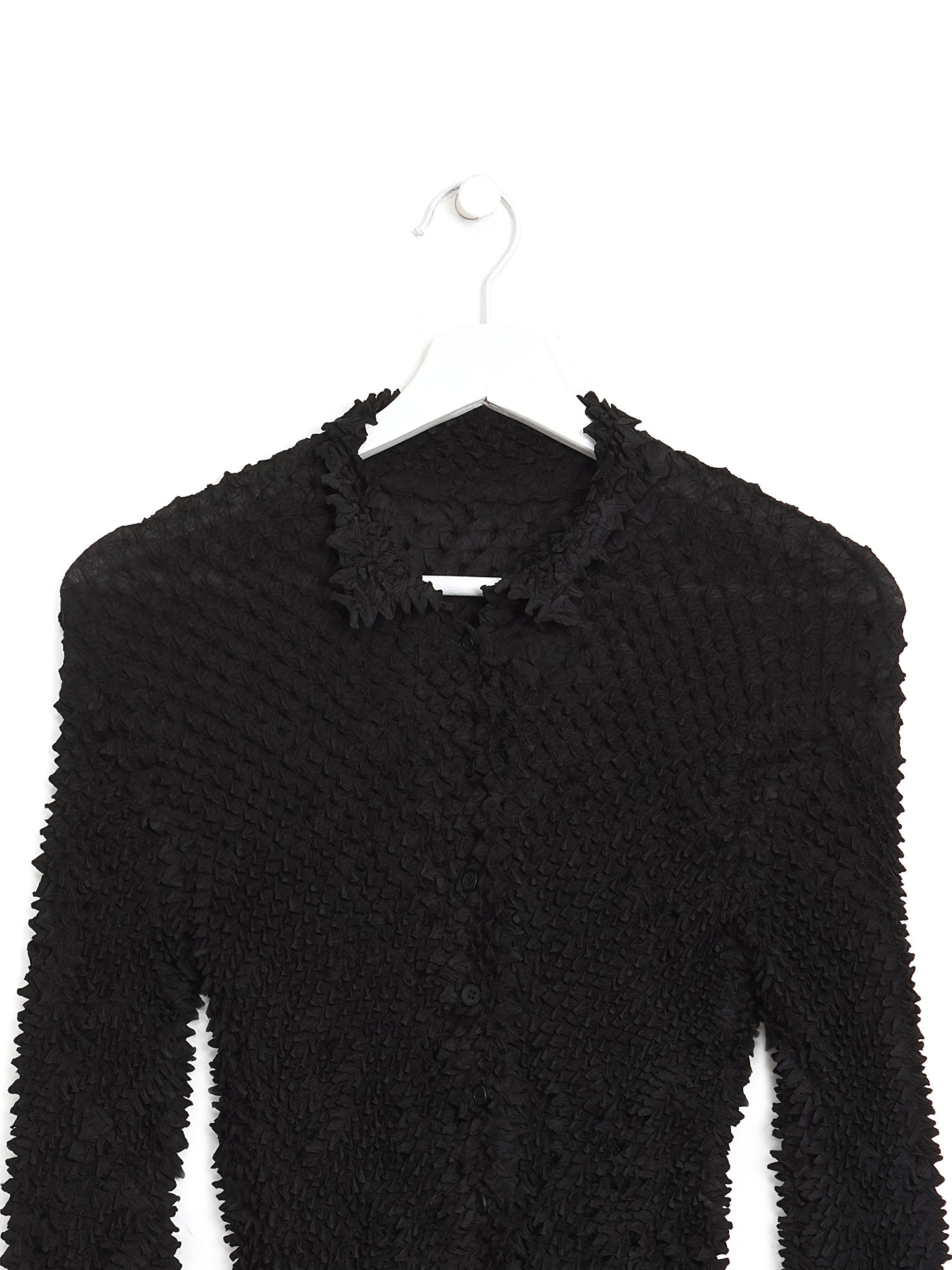 Textured long sleeve blouse in black. Button closure. High collar. Modern and sophisticated design.