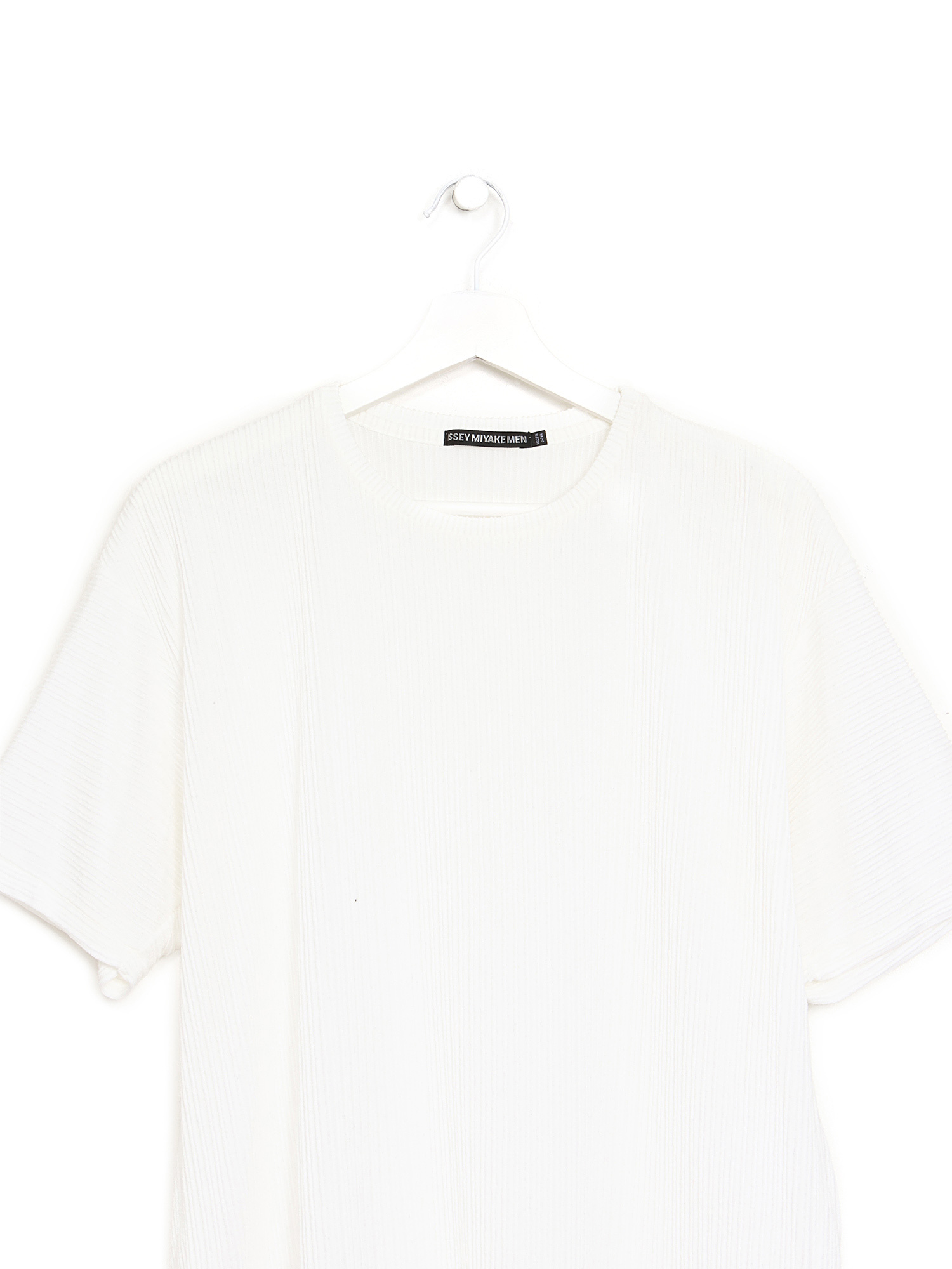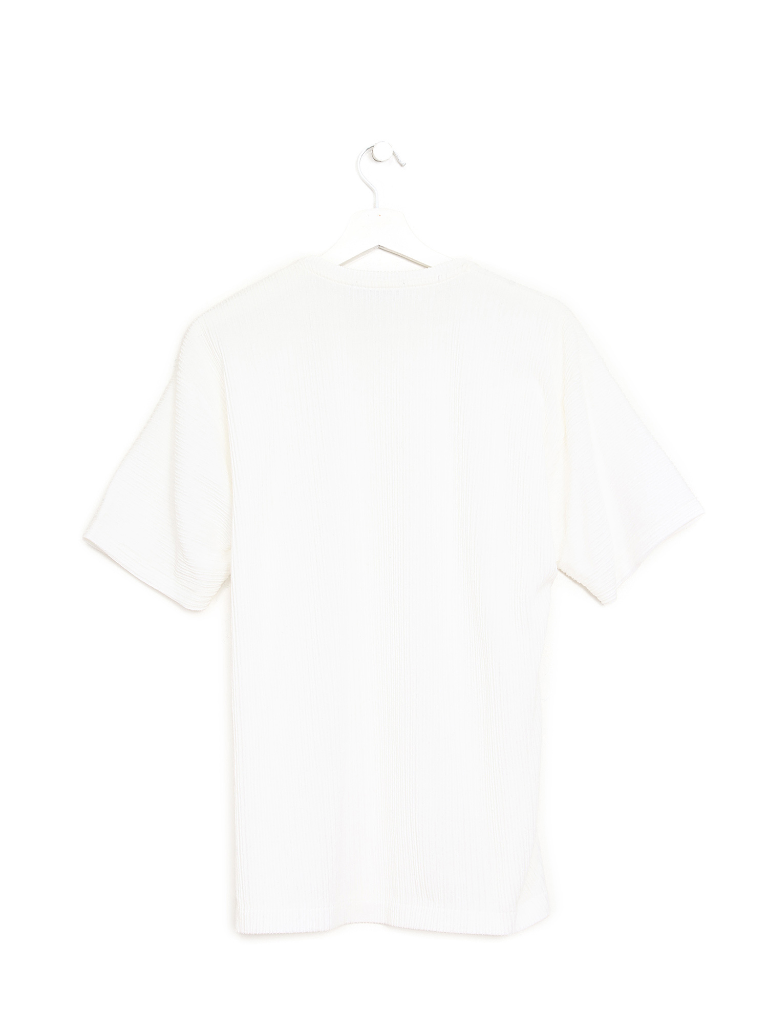 Short sleeve pleated top in white. Features a unique pleated texture. Crew neck. Relaxed fit.