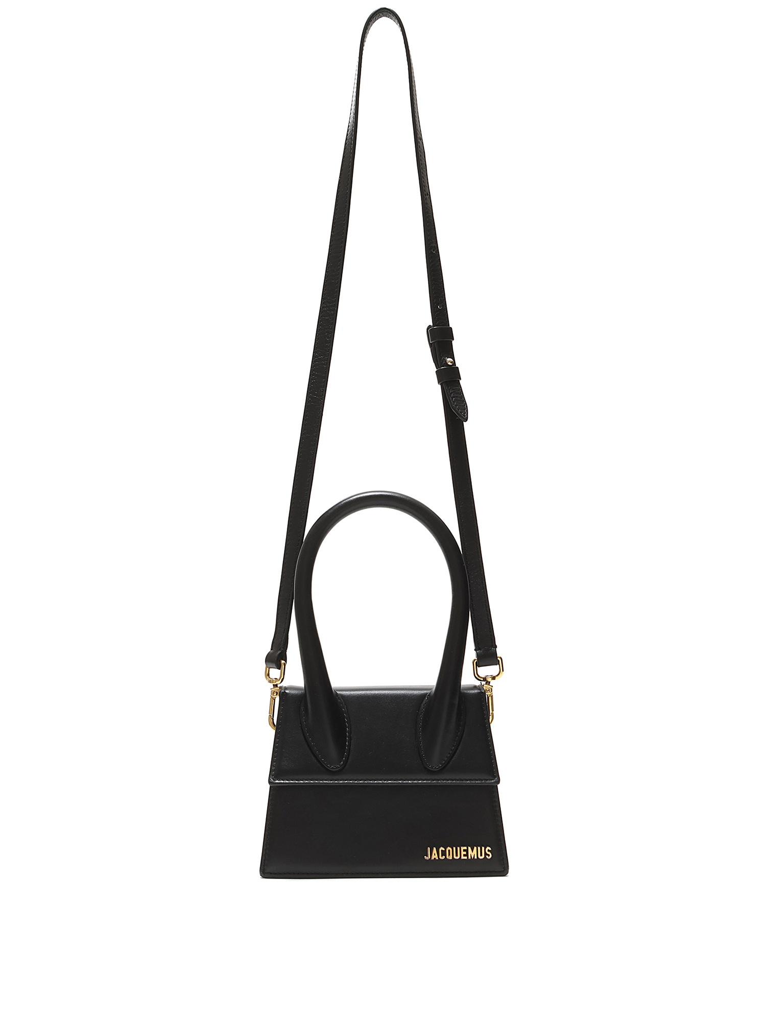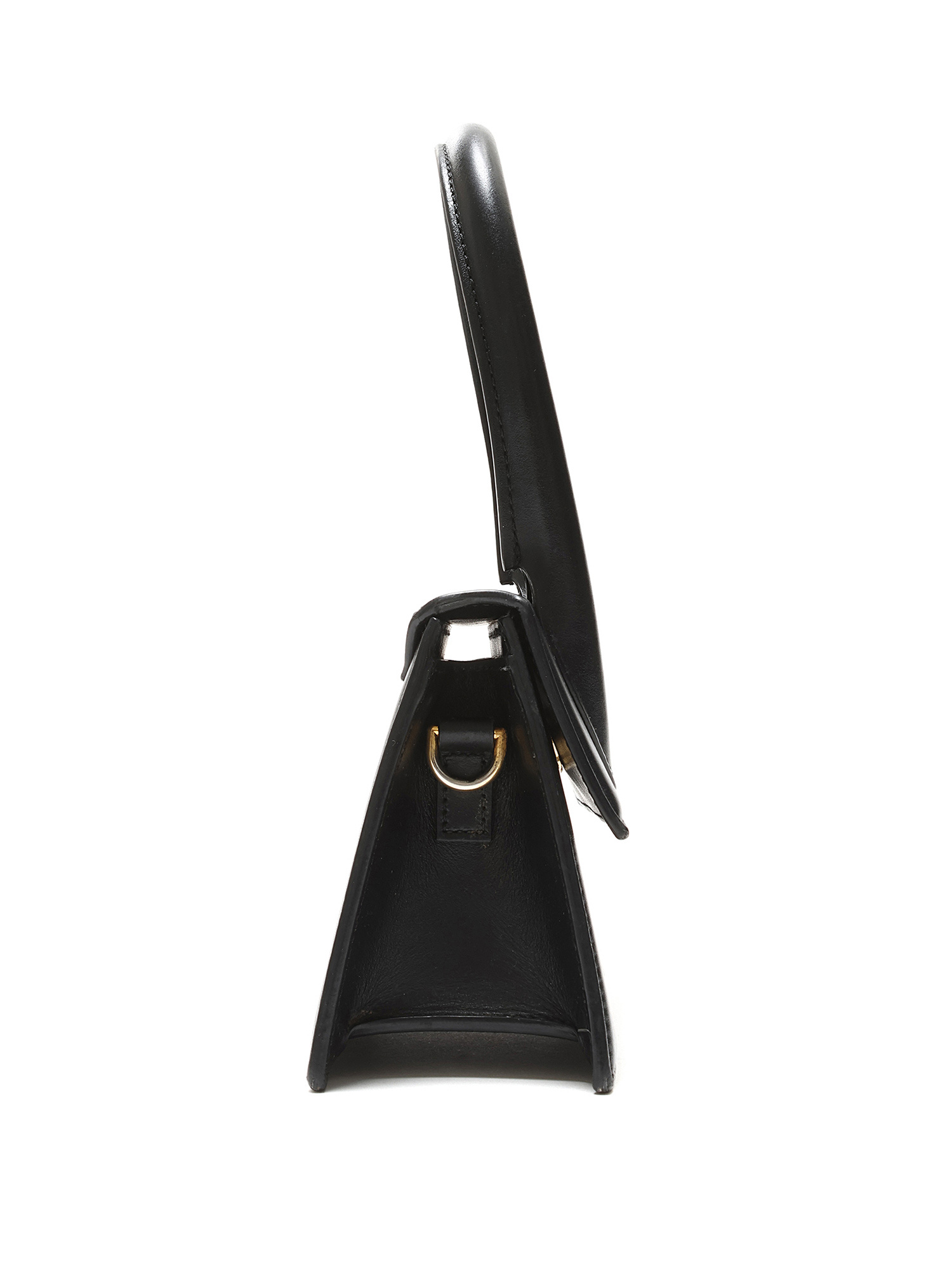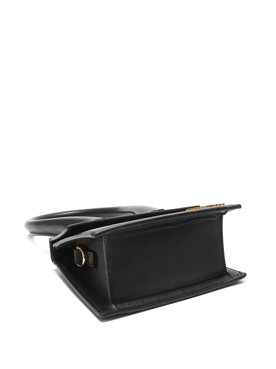 Leather mini handbag in black. Gold-tone logo with tonal stitching. Magnetic snap closure. Features top handles and detachable shoulder strap. Gold-tone hardware.