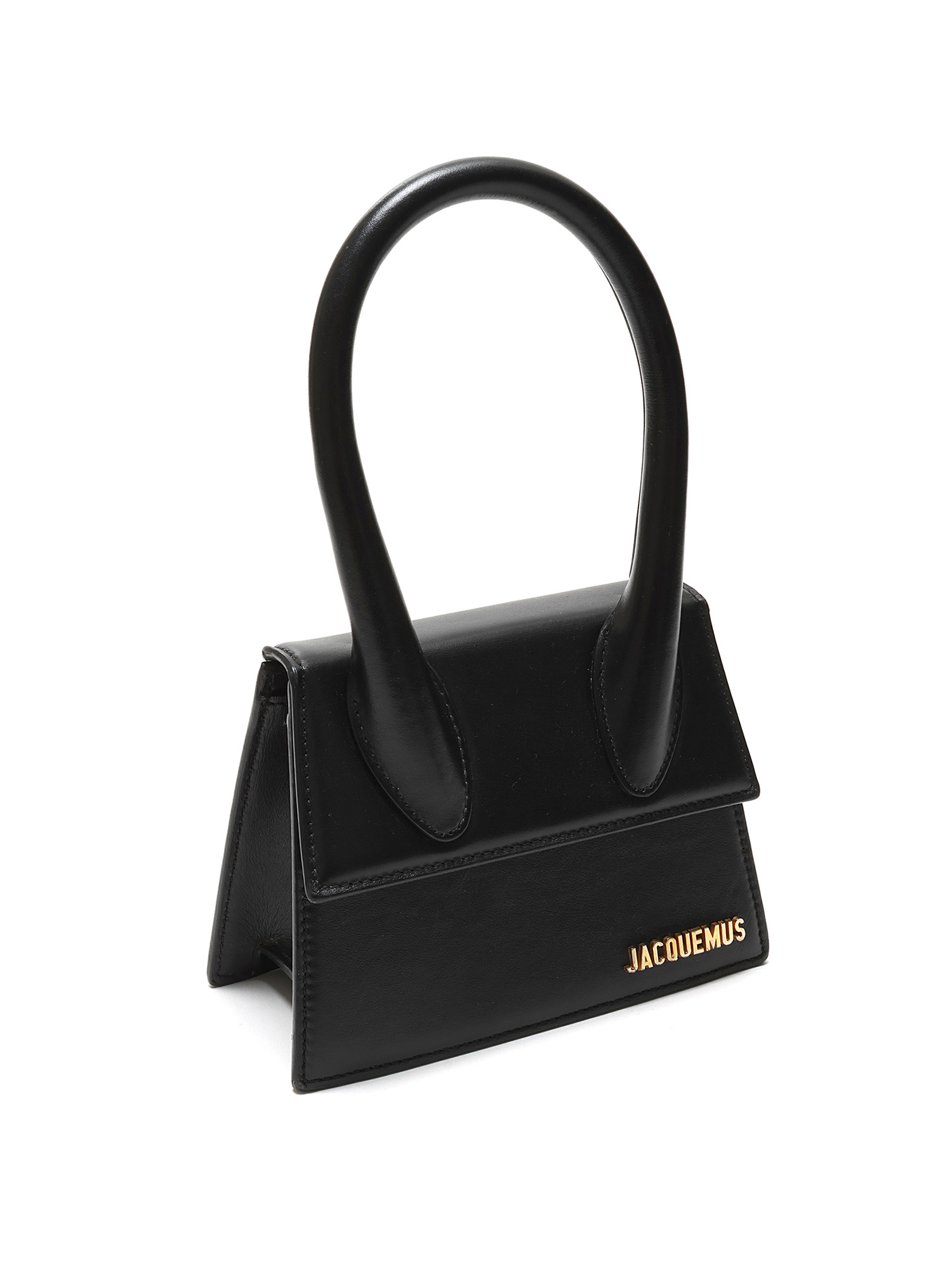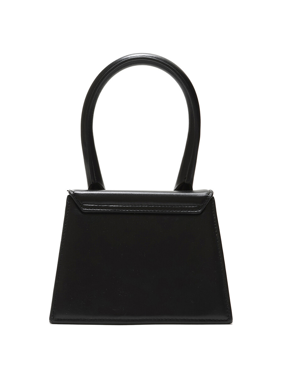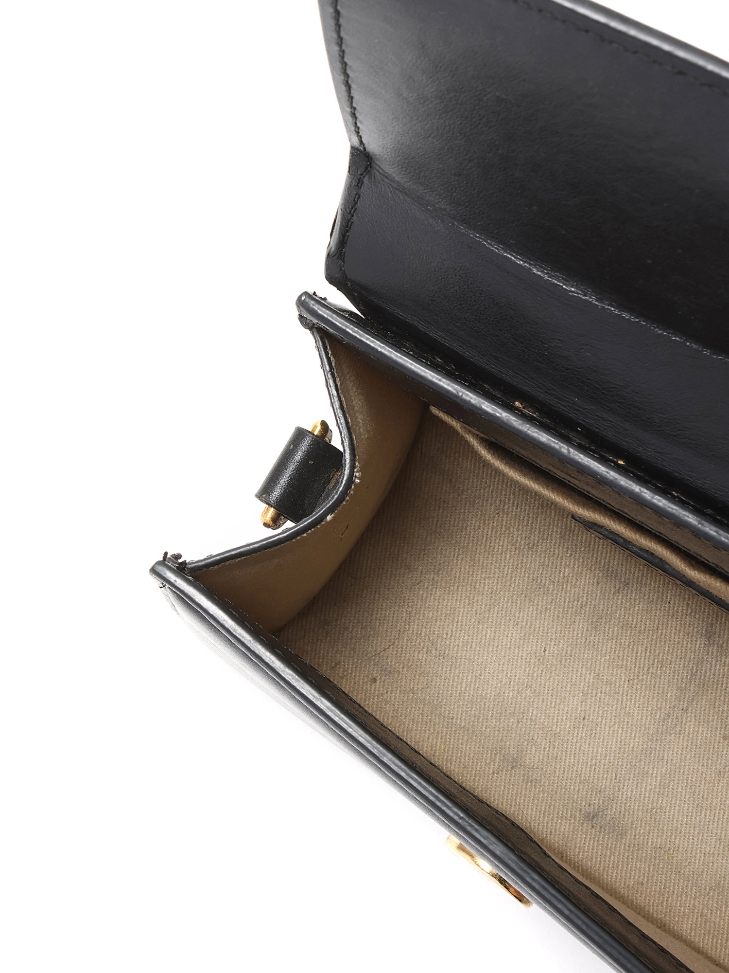 Leather mini handbag in black. Gold-tone logo with tonal stitching. Magnetic snap closure. Features top handles and detachable shoulder strap. Gold-tone hardware.