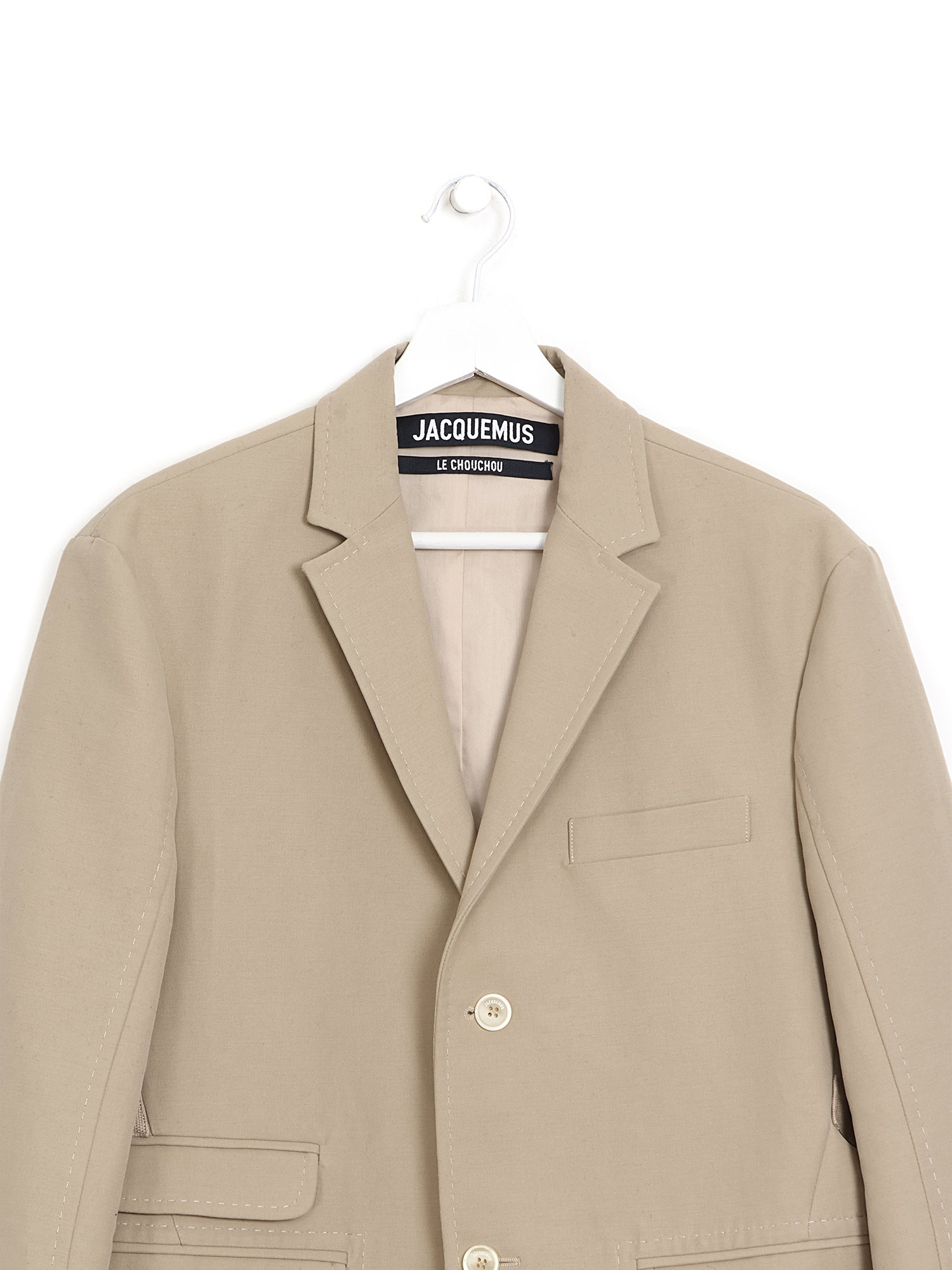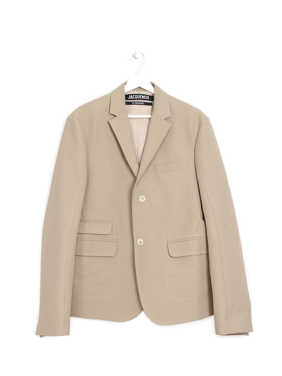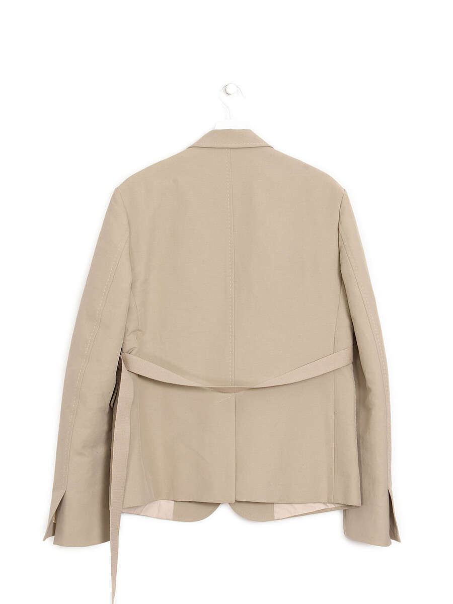 Long sleeve beige blazer featuring belt details and a shirt collar. Includes patch pockets with flaps.