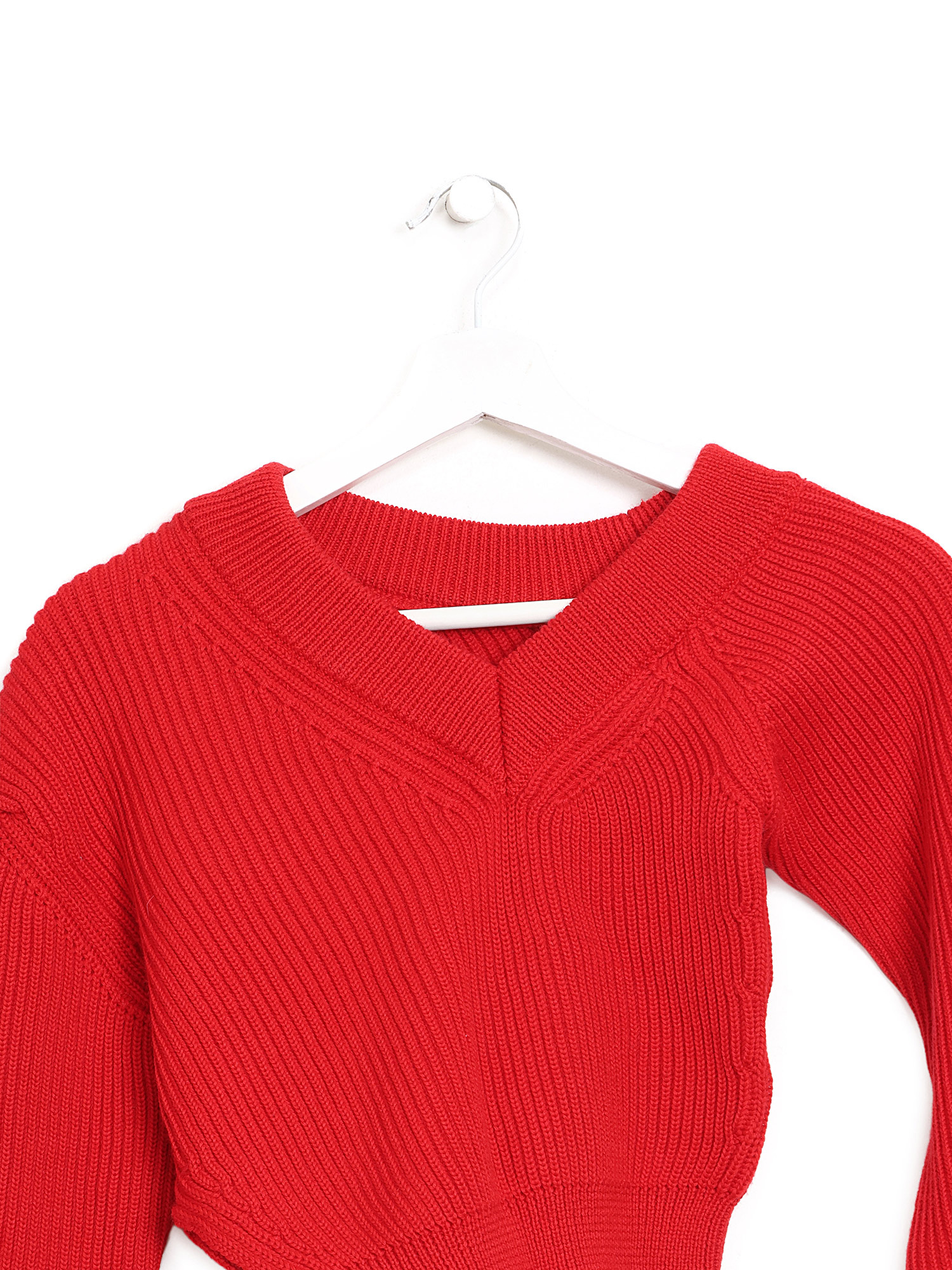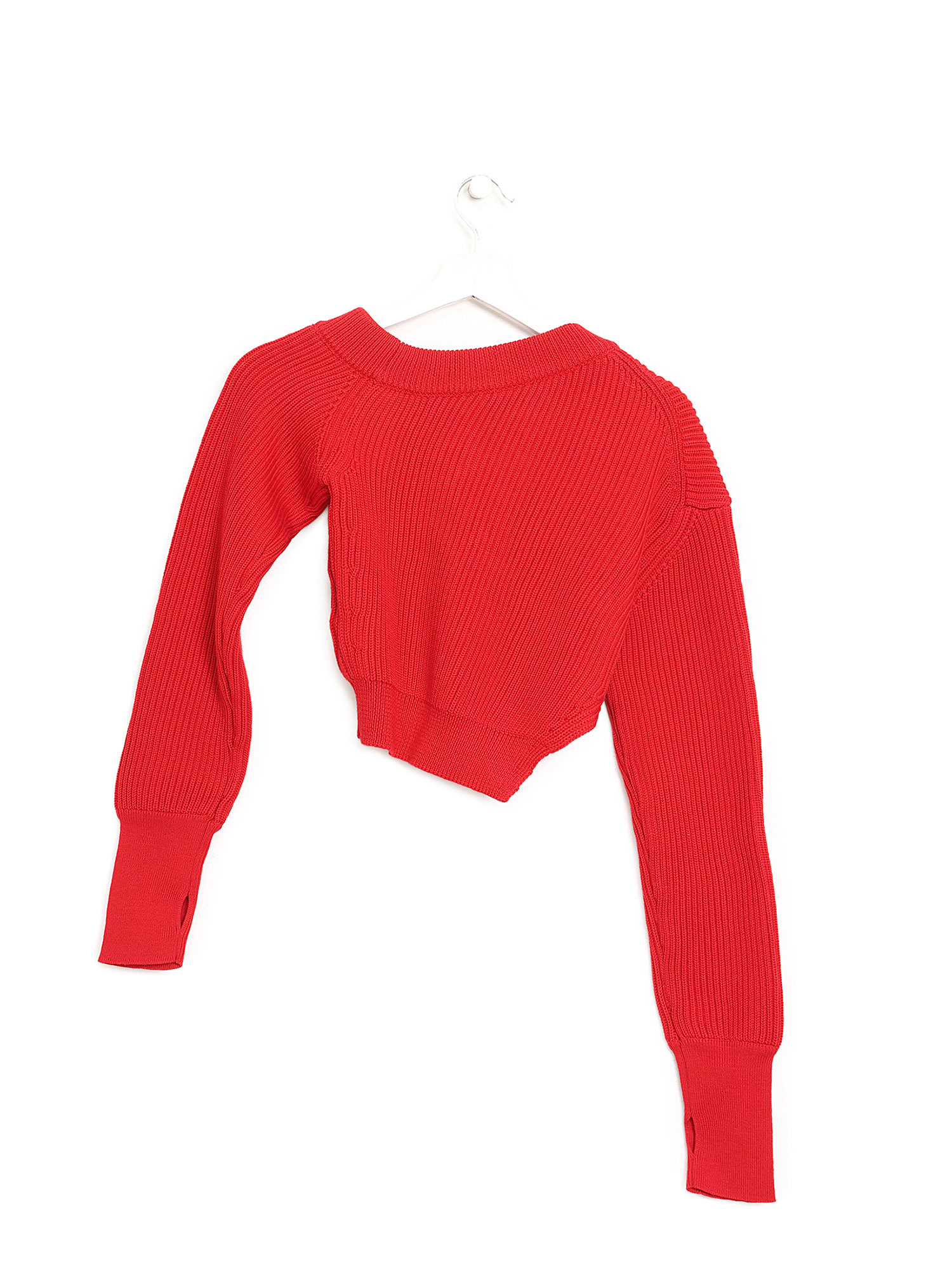 Ribbed knit cropped sweater in vibrant red. Features an adjustable cinch shoulder strap. V-neck collar. Fitted silhouette.