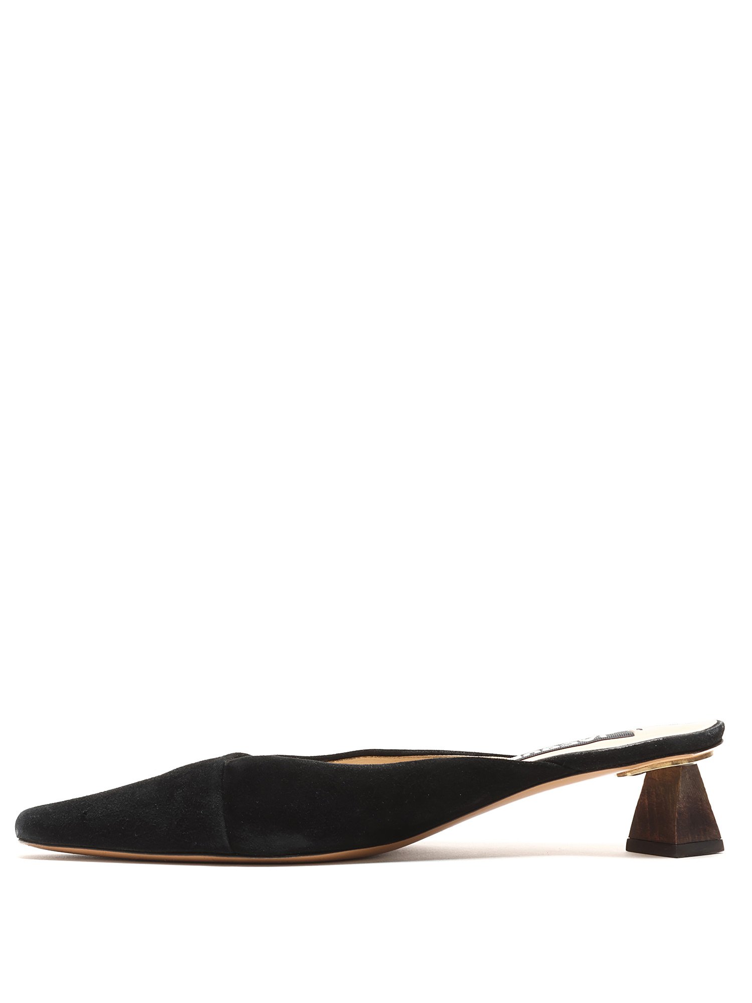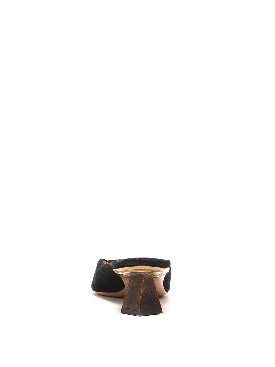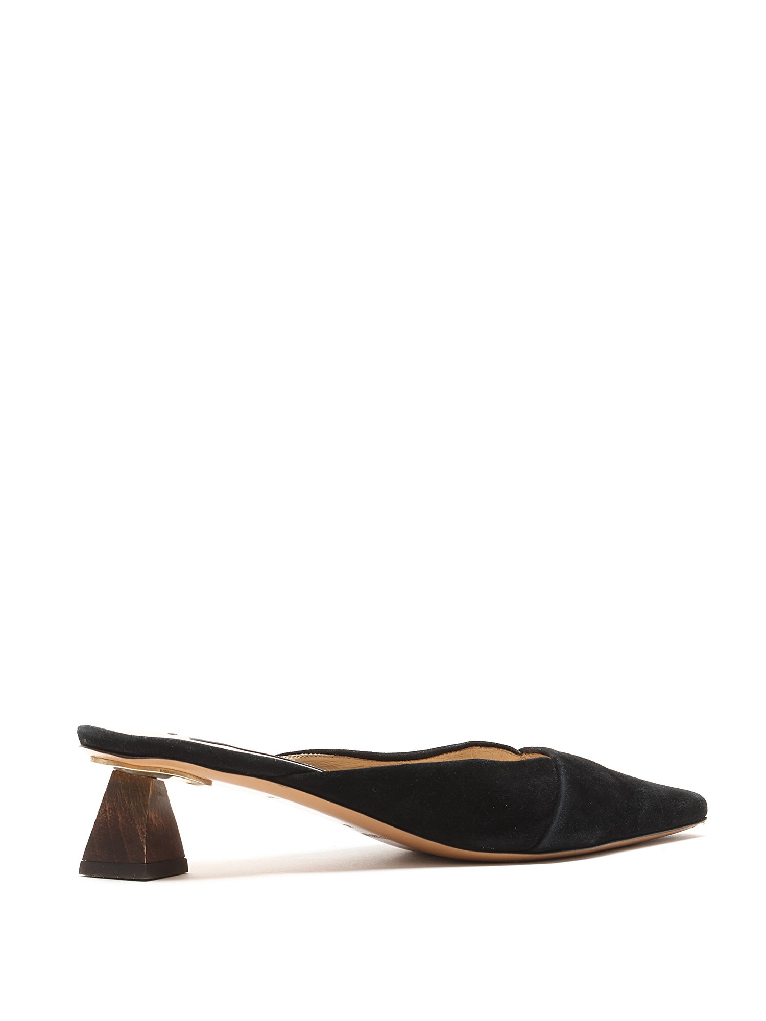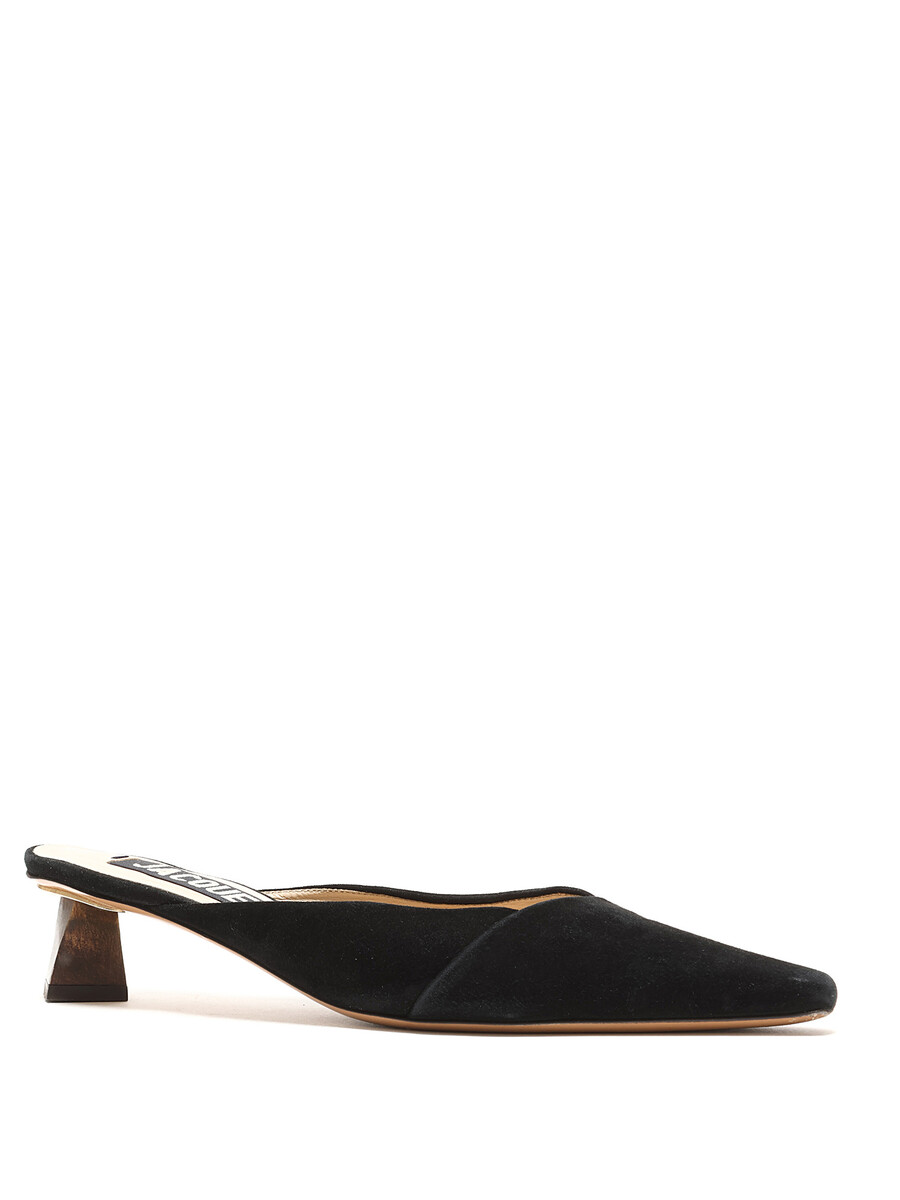 Pointed-toe suede mules in black. Leather sole. Minimalist design with subtle elegance.