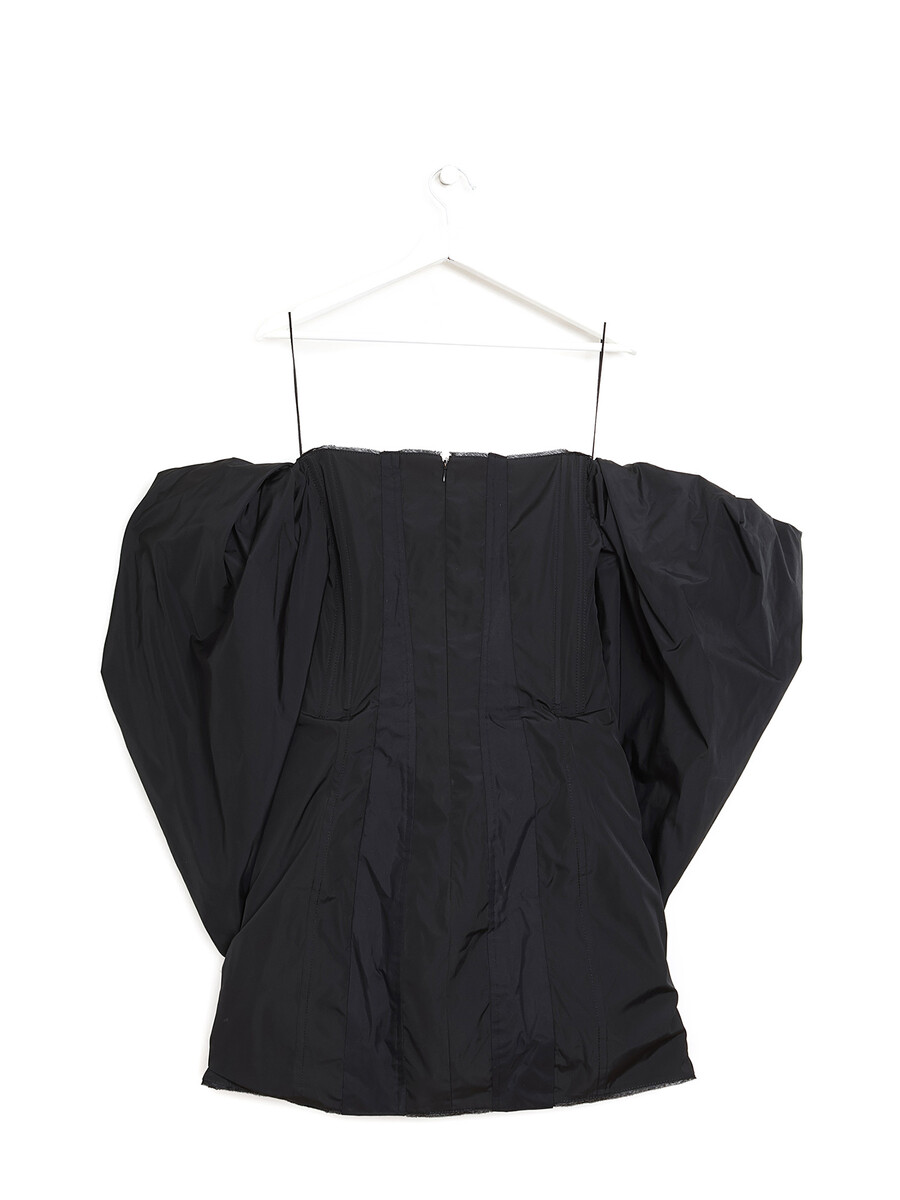 Mini black dress featuring puffed sleeves. Features a fitted silhouette.