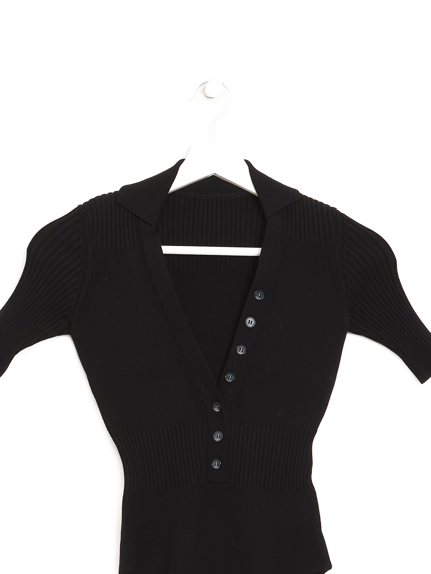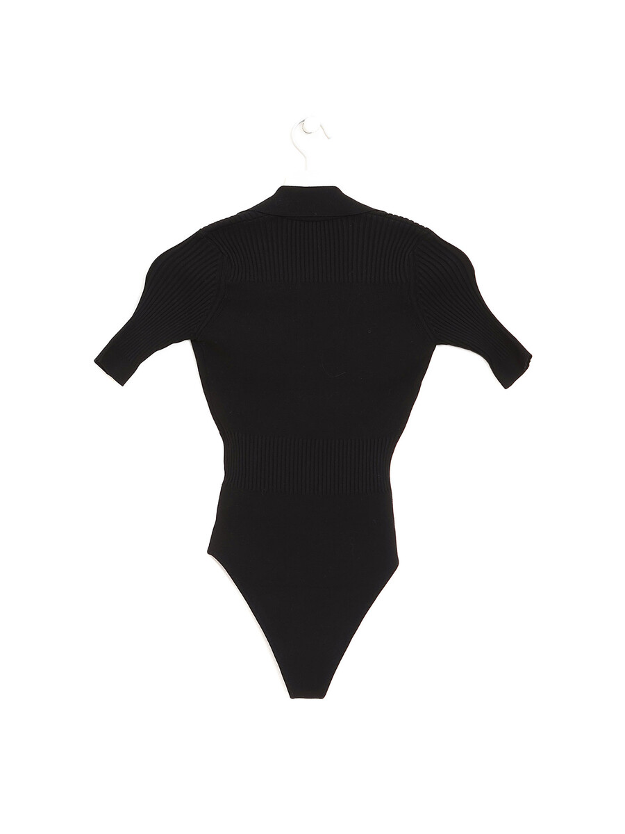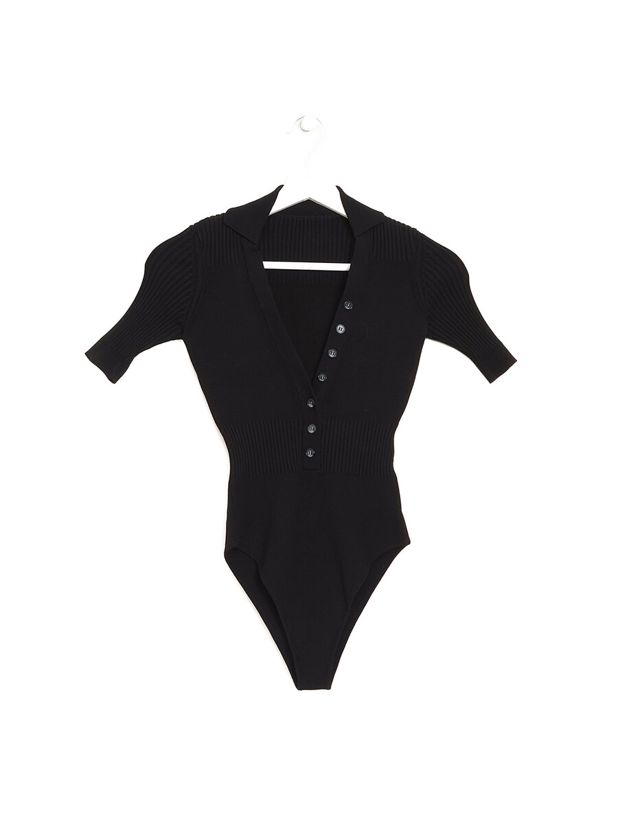 Long sleeve bodysuit with button front closure in black. Stretch fabric. Fitted silhouette.