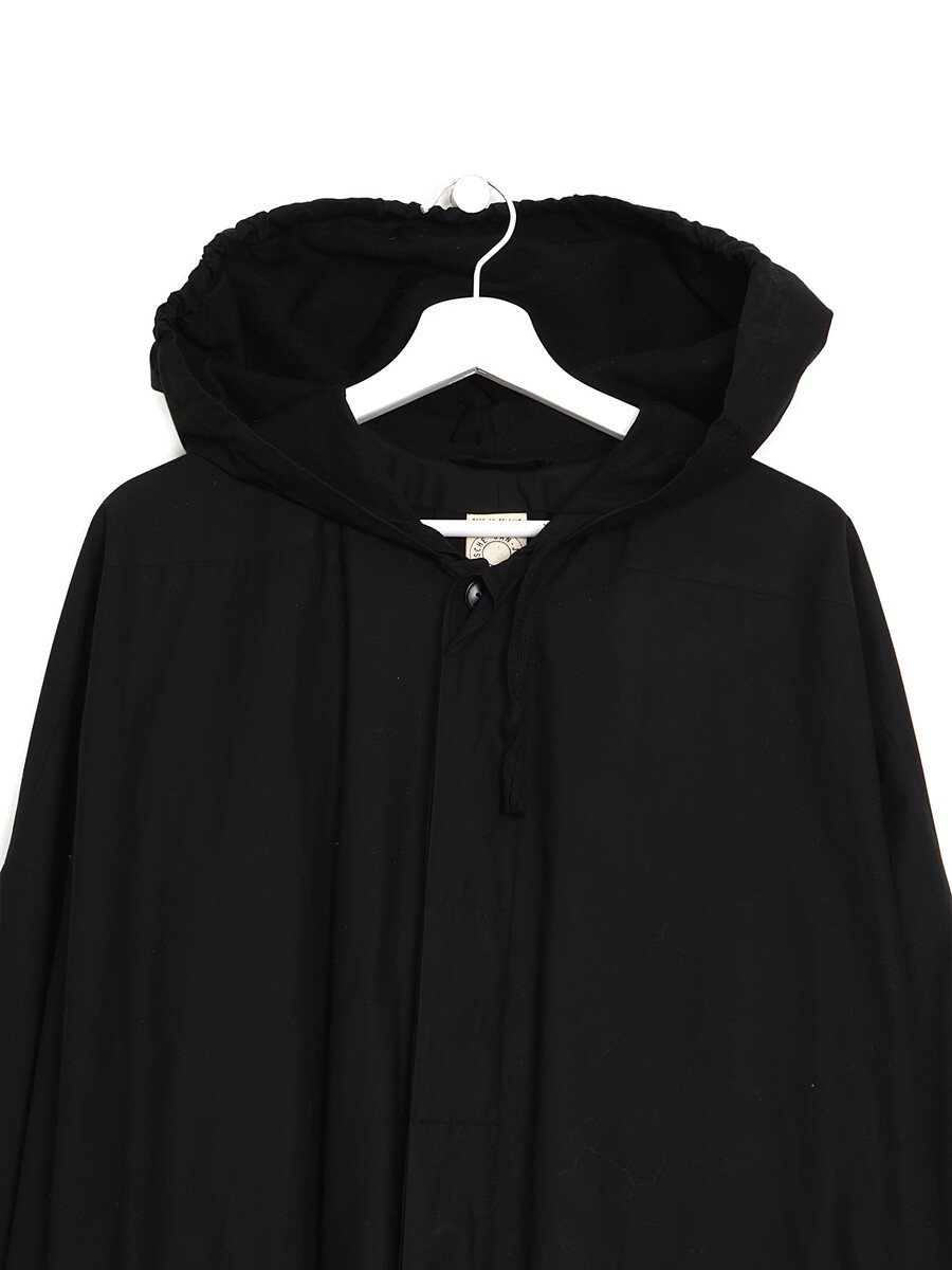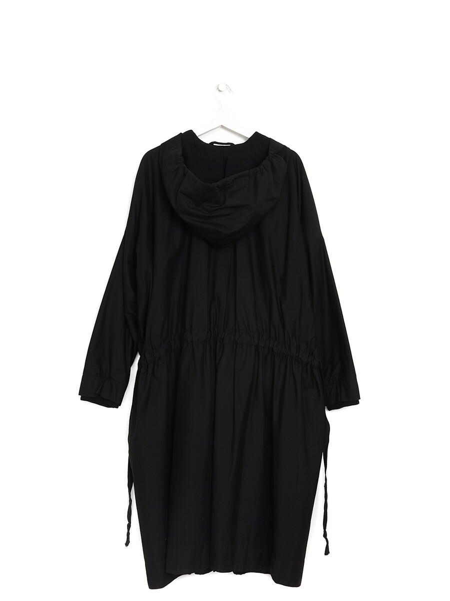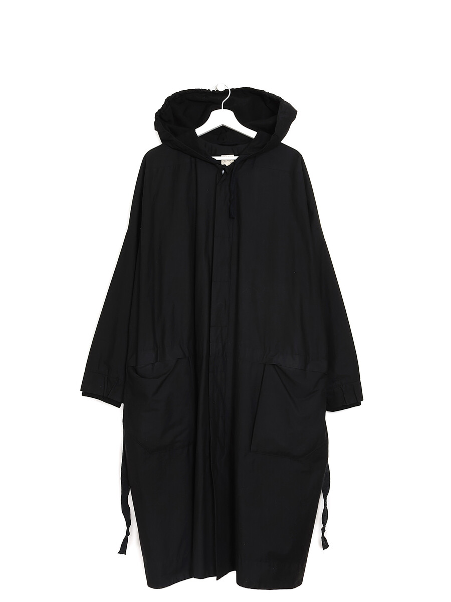 Black long sleeve jacket with knitted cuffs. Button closure. Round collar. Two pockets.