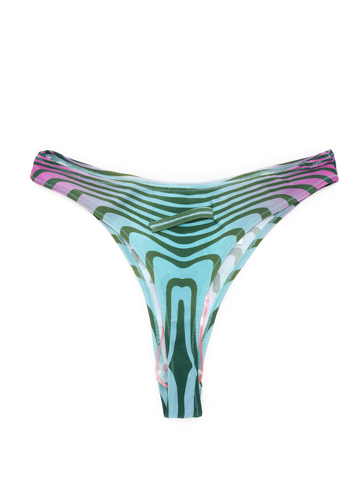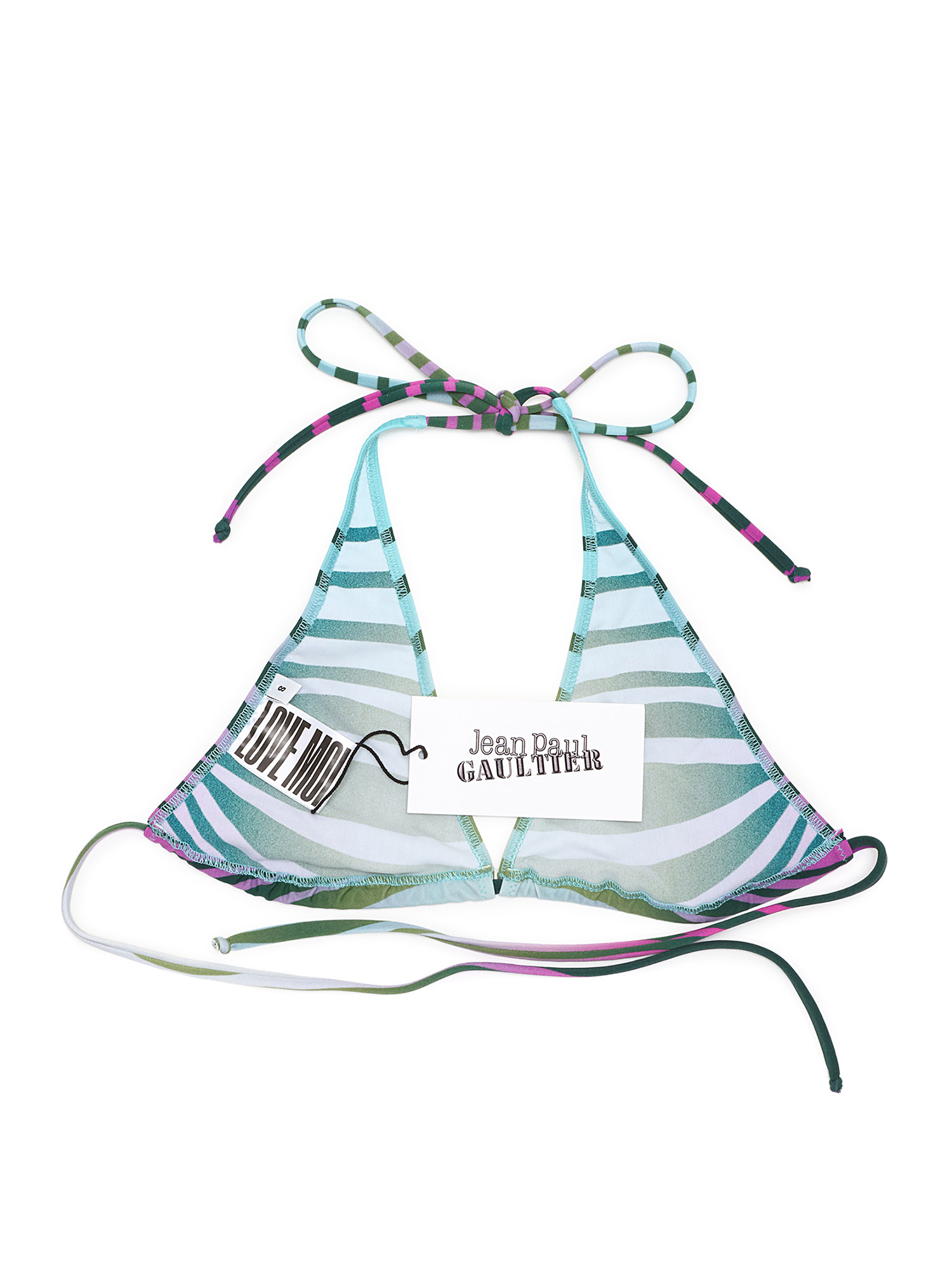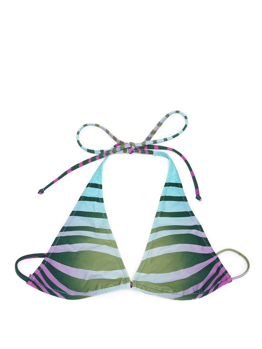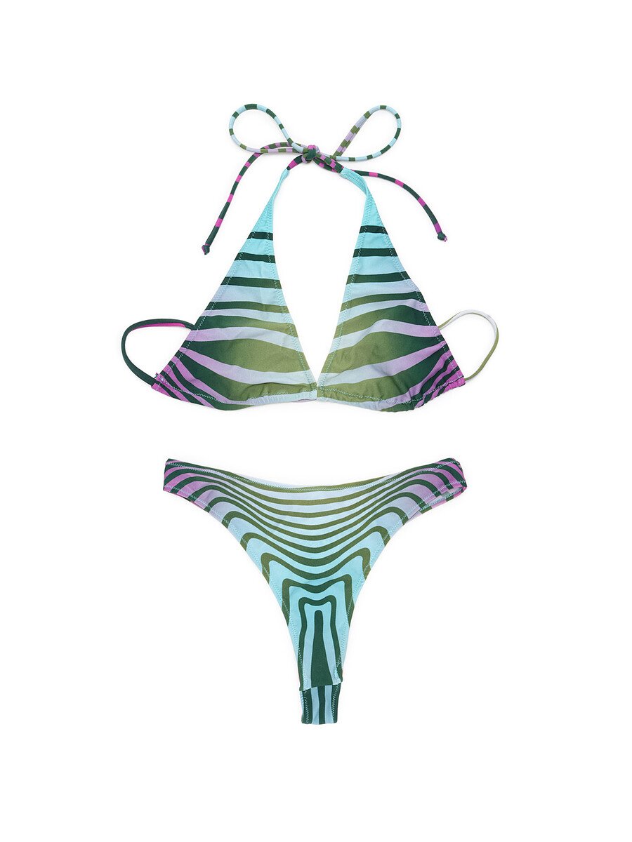 Multicolored striped bikini set. Includes bikini top with adjustable straps and matching bottoms.