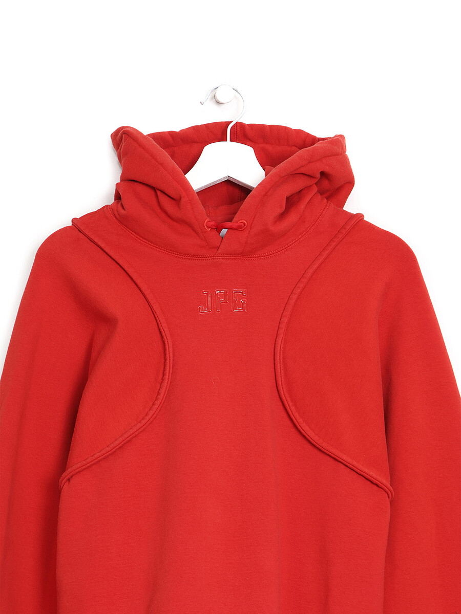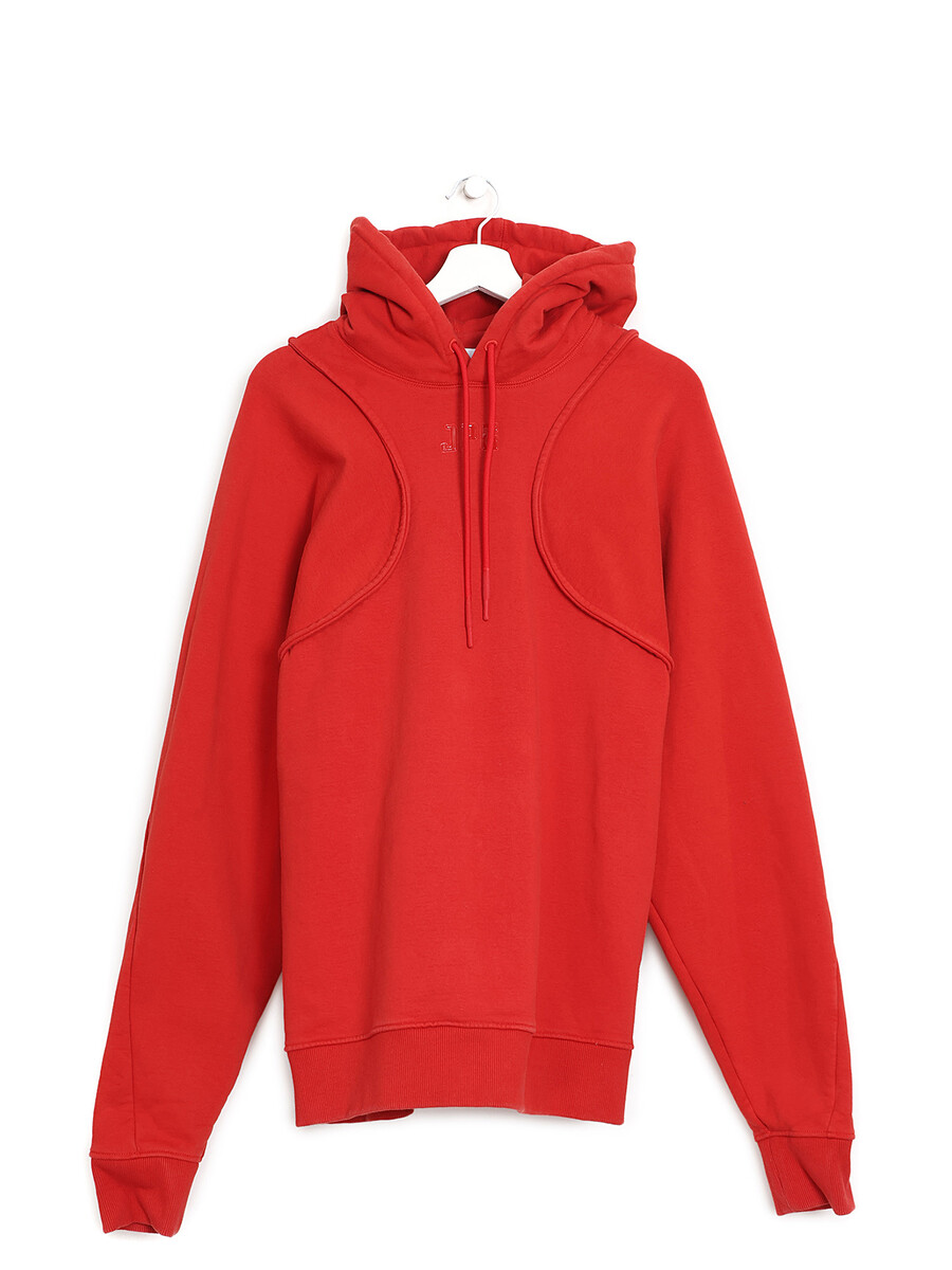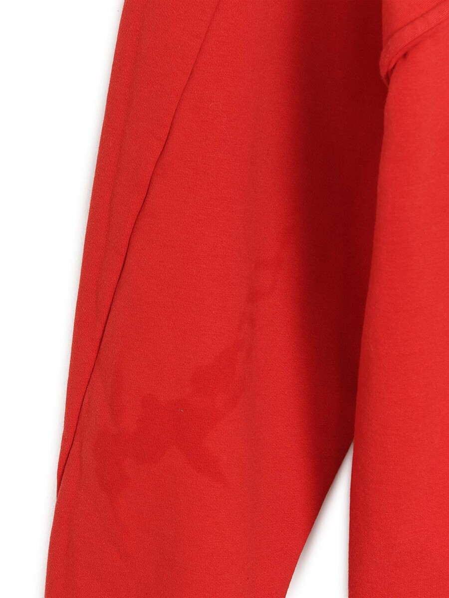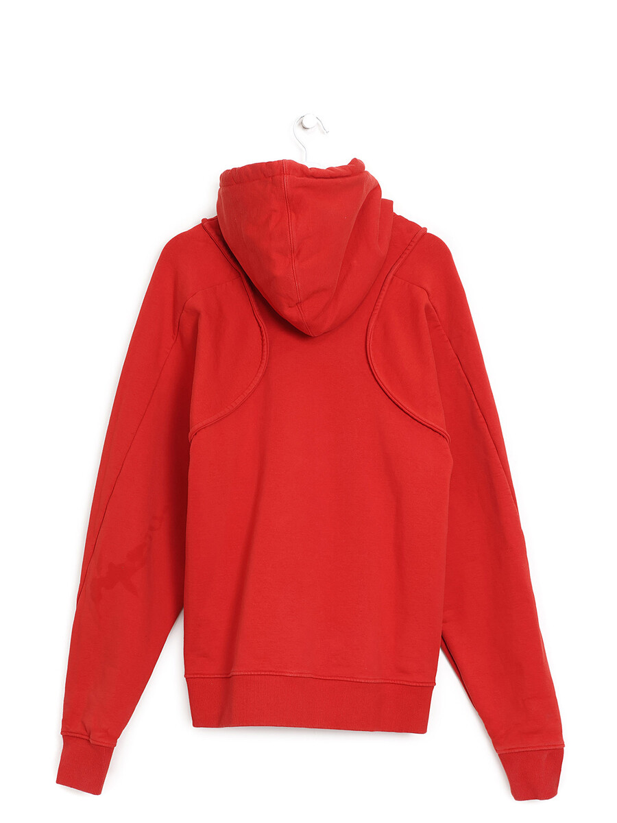 Red hooded zip-up hoodie with tonal logo. Adjustable drawstring hood. Casual fit. Front pockets.