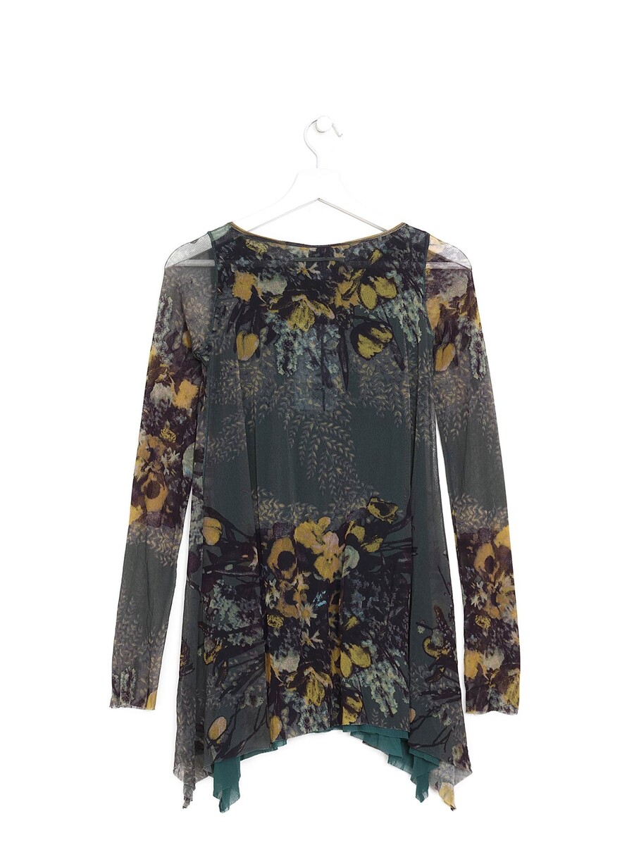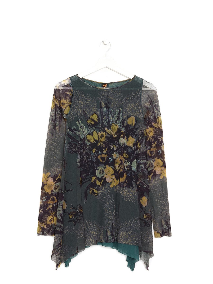 Mesh long sleeve top with a vibrant floral print. Round collar. Lightweight and semi-sheer.