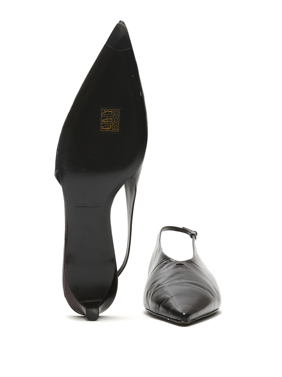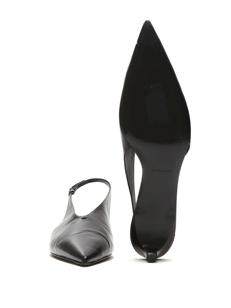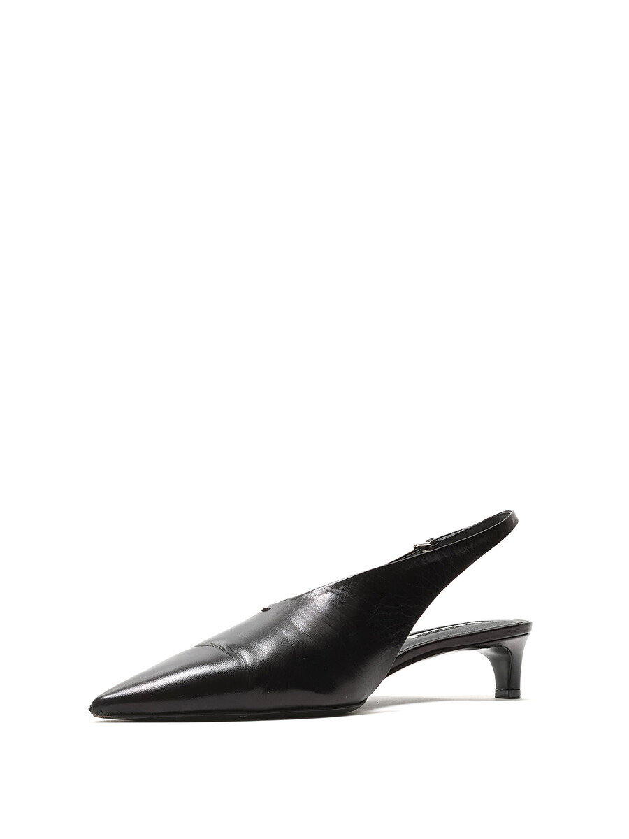 Black leather pointed-toe pumps with silver-tone hardware. Leather sole. Includes extra heel tips, dust bag, and box.