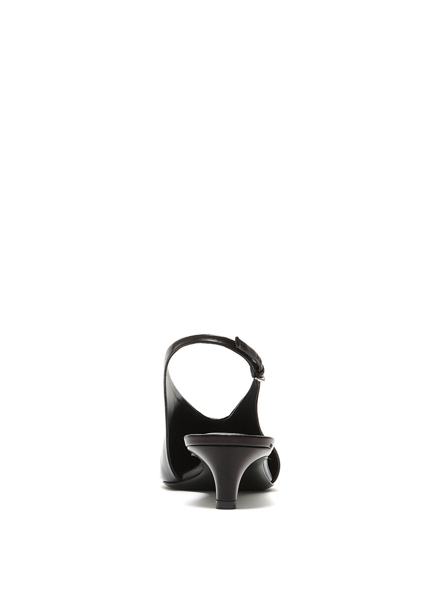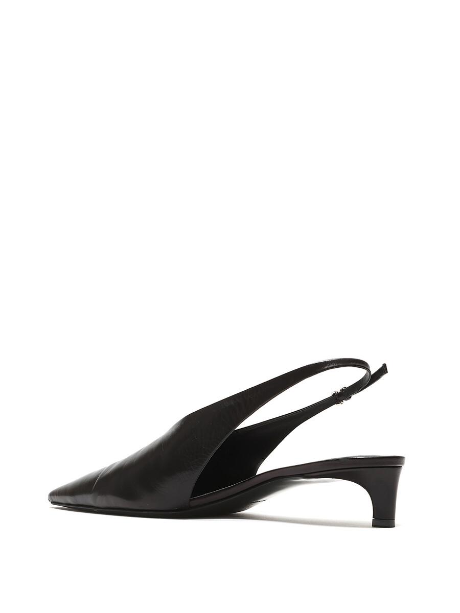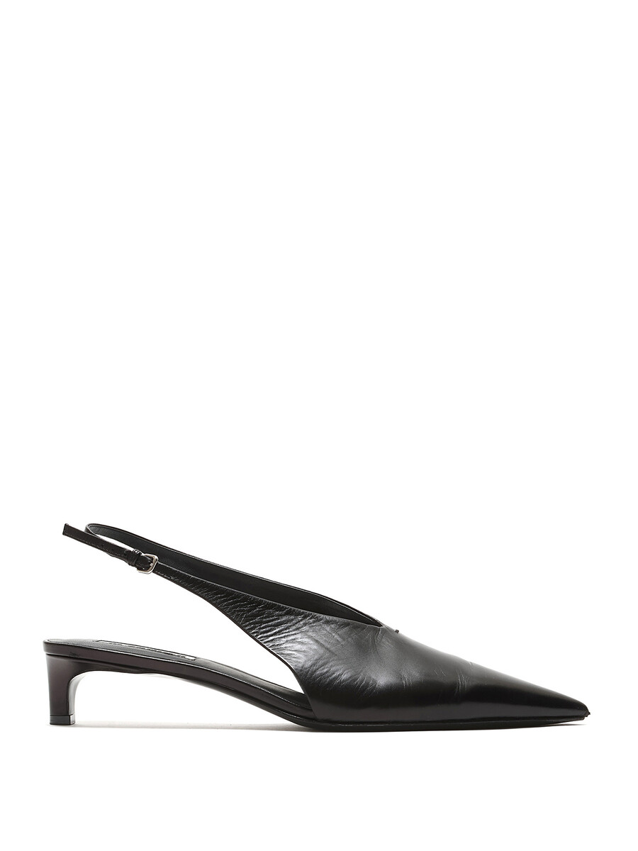Black leather pointed-toe pumps with silver-tone hardware. Leather sole. Includes extra heel tips, dust bag, and box.