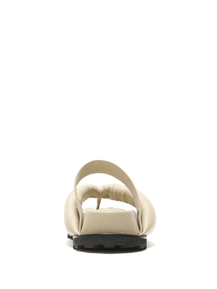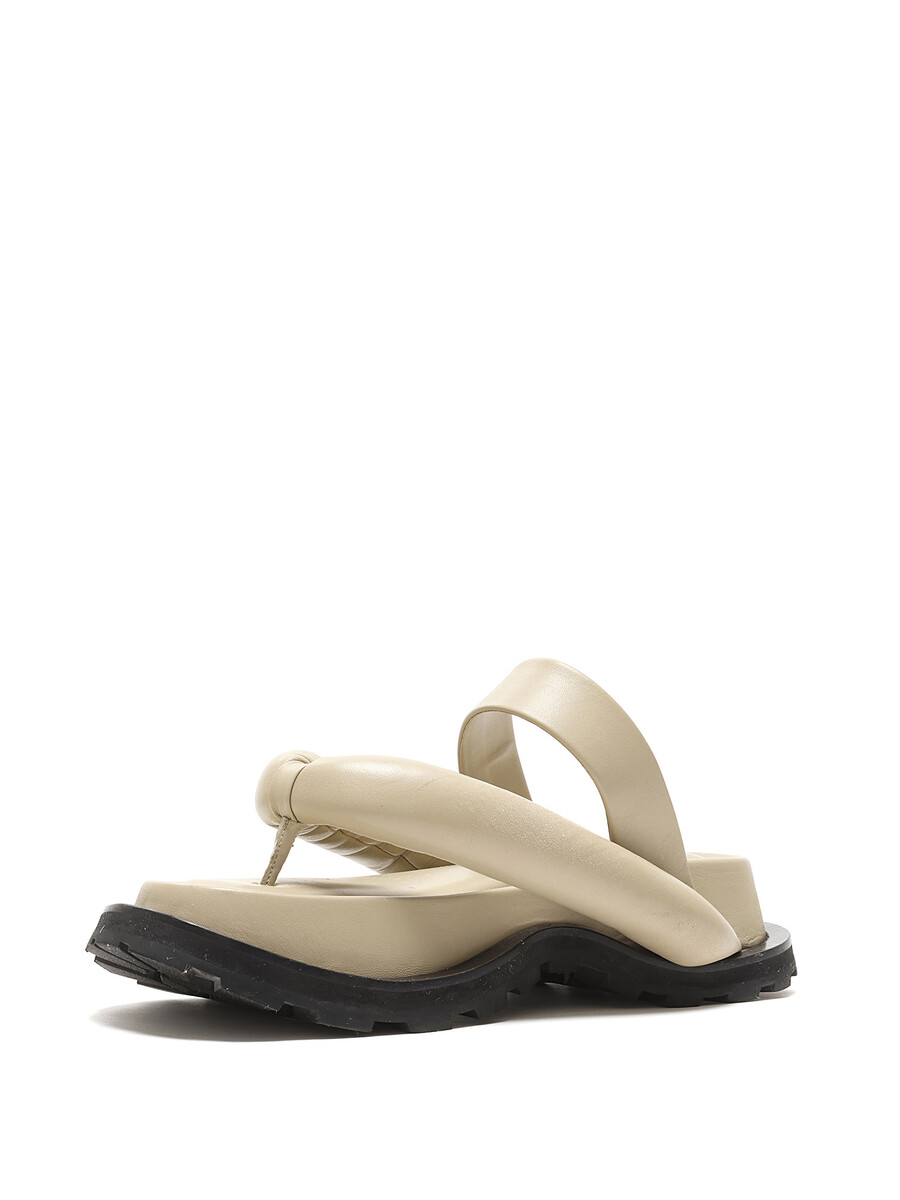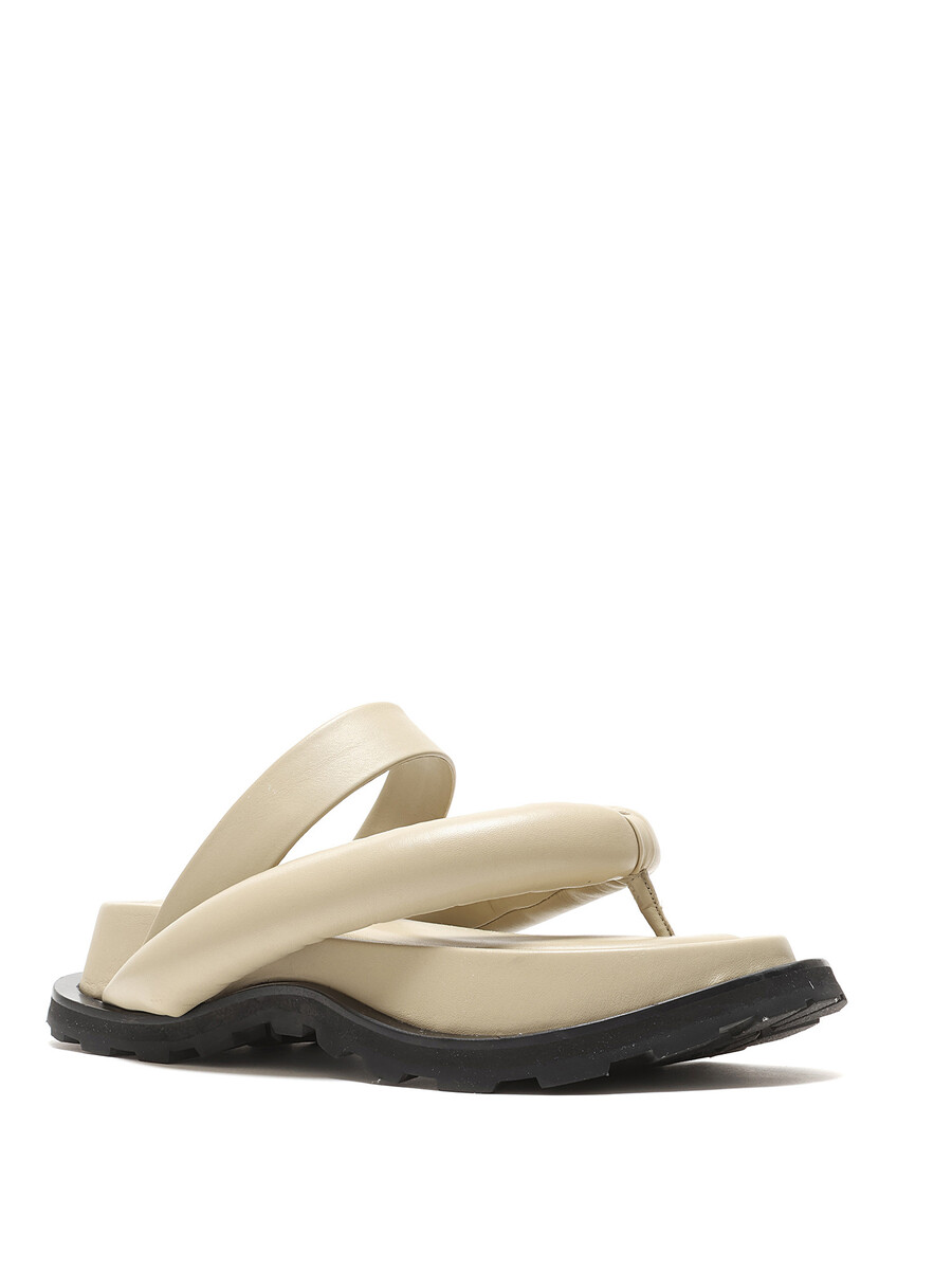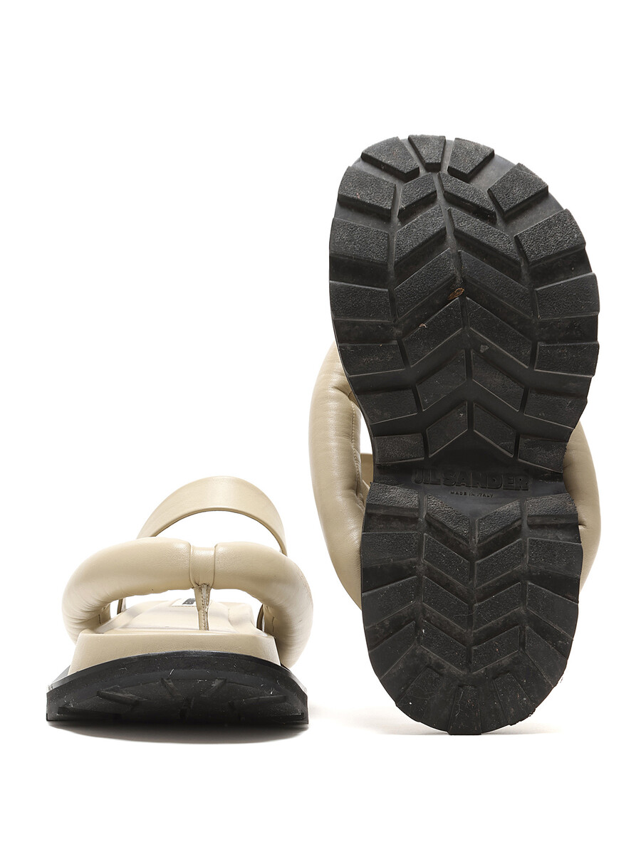 Padded leather sandals featuring a lug sole in taupe. Double strap detail. Open toe style. Comes with box and duster.
