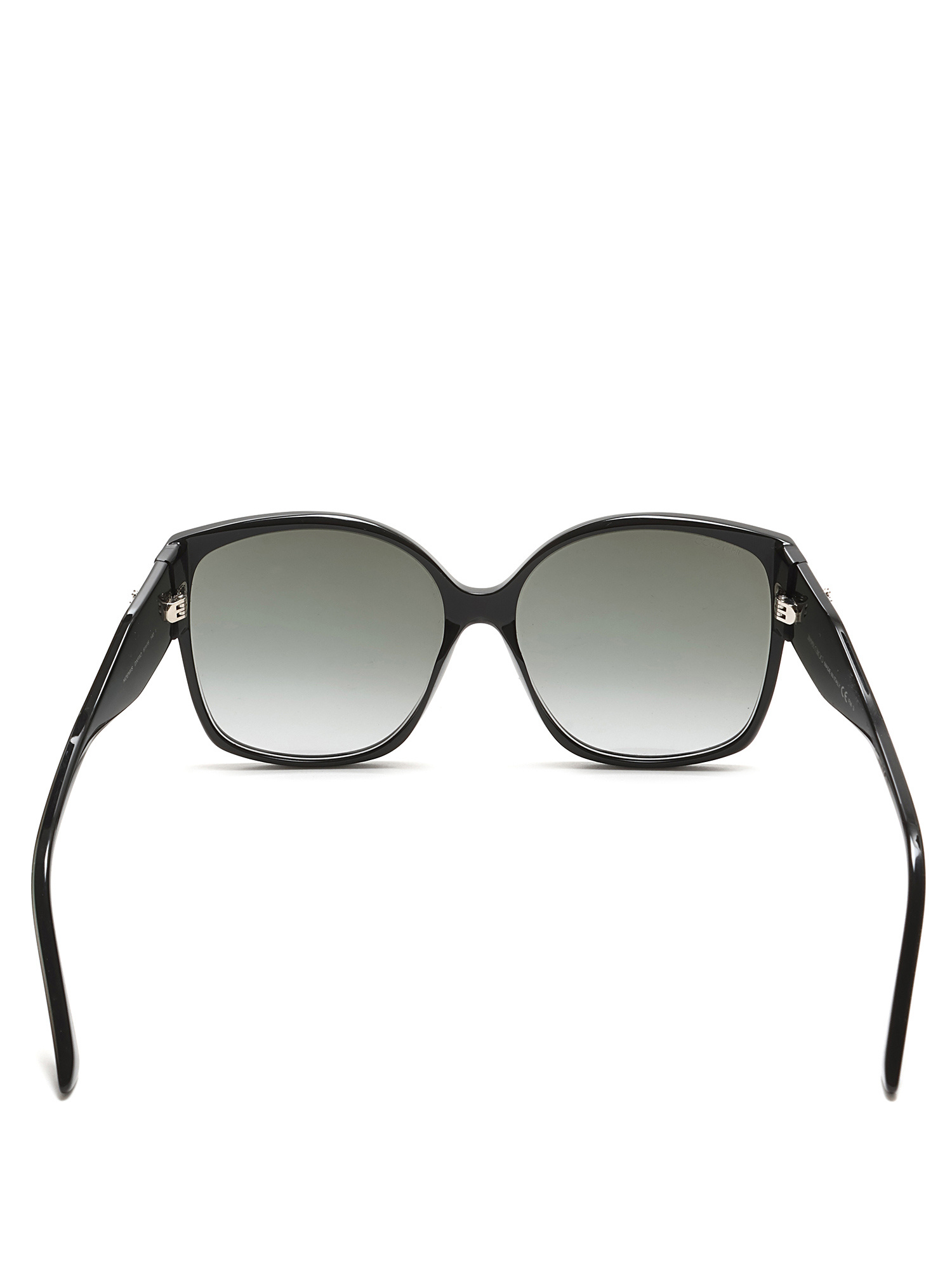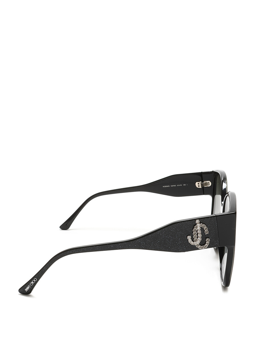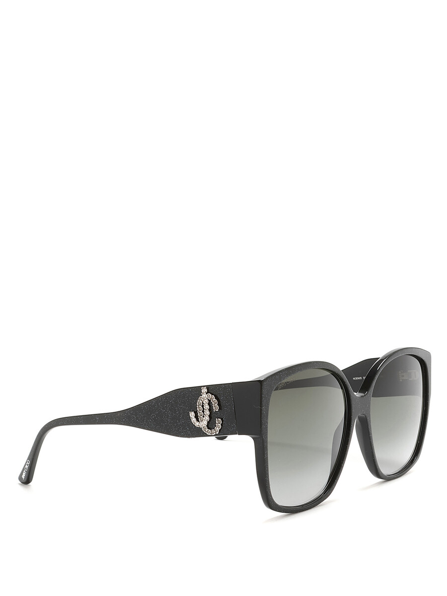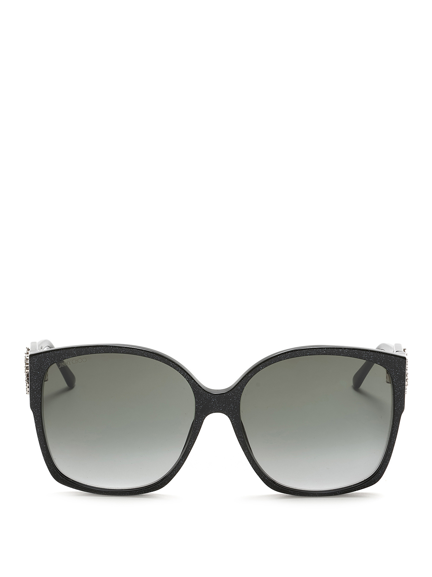 Oversized black acetate sunglasses with silver-tone logo detailing and glitter embellishments on the temples.